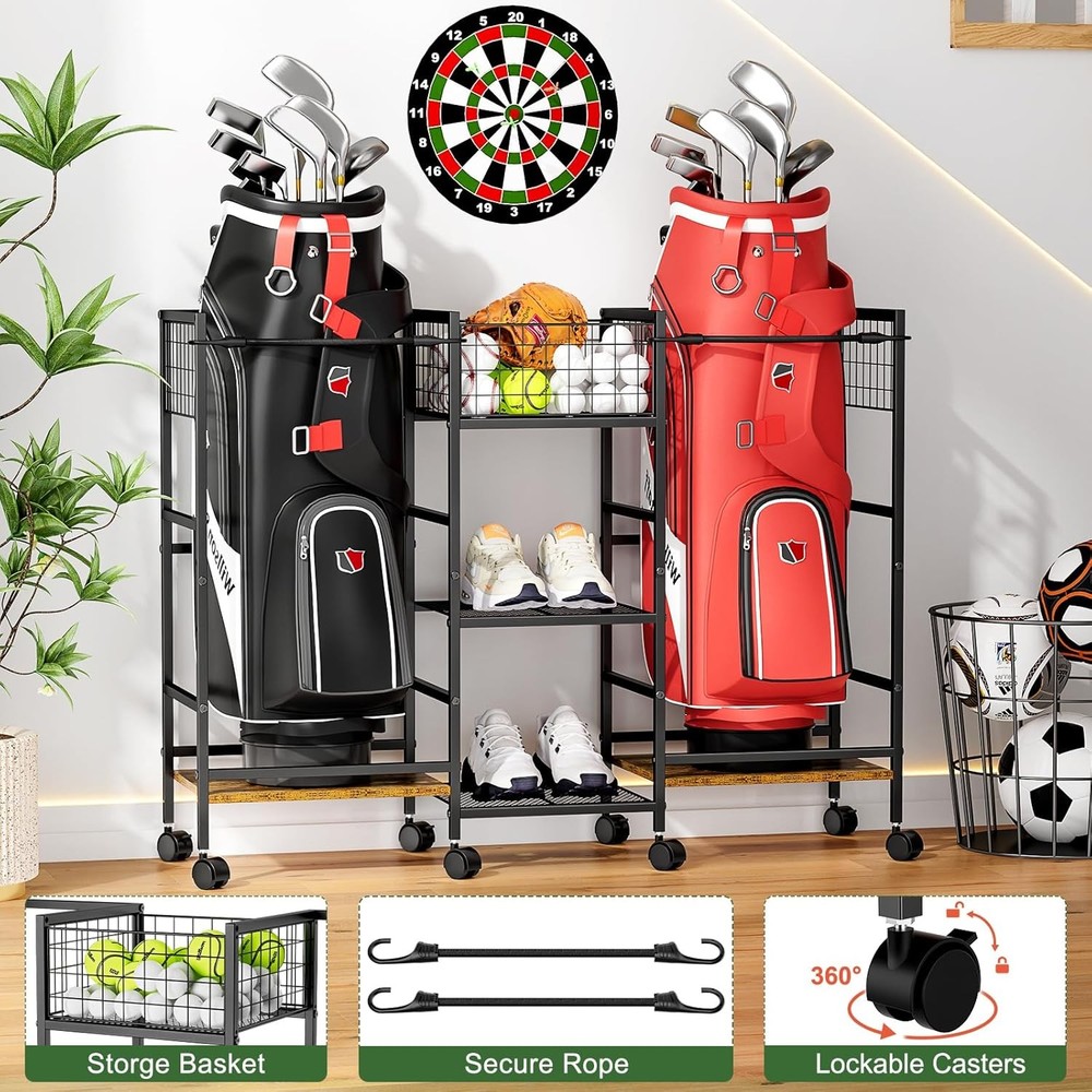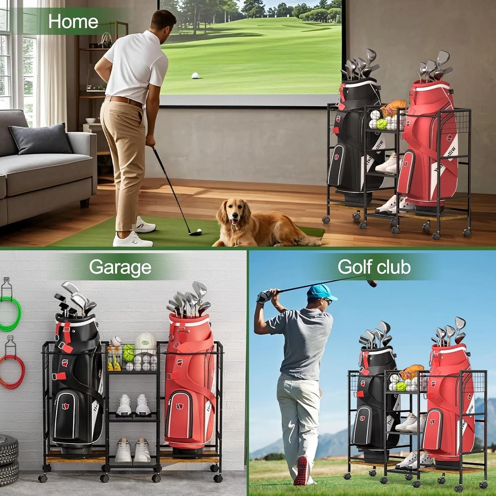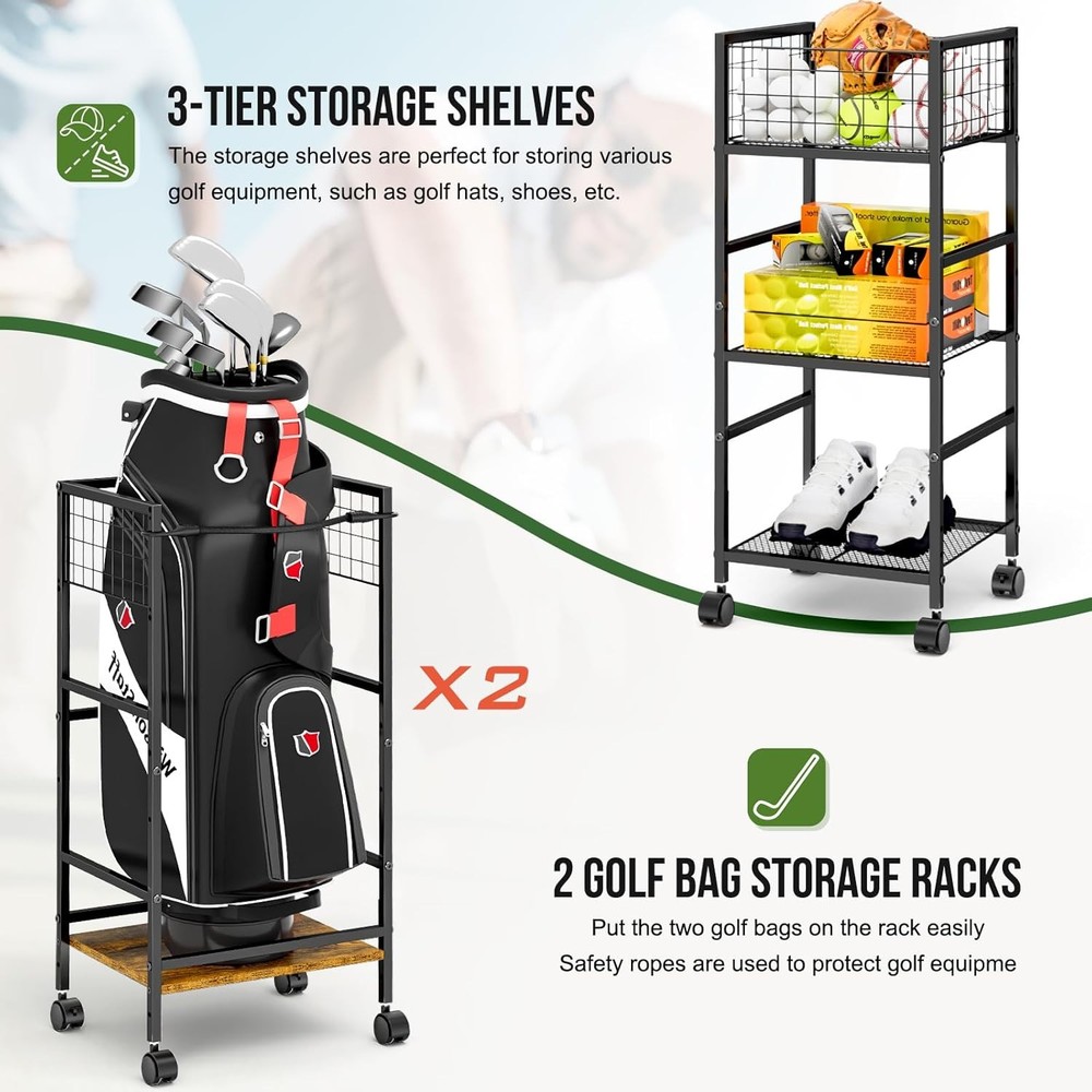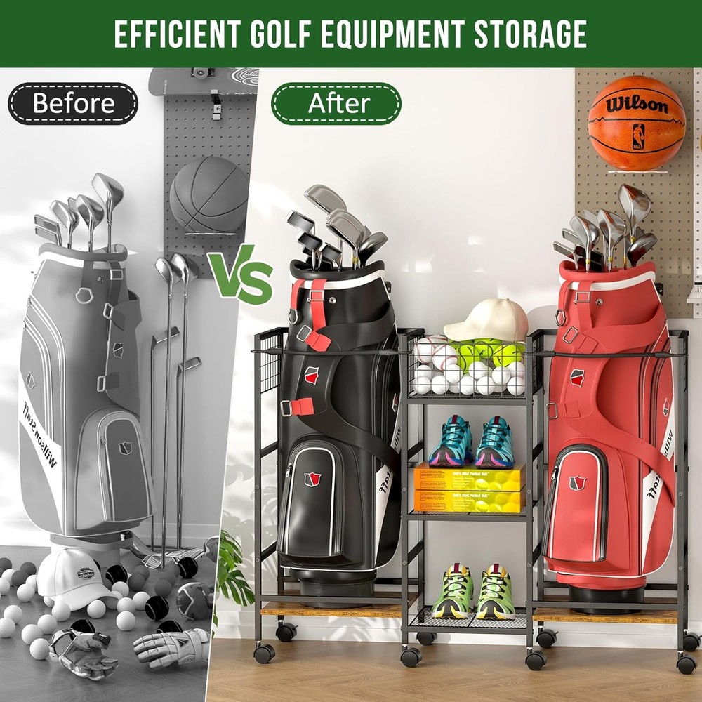 πAll-in-One Golf Storage β Keep Your Gear Organized & Protected Tired of tripping over golf bags and scattered accessories? Our storage rack solves the problem with four dedicated zones designed specifically for golfers. The retractable straps securely hold two standard golf bags in place, while the mesh ball rack keeps your premium balls organized and within reach. Two spacious shelves provide the perfect home for shoes, hats, gloves, and other essentials β everything has its place. No more digging through piles of gear or worrying about damage. π Heavy-Duty Construction That Last Unlike flimsy plastic racks that bend under pressure, our storage system is built to handle serious weight. The reinforced steel frame and premium wood panels support up to 300 pounds β strong enough for multiple loaded bags and accessories. The rust-resistant coating ensures durability, whether you store it in your garage, basement, or even outdoors. πEasy Assembly β No Frustration, Just Results Package includes clear instructions and labeled parts for fast setup. Its functional design and elegant appearance make it a thoughtful gift for golf enthusiasts on birthdays, holidays, or special occasions. π Effortless Mobility with Locking Stability Move your entire golf setup with ease thanks to eight heavy-duty industrial wheels that glide smoothly across any surface. Need to keep it in place? Simply engage the locking switches and the rack stays exactly where you want it. The adjustable feet provide additional stability on uneven floors, ensuring your valuable equipment never tips or falls. Whether you're reorganizing your garage or taking it to the club, this rack goes where you need it. π Premium Protection for Your Valuable Golf Equipment The elastic straps securely hold bags in place, preventing scratches and damage from tipping. Separate side shelves ensure bags never crush each other, while the elevated design keeps everything off the floor. The elegant wood finish looks great in any space, from your garage to your golf club.