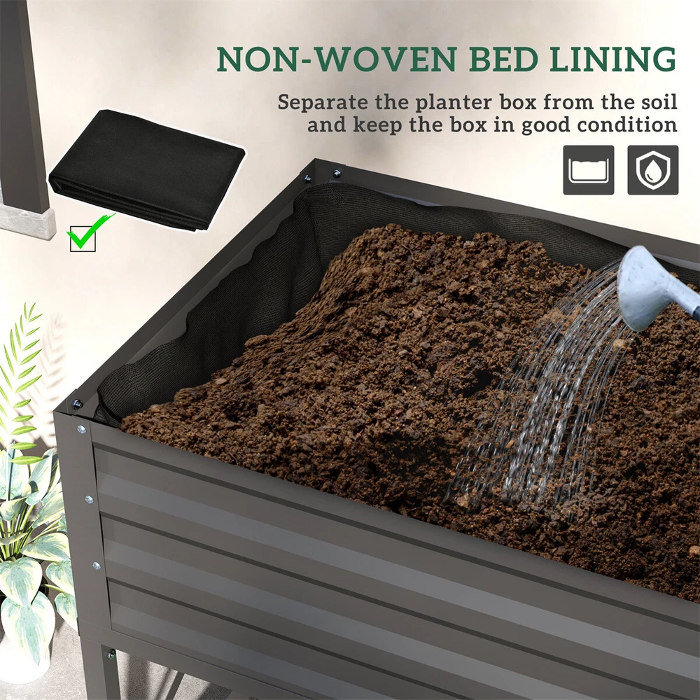 Features: - Elevated design so you don't have to bend down too low, helping to prevent you from straining your body - Made of strong, water-resistant galvanized steel - Storage rack on the bottom for placing garden tools and potted plants - Inner bag made of non-woven fabric provides air permeability - Suitable to place in your yard, patio, balcony, or garden Specification: - Color: Dark Gray - Material: Galvanized Steel - Overall Dimensions: 41.75" L x 21.25" W x 30" H - Interior Planting Dimensions: 41" L x 20.5" W x 10.25" H, 18" H (Bottom to Floor) - Shelf Size: 40.25" L x 20.75" W - Soil Capacity: 37 Gallons - Weight Capacity: 440 lbs. (Planter Box), 22 lbs. (Shelf) Package Includes: - 1 x Raised Planter - 1 x Manual