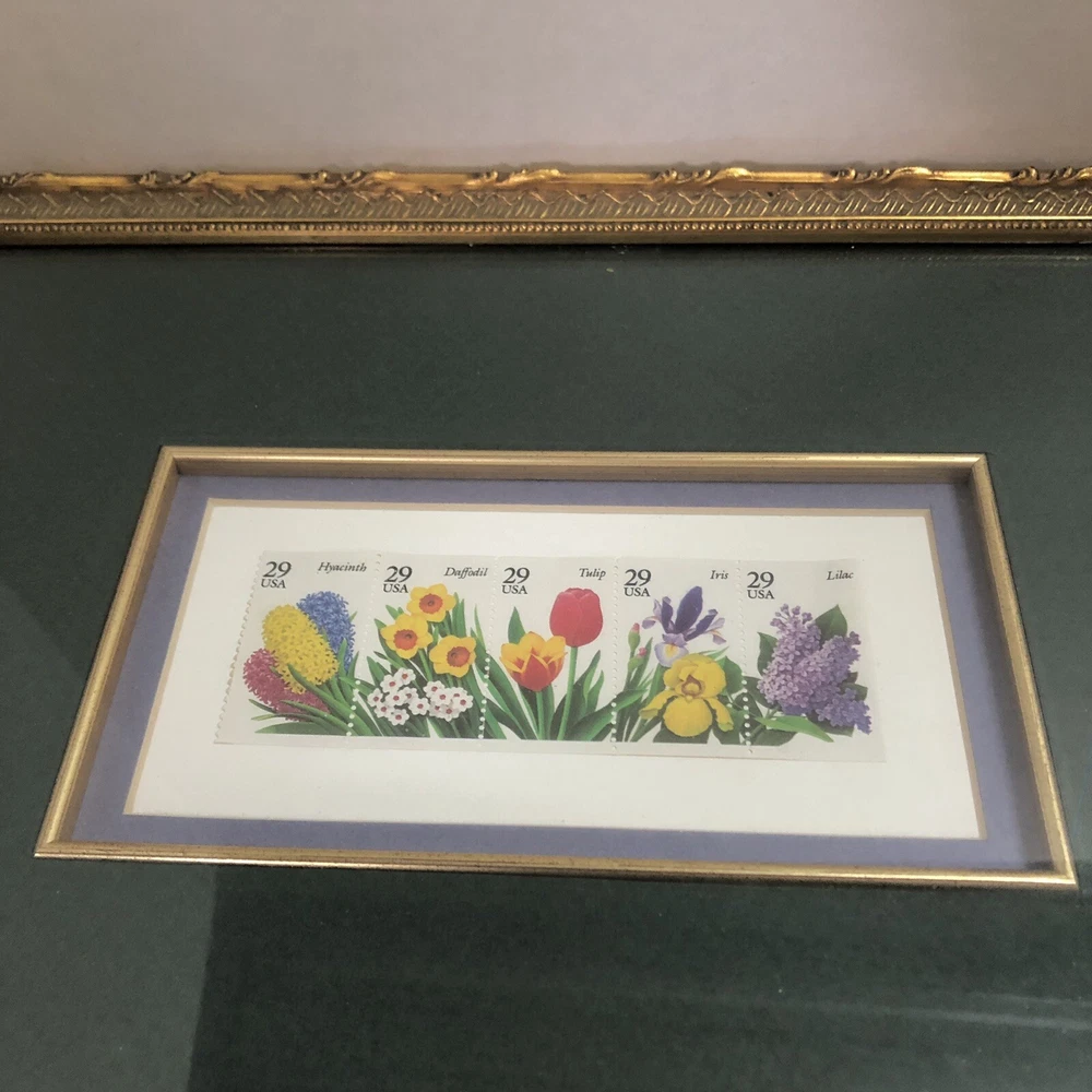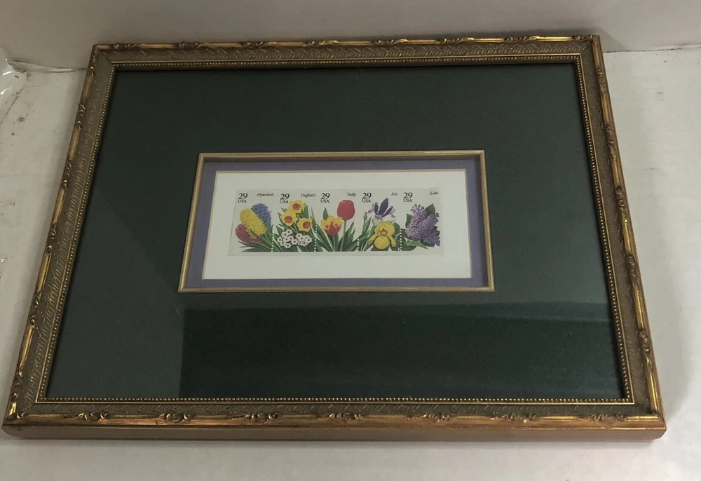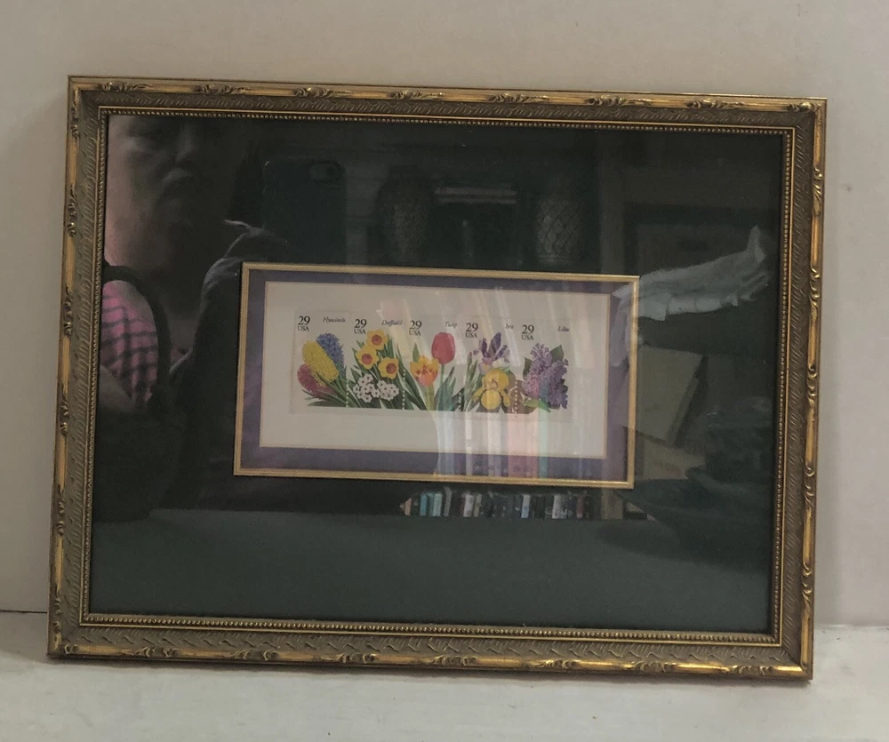Garden Flower Series 1st Installment 1993 US Postage Stamps Gold Ornate Frame professionally matted & framed, .29 stamps HYACINTH, DAFFODIL, TULIP, IRIS, LILAC, these stamps are fromthe Garden Flower Series. Some information below that I found. 'On May 15, 1993, the USPS issued the first installment in the Garden Flower Series, which would honor flowers that bloom in each of the four seasons. Issue Date: May 15, 1993 City: Spokane, WA Printed By: Bureau of Engraving and Printing Printing Method: Lithographed, engraved In very good condition, you may see glare from my photos. The gold gilt ornate picture frame (10 x 13) is very nice as are the stamps displayed.