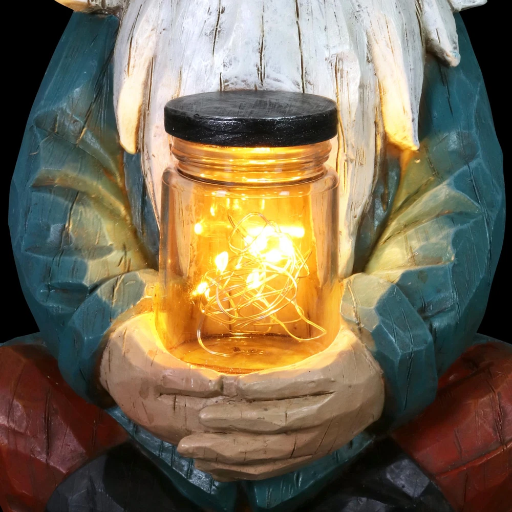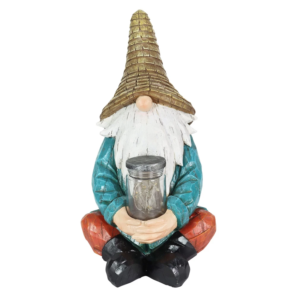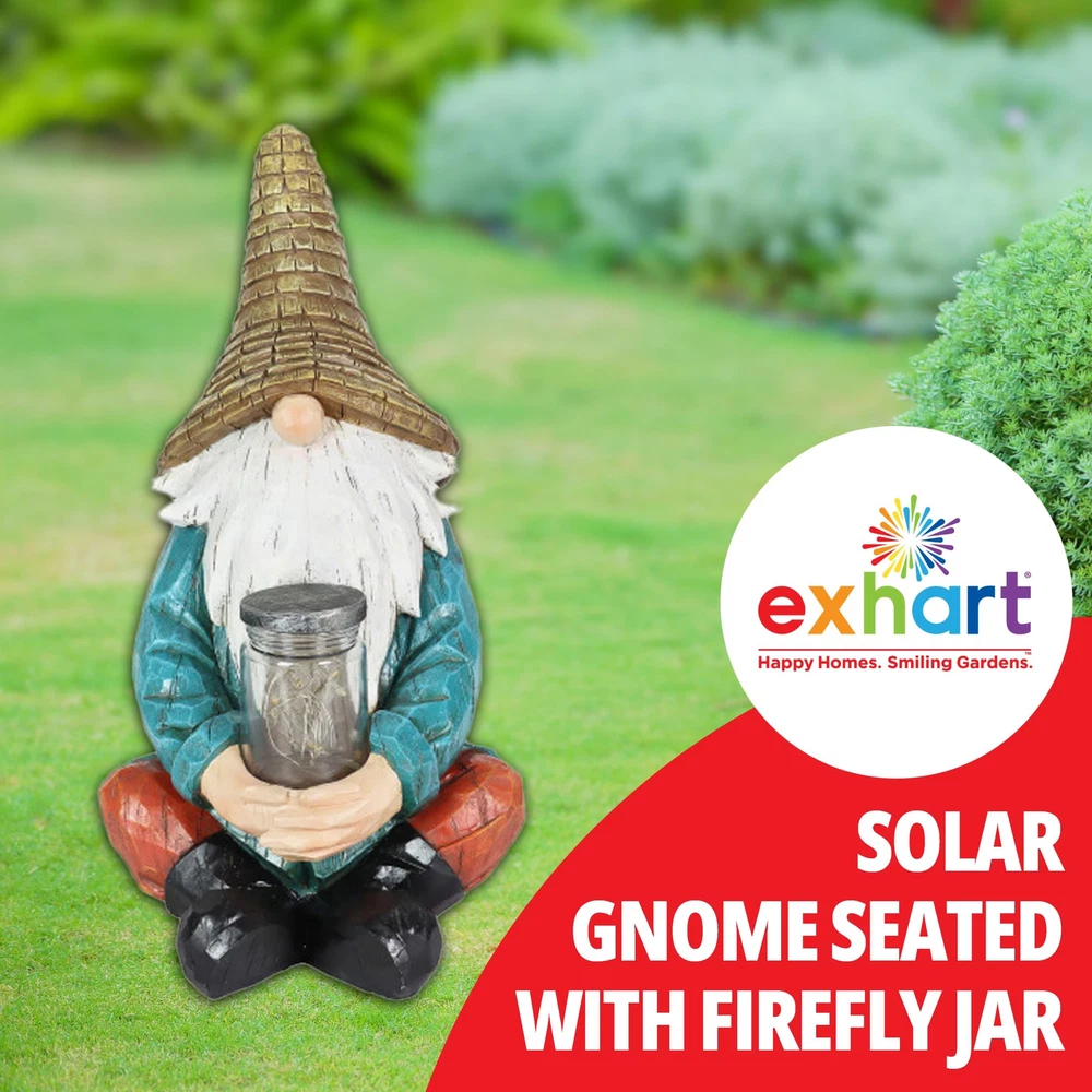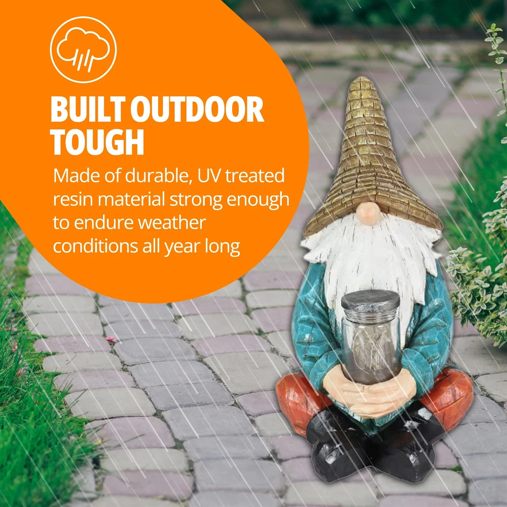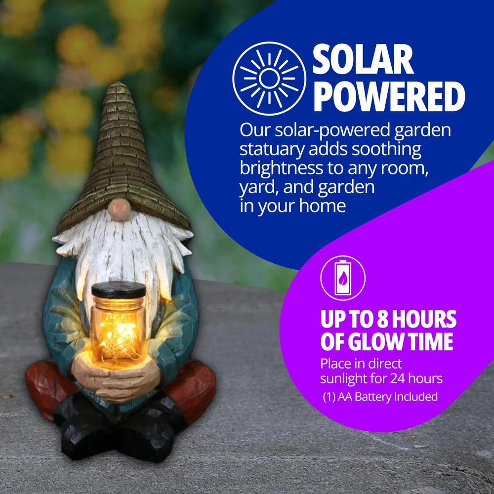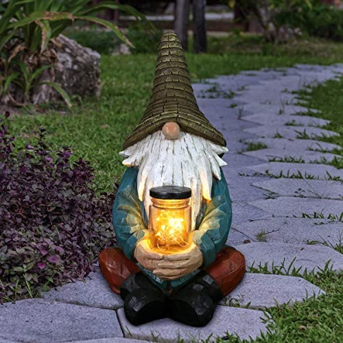 GARDEN GNOME SCULPTURE: Add a touch of whimsical charm to your home garden decor with the Roof Hat Garden Gnome Statuary; featuring meticulous artisan craftmanship and lovingly hand painted, this enchanting and adorable gnome statue features a cute roof style hat and an LED powered glass jar, perfect for adding magical decoration and soothing accent lighting to your home garden, lawn, yard, patio, or front porch area EVERLASTING GLOW: Our garden statues feature a glass jar powered with 8 energy-efficient solar LED fairy string lights, which provide breathtaking illumination as the sun sets and dusk settles in; our garden figurines automatically light up at dusk and are great for adding beautiful accent lighting to your garden plants, patio, porch, yard or path way area **Requires 24 hours of direct sunlight upon first installation** BUILT TO LAST: Our decorative gnome sculptures are constructed with durable resin material to stand up to all of the weather seasons, and the garden gnome figures are UV treated to resist fading, ensuring that these statuaries are built for years of enjoyment GARDEN GIFTS: A garden gift is a great way to introduce someone to the joys of gardening. Garden art is a personal and thoughtful way to show that you care, and yard art makes a superb birthday gift, wedding gift, or office gift idea. Lawn ornaments make great gifts for gardeners who have everything or to keep and cherish for yourself HAPPY HOMES SMILING GARDENS: is a family owned and operated USA based business with over 30 years of experience producing craftsman quality garden art. has become an industry leader by building relationships with people one garden (gnome) at a time. Our passion is to make every garden a work of art