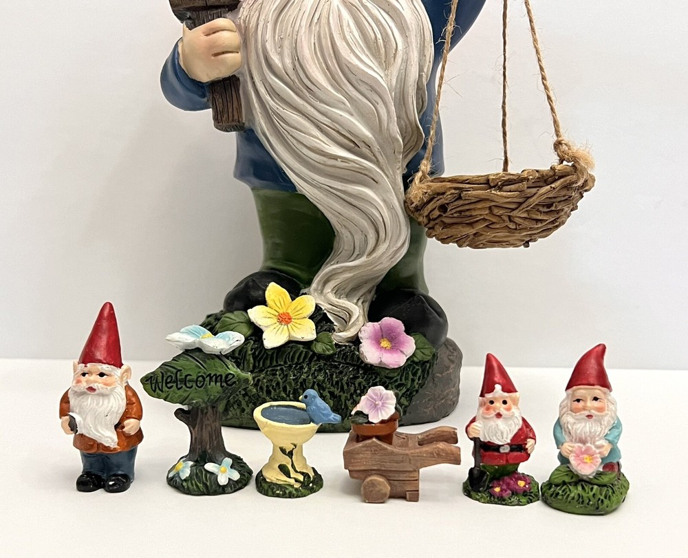 Add a touch of whimsy to your garden with this charming solar-powered Gnome with Basket statue, 3 mini gnomes and 3 garden mini figures With its lifelike and realistic features, this statue is sure to catch the eye of any visitor. The statue is made of a durable and easy-to-care-for combination of plastic, stone powder, and polyresin, making it suitable for both indoor and outdoor use. The medium-sized Gnome statue stands at 11 inches high and features three mini Gnomes figures a set of 7, perfect for garden decor, functional addition to your garden, porch, patio, walkway or any other area you choose to display it. Get this traditional-style Gnome statue with multi-color finish now and add some fun to your garden. Never used listed as used because it does not come with its original box. These are loose figures. Thank you for stopping by!