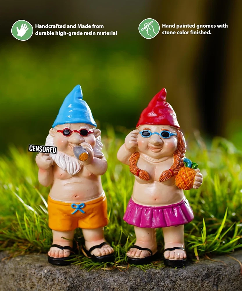 Garden Statues Funny Gnome Figurine- Outdoor Ornaments Sculptures for Lawn Patio Yard Art Decorations 2 Pack Product Details Package Dimensions: 5.79 x 4.96 x 3.54 inches Item Weight: 9.9 ounces Manufacturer: Kodylife Home Country of Origin: China Item model number: Gnome Statue 2Pack Exquisite Home Garden Decor:The pair of Gnome Statues can be used to decorate your garden;patio,etc. and can also be used to decorate your beautiful home. It can be given to lovers;husbands;wives;mothers;fathers;sons;daughters,etc Intricate Details:This New Creative the two Funny Gnome in meditative Position are sure to make your yard look alive! This exquisitely designed garden statue will bring warmth and comfort to the heart.Display the statue outdoor figurine where guests can easily see it—on your patio;garden or porch Perfect Size:The size of the male’s figurine is 1.89x1.77x4.33 inches and the size of female’s figurine is 2.17x1.57x4.33 inches wherever you put him - on the balcony;patio;in the yard;on the lawn or even on a wide window sill High Quality:Hand made by durable poly resin and stone powder construction,our Gnome is rust,weather and UV resistant to keep your statue looking new overtime