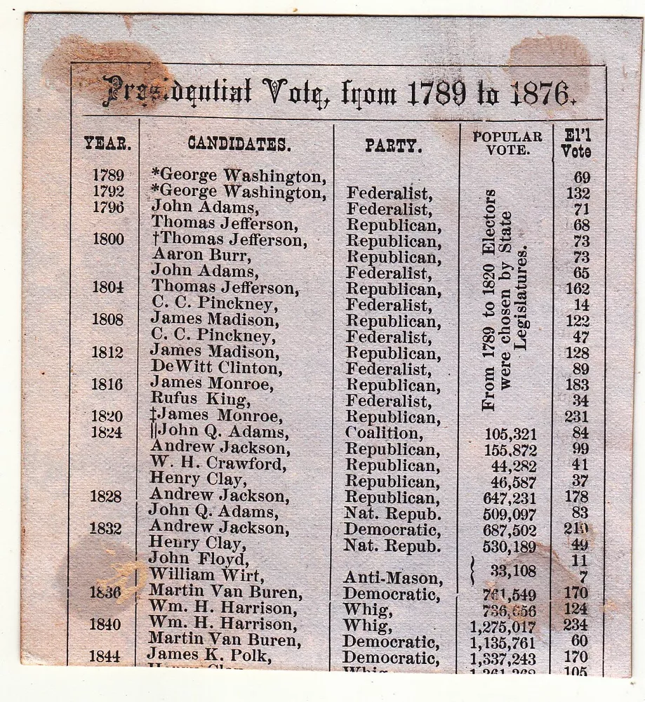 Garfield Presidential Vote from 1789 to 1876 No Advertising Vict Card c1880s