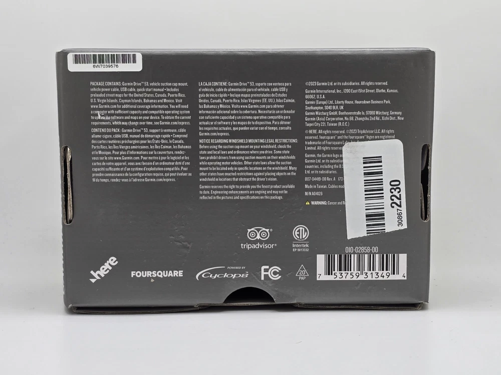 Seller Notes:“Costumer return, powers on but not tested, has signs/scuffs of use, what you see is included.”UPC:753759313494Type:Automotive MountableModel:Garmin GPSBrand:GarminMPN:010-02858-00Screen Size:5"Country/Region of Manufacture:Taiwangtin13:753759313494Features:Car Charger, Map Updates