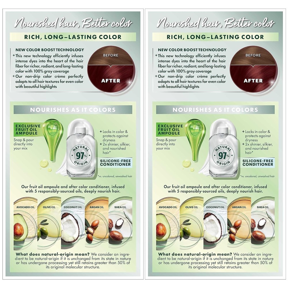 Garnier Hair Color Nutrisse 1 Count (Pack of 2), 66 True Red (Pomegranate) Product Details Is Discontinued By Manufacturer : No Product Dimensions : 2.46 x 6.5 x 6.25 inches; 15.43 ounces UPC : 60 Manufacturer : L'Oreal (Beauty) Color: 66 True Red (Pomegranate) Package Information: Box Product Benefits: Nourishing Brand: Garnier Hair Type: All 66 True Red (Pomegranate) Permanent Hair Dye: Our true red hair dye will add strong red tones and nourish while it colors and adapts to all hair textures for radiant, long lasting, even color and 100% gray coverage Hair Dye Kit: The only hair color with a separate fruit oil ampoule that you snap & pour directly into the mix; Follow hair dye with our after color hair conditioner, infused with a blend of 5 fruit oils: avocado, olive, shea, argan & coconut oil 100% Gray Hair Coverage: Our hair color for gray hair coverage has been formulated with color boost technology, our permanent hair color delivers rich and long-lasting color Nourished Hair Means Better Color: Formulated with a blend of five fruit oils: Avocado, Olive, Coconut, Argan & Shea oils. Lock in moisture and color with our after color mask for hair that is smooth, silky and protected against dryness Discover Your Shade: For bold and lasting shades for all hair textures, Garnier Nutrisse Hair Color is available in over 65 cruelty-free and vegan hair dye shades - formulated without animal-derived ingredients Garnier Nutrisse hair color creme nourishes while you color with avocado, olive, and shea oils. The nourishing color creme enriched with fruit oil concentrate, penetrates deep into hair fibers to nourish and condition your hair so it takes color better and holds it longer, root-to-tip. Garnier Nutrisse delivers rich, radiant, long-lasting hair color with 100% grey coverage. Packaging May Vary