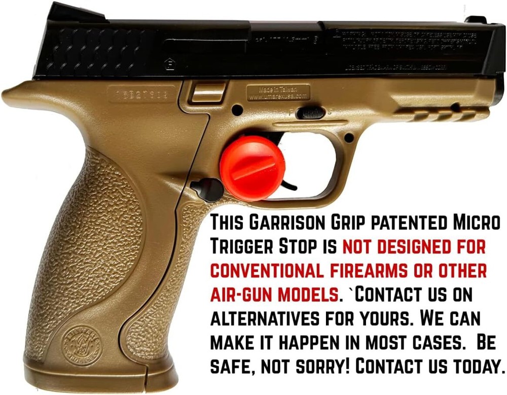 Garrison Grip BB Air Pistol Micro Trigger Stop Holster for Umarex Smith & Wesson M&P 40 Key Features: GARRISON GRIP Patented Micro Trigger Stop : The Adjustable Micro Trigger Stop Holster is placed behind the trigger of your gun to help prevent accidental discharge. The Micro Trigger stop can be used with or without a trigger-mounted laser and can be used for a variety of guns, however each firearm has its own sized trigger stop. FACT: 70% of all semi-auto guns do not have a built-in quick-release safety and 100% of all revolvers do not have a quick-release built-in safety. PATENTED MICRO TRIGGER STOP: This Patented Micro Trigger Stop Holster can buy extra time to retrieve your gun should it get into the hands of a child or inexperienced or reckless adult. You owe it to yourself and others around you to take every precaution to help ensure that the gun will not discharge . THIS PRODUCT IS MANUFACTURED FOR THE MAKE AND MODEL OF YOUR GUN: Do not buy this Micro Trigger Stop if this listing does not show your gun's specific make and model. If you do not see your firearm, make, and model listed, contact the seller for help. He can investigate what Micro Trigger stop will fit your gun, if available. We do not manufacture for all gun models. There are trigger types that do not work with the Micro Trigger Stop. Product Description Unintentional and Accidental Shootings Happening Every Day Gun accidents are more common than anyone would like to think. There are 467,000 YouTube videos of people accidentally shooting themselves with pistols or guns that graphically shows this fact. A good-sized number of these victims would probably wish they used the Micro Trigger Stop if they knew about it. Most semi-autos and all revolvers do not have built-in Switch On/Off Safeties. You owe it to yourself and others around you to take every precaution for self-defense to help ensure that the gun will not discharge accidentally by you, a child or anyone else. Better To Be Safe Than Sorry Even if you have a built-in safety, wouldn't it be smart to have a second line of defense for accidental discharge especially when carrying chambered? This patented product is an uncomplicated design that can help make conceal carry a little safer. The tension adjusting Micro Trigger Stop is designed to be wedged between the back of the trigger and the back of the trigger guard. It is made of a moderately flexible rubber material that has enough flexibility to be pushed out of position with one finger and you are fully functional. If your habit is to carry a gun either un-chambered or chambered for quick response time, the Micro Trigger Stop can be pushed out in less time that it takes to remove the gun from a pocket, holster or purse. You Are Truly The Only Safety The Micro Trigger Stop Holster does not function as an absolute safety. It is only as effective as the user is responsible. This is not in any way considered child safe or humanly infallible. The Buyer must evaluate his or her habits and the way he or she intends to carry and access the gun. I use it and find it to be highly effective in allowing me to feel more comfortable with a chambered gun. How To Operate The Adjustable Micro Trigger Stop How To Use the Patented Micro Trigger Stop: Please make sure the gun is unloaded whenever you are going through this procedure, First, if you place the flat surface behind the trigger when inserting it into the back of the trigger guard, this position of the trigger stop would be the smallest adjustment. If after putting the micro trigger stop in this position, you can still actuate the trigger, place the rounded surface behind the trigger. This would be approximately a 3mm adjustment. If you can still actuate the trigger, you have the wrong trigger stop for your firearm. Please watch the video included in this listing for further instructions.