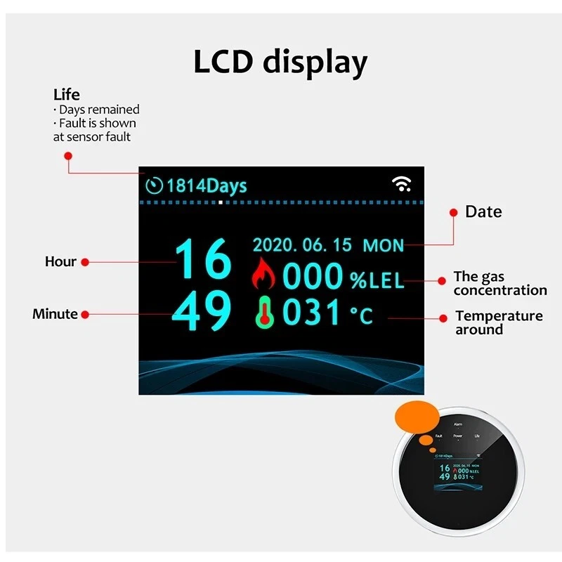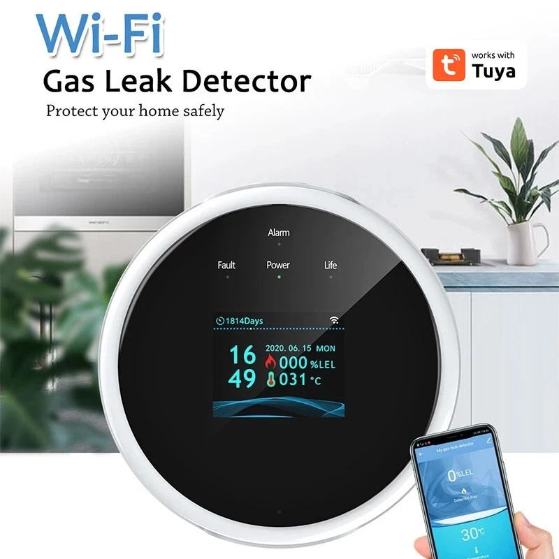 Feature: 1.Detectable Gas:The natural gas leak detector detects the main deadly gases: Natural gas (Methane, butane, ethane, LNG, etc) and Propane (LPG or liquefied petroleum gas). 2.On-site Alarm and APP Remote Alarm:This gas alarm can be connected with mobile phone APP in a wireless environment. After connection, you can always receive the information of the alarm when you go out and once the alarm occurs. 3.High Precision:The has an LCD screen that displays precise, real-time gas readings so that you know the exact gas concentration in the air of your home at all times. 4.Installation Location:This propane alarm has an long 6 foot power cord which allows you to install it in the exact ideal location in your house to allow for proper gas detection. Screw fix or paste installation. 5.Stylish Appearance:This newly released natural gas alarm is sleek and modern and has a beautiful blue LCD screen that will complement the style of your home or camper without detracting from your interior design. Specifications: 【Tuya Smart WiFi GAS LPG Leak Sensor Alarm Fire Security Detector】Detect gas leaks with this smart home sensor for ultimate safety and security. Control it remotely using the Tuya or Smart Life app. 【Smart Home Gas Leak Sensor Alarm with WiFi Support and APP Control】Keep your home safe from gas leaks with this smart sensor. You can easily install it and receive real-time alerts on your phone using the Tuya or Smart Life app. 【Safety Smart Home Leakage Sensor with WiFi and APP Control】Ensure the safety of your home with this smart leakage sensor. It supports WiFi and APP control, providing you with peace of mind and instant notifications in case of any leaks. Package Included: 1*Gas detector 1*USB cable 1*Power plug 1*User Manual