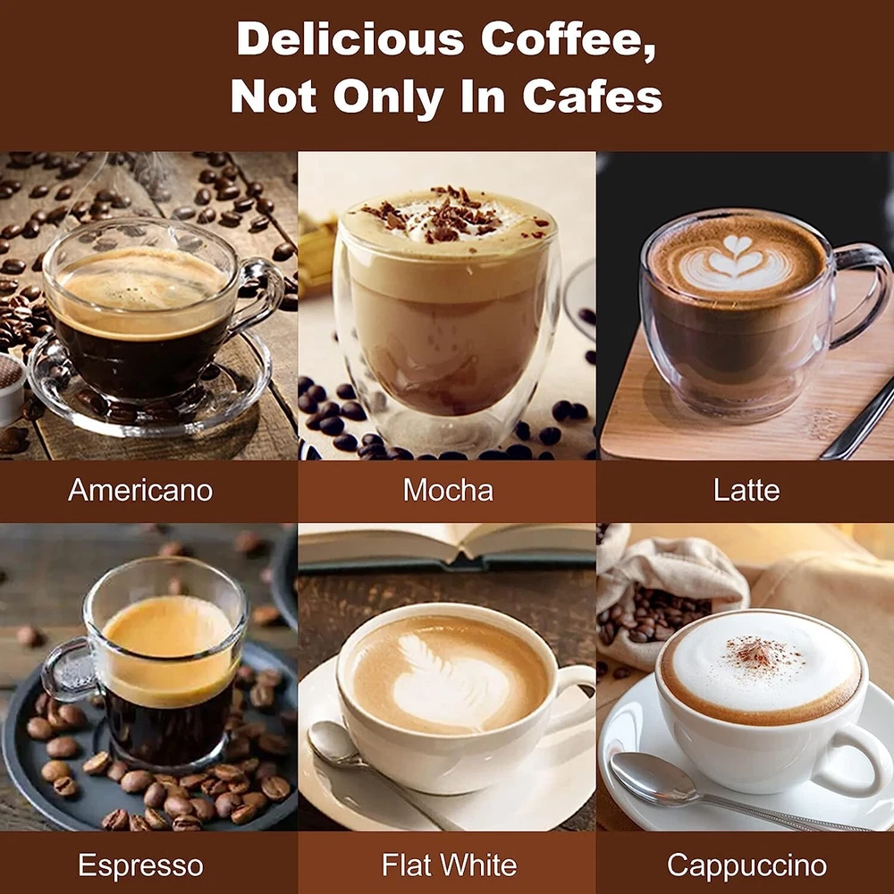 NOTE: Ocaasional water spots or stains found in the recieved product is considered normal, which is due to factory's water flow test, and is not qualified for a return/refund. ☕ 【20 BAR FOR HIGH QUALITY EXTRACTION】 - This espresso machine has a 20 bar high pressure pump that creates nice dense, maximizes the aroma of the coffee beans and the overall quality of the natural oils for maximum extraction of the espresso aroma. ☕【BREWING WITH ESE POD 】The machine comes with a filter for ESE POD espresso capsules and compatibles. Note that some non ESE POD capsules might not work well with our machines.(machine excluding ESE POD). ☕【PROFESSIONAL FROTHING WAND NOZZLE】 Sleek, portable design and the ability to create delicious foam in seconds. This is a reputable frother that creates tiny bubbles for the smoothest, thickest foam for frothy cappuccinos and silky smooth lattes. ☕ 【EXCELLENT TEMPERATURE CONTROL】: With an accurate dual temperature control system, the temperature of water and the taste of milk foam, foam, coffee and milk can be adjusted to achieve the ideal state. ☕ 【FOR BEST TASTE】: One cups of 30ml/ 1oz, about 7g/ 1 spoon powder, Two cups of 60ml/ 2oz, about 14g/ 2 spoons powder for the best concentration.