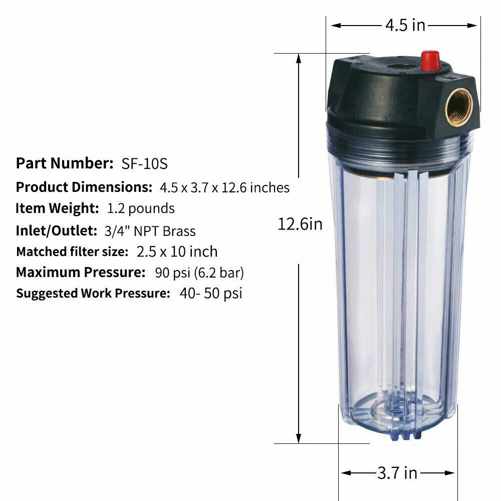 Features: COMPLETE -Complete 1 set 10 inch blue housing,3/4 inch brass ports with pressure relief button for high pressure,with plastic wrench and metal bracket.clear housing allows you to see when you need to change filters and everything else works as it should. STANDARD -Fits all standard sized 2.5 inch x 10 inch filters housing only, filter cartridges are sold separately. APPLICATIONS -Large capacity housing for high flow applications,Used in whole house, reverse osmosis, commercial and geekpure filtration. WARRANTY -Fits NSF standard.One year limited warranty. Specification: Maximum Pressure: 90 psi (6.2 bar) Temperature:40-110°F/5-45°C Shelf life: 5 Years More valuable information: ✪What is dimension of the blue housing? It fits all standard sized 10" housing for 2.5 inch x 10 inch filters . ✪What is in the box? 1x10 inch slim housing with pressure release and 3/4 inch brass NPT port, 1pc plastic wrench ,1pc plastic bracket. ✪What is filters options? 3. PP spun filter , Pack of 4,Remove sand, dirt, sediment. life time:6 months. 4. PP spun filter , Pack of 6,Remove sand, dirt, sediment. life time:6 months. 3. PP Wound String Sediment Filter Cartridge 2.5"x10” ,Pack of 4,Remove sand, dirt, sediment. life time:6 months. 4. Carbon block filter , Pack of 4,Remove chlorine, taste & odors, very fine particulates. life time:6 months. 5. Carbon block filter , Pack of 4,Remove chlorine, taste & odors, very fine particulates. life time:6 months. PS.The Life Time of the Filter Cartridge Depends on Usage Amount and Feed Water Quality. ✪Do you sell similar size housing? Yes, please search in geekpure store on ebay. NOTE 1.This filter housing has a maximum operating pressure rating of 90 psi.If you suspect that your water pressure will at any time exceed 90 psi, a pressure regulator MUST BE INSTALLED before the filter housing.This action will guard against the water pressure exceeding the maximum pressure rating. It is recommended that the pressure regulator be set at 50 psi or less. 2.Maximum Pressure is not max work pressure, it is It's just a momentary test pressure. Clear material can not take so high pressure always, if you can not accept 50 psi work pressure, please choose our white and blue color filter housing ,which material is more stronger.