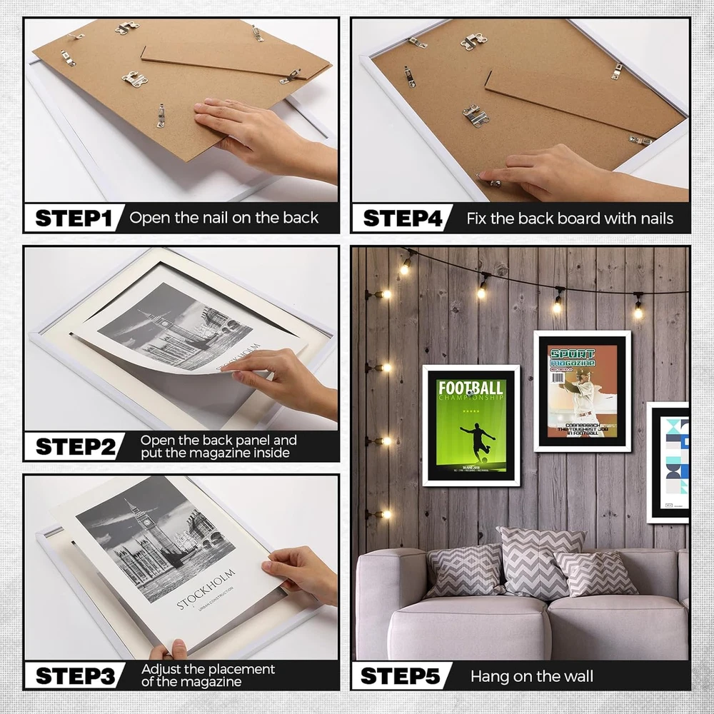 Store New Arrivals Add to Favorite View Feedback Contact Geetery 4 PCS Sports Magazine Frame Fits Magazine Measuring 8.5 X 11.25 Inch Magazine Display Frame with Installed Hangers and Core Matting Plastic Frames for Sports Magazines(White Frame, Black Mat) Description Item model number LEC-Geetery-1471 Style Classic Number of Items 4 Country of Origin China Theme Sports Frame Type as shown Unit Count 4.0 Count Target Audience Unisex Adult Brand Geetery Frame Material Polyvinyl Chloride Finish Type Matte Included Components as shown Item Weight 3.89 pounds Occasion Mother's Day, Grandparents Day Special Feature Foldable Orientation Vertical Mounting Type Tabletop Color White Frame, Black Mat Cover Material Acrylic Shape Rectangular Back Material Type Cardboard Finish types Matte Manufacturer Geetery Product Dimensions 14"L x 11"W Number of pieces 4 Convenient Package: in the package, you receive 4 quality magazine frames; This is ideal for anyone eager to show off a series or a collection of their favorite magazines; Use them to make a coordinated display in hallways, living rooms, bedrooms, offices, or even in cafes and restaurants Suitable Sizing: these magazine frames for wall are designed with dimensions approximately at 11 x 14 inches, acute enough to occupy any space without looking out of place; They are ideally suited for magazines measuring around 8.5 x 11.25 inches; They do not take up unnecessary space while showcasing your favorite features, making them the ideal size for any wall or table display Clear and Engaging Display: thanks to the clear acrylic layer over the magazines, the picture frame represents your items vividly and life like, while also keeping them safe from dust and external breakage, which is safe to use as well; Be it photos, magazines, or certifications, this feature makes you appreciate and reminisce about the moments encapsulated in them better Easy Installation and Stylish Decoration: these picture frame holders come with handy install hangers, making them easy to mount on walls or place on the table, which can be hung vertically or horizontally; Metal picks on the back of the magazine frame that rotate for convenient magazine access; Showcase your style, creativity, and memories in these frames, enhancing your decorations Quality Material: when it comes to displaying your favorite digest, the frames for magazines do not disappoint; They are made of robust PVC material coupled with acrylic layers; These quality materials are known for their durability, ensuring you will be able to enjoy your magazine displays for the foreseeable future; With this material's protection, your magazine's integrity is ensured, preventing tearing, folding, or any other kinds of breakage Product Description Effortless display on desks, shelves, or any flat surface. Hassle-free magazine insertion and removal. Crafted with quality PVC frames and layered with crystal-clear acrylic for a polished and professional look. ABOUT US We offer the best prices around on high quality products. Our E-store includes media such as books, movies, music and games while offering electronics, toys, sporting apparel, clothing, tools, general home, garden items and more. SHIPPING We are always working hard to ensure your package arrives as soon as possible. Please understand that some factors like weather, high postal traffic, and the performance of shipping companies are outside of our control. We offer free shipping to the lower 48 states and ship within 2 business days of payment, usually sooner. We do not accept P.O. Boxes. Please provide a physical address. RETURNS We offer a 30-Day Return Policy on items which you are not completely satisfied with. You have the option for a full-refund or an exchange of the item. No returns are available on items shipped outside of the USA. PAYMENT We accept PayPal. CONTACT US This page content is yet to come Please ad us to your favorite seller and visit again later Thank You CUSTOMER SATISFACTION We try our very best to make sure every customer is completely satisfied. If there's a problem, message us! We're happy to help.