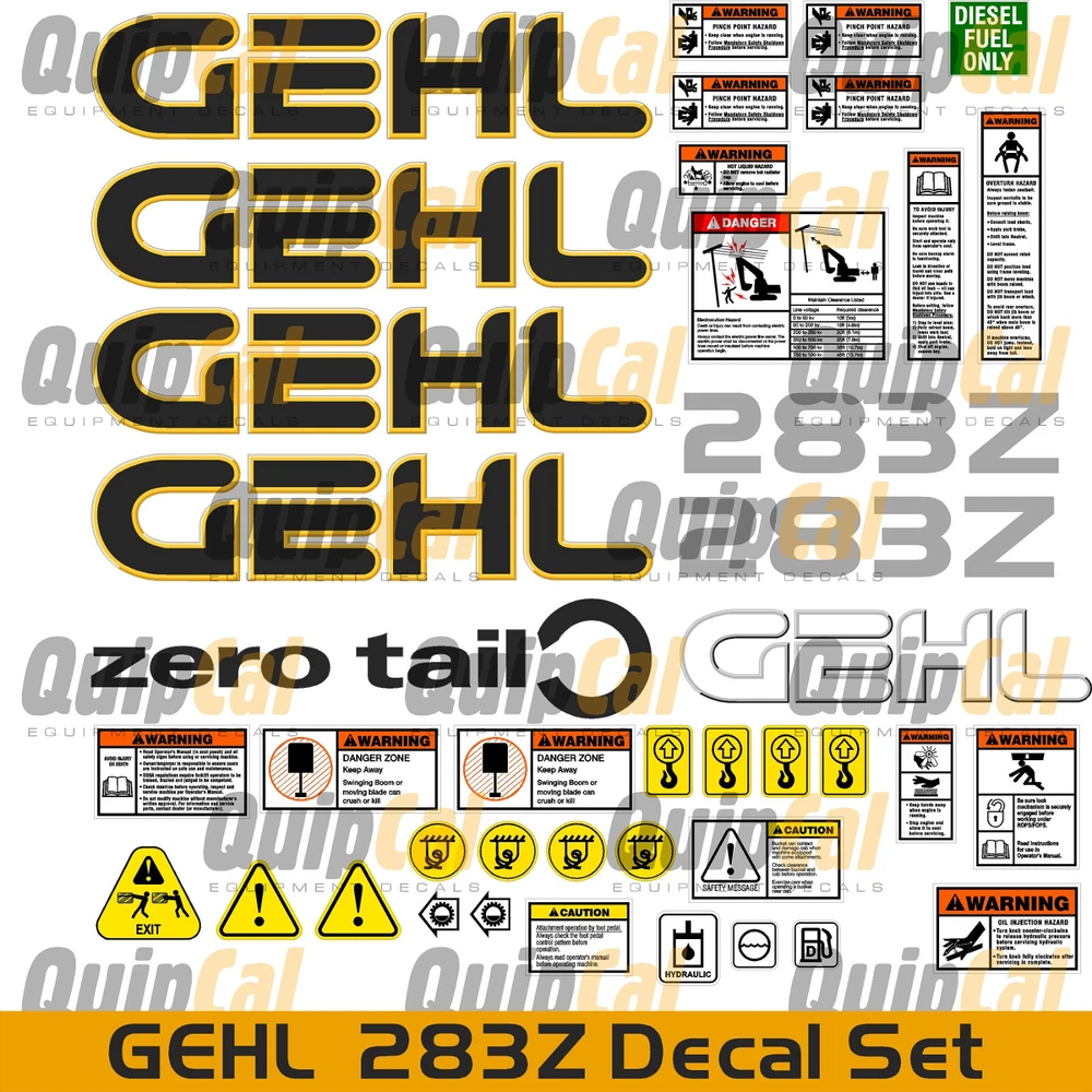 This listing is for: 1 Gehl 283Z Excavator Decal Set with Warning Decals. Other Gehl Excavator and Skid Loader Sets Available. Contact us today to receive a prompt quote on any Gehl or Mustang decals you need. We have decal packages for Gehl Contruction and Agricultural Equipment as well as decals for early and late model Mustang machines. We're Quipcal, the Equipment Decal Experts. When you think "Decals" we want you to think "Quipcal" first. Contact us for the decal set you YOU need. We're Quipcal...The Equipment Decal Experts, with 40 years of decal experience, 14,000 + decal sets in our digital inventory, 4.000+ additional safety decal sets, with decals covering machines from the 1930s through 2022 and an every expanding inventory. We're creating new sets every week. Count on us to provide: Prompt, Knowledgeable, Reliable and Experienced Assistance with your order. Capability to design / produce hard to find or discontinued decals / sets We serve Dealers, Contractors, Auction Companies, Repair and Paint Shops, Farms and Ranches, Forestry and Timber Companies, Mines and Quarries and countless private owners in all 50 states, and around the world. HOW CAN WE HELP YOU TODAY? Your Next Decal Set is Here!