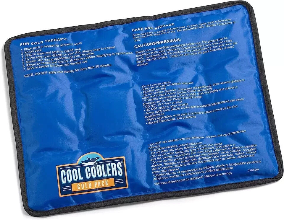 Gel Ice Pack Standard and Flexible Large 11"x 14.5” Reusable Cold Compress 1-Pc Age Range (Description) Adult Number of Items 1 Unit Count 1 Count Special Feature Flexible, Reusable About this item COLD THERAPY PAIN RELIEF: Measuring at 15" x 11" to offer large soothing coverage on back, shoulders, and legs. Reusable gel ice pack delivers immediate cold therapy pain relief that is perfect for soothing sore muscles, bruising, swelling and recovery. EASY-TO-USE: Simply place the ice pack in the freezer for at least 2 hours, knead pack, wrap the ice pack with a towel and apply directly to injury for instant pain relief. Apply cold therapy for no more than 20 minutes and continue to store in freezer between uses. ENDLESSLY VERSATILE: Packing a lunch for work? No sweat! Pack one (or more!) in your insulated lunch bag, lunch box, baby bag, or picnic tote to keep items extra cold -- and colorful. Unlike regular ice that inevitably melts over time, these slim freezer packs were designed to keep your salads crisp and sodas cold without the mess of regular ice. For best results, stack multiple ice packs at the top and sides of your insulated bag! SAFE AND NON-TOXIC: Built with BPA-free plastic and leakproof protection, the compact Cool Coolers reusable slim ice packs have a durable design that is break-resistant to withstand the toughest tumbles. They're non-toxic and safe to pack with unpackaged food! Easy to clean: simply rinse off and pat dry. COOL COOLERS BY FIT + FRESH: Redefining the meaning of "cool", the Cool Coolers brand is the most trusted reusable ice brand for its groundbreaking line of dynamic ice packs! Available in multiple sizes, colors, materials, and shapes, Cool Coolers is undoubtedly the best of the best for your insulated bags! Age Range (Description) Adult Number of Items 1 Unit Count 1 Count Special Feature Flexible, Reusable About this item ---COLD THERAPY PAIN RELIEF: Measuring at 15" x 11" to offer large soothing coverage on back, shoulders, and legs. Reusable gel ice pack delivers immediate cold therapy pain relief that is perfect for soothing sore muscles, bruising, swelling and recovery. ---EASY-TO-USE: Simply place the ice pack in the freezer for at least 2 hours, knead pack, wrap the ice pack with a towel and apply directly to injury for instant pain relief. Apply cold therapy for no more than 20 minutes and continue to store in freezer between uses. ---ENDLESSLY VERSATILE: Packing a lunch for work? No sweat! Pack one (or more!) in your insulated lunch bag, lunch box, baby bag, or picnic tote to keep items extra cold -- and colorful. Unlike regular ice that inevitably melts over time, these slim freezer packs were designed to keep your salads crisp and sodas cold without the mess of regular ice. For best results, stack multiple ice packs at the top and sides of your insulated bag! ---SAFE AND NON-TOXIC: Built with BPA-free plastic and leakproof protection, the compact Cool Coolers reusable slim ice packs have a durable design that is break-resistant to withstand the toughest tumbles. They're non-toxic and safe to pack with unpackaged food! Easy to clean: simply rinse off and pat dry. ---COOL COOLERS BY FIT + FRESH: Redefining the meaning of "cool", the Cool Coolers brand is the most trusted reusable ice brand for its groundbreaking line of dynamic ice packs! Available in multiple sizes, colors, materials, and shapes, Cool Coolers is undoubtedly the best of the best for your insulated bags! Gel Ice Pack Standard and Flexible Large 11"x 14.5” Reusable Cold Compress 1-Pc Age Range (Description) Adult Number of Items 1 Unit Count 1 Count Special Feature Flexible, Reusable About this item COLD THERAPY PAIN RELIEF: Measuring at 15" x 11" to offer large soothing coverage on back, shoulders, and legs. Reusable gel ice pack delivers immediate cold therapy pain relief that is perfect for soothing sore muscles, bruising, swelling and recovery. EASY-TO-USE: Simply place the ice pack in the freezer for at least 2 hours, knead pack, wrap the ice pack with a towel and apply directly to injury for instant pain relief. Apply cold therapy for no more than 20 minutes and continue to store in freezer between uses. ENDLESSLY VERSATILE: Packing a lunch for work? No sweat! Pack one (or more!) in your insulated lunch bag, lunch box, baby bag, or picnic tote to keep items extra cold -- and colorful. Unlike regular ice that inevitably melts over time, these slim freezer packs were designed to keep your salads crisp and sodas cold without the mess of regular ice. For best results, stack multiple ice packs at the top and sides of your insulated bag! SAFE AND NON-TOXIC: Built with BPA-free plastic and leakproof protection, the compact Cool Coolers reusable slim ice packs have a durable design that is break-resistant to withstand the toughest tumbles. They're non-toxic and safe to pack with unpackaged food! Easy to clean: simply rinse off and pat dry. COOL COOLERS BY FIT + FRESH: Redefining the meaning of "cool", the Cool Coolers brand is the most trusted reusable ice brand for its groundbreaking line of dynamic ice packs! Available in multiple sizes, colors, materials, and shapes, Cool Coolers is undoubtedly the best of the best for your insulated bags! Age Range (Description) Adult Number of Items 1 Unit Count 1 Count Special Feature Flexible, Reusable About this item COLD THERAPY PAIN RELIEF: Measuring at 15" x 11" to offer large soothing coverage on back, shoulders, and legs. Reusable gel ice pack delivers immediate cold therapy pain relief that is perfect for soothing sore muscles, bruising, swelling and recovery. EASY-TO-USE: Simply place the ice pack in the freezer for at least 2 hours, knead pack, wrap the ice pack with a towel and apply directly to injury for instant pain relief. Apply cold therapy for no more than 20 minutes and continue to store in freezer between uses. ENDLESSLY VERSATILE: Packing a lunch for work? No sweat! Pack one (or more!) in your insulated lunch bag, lunch 