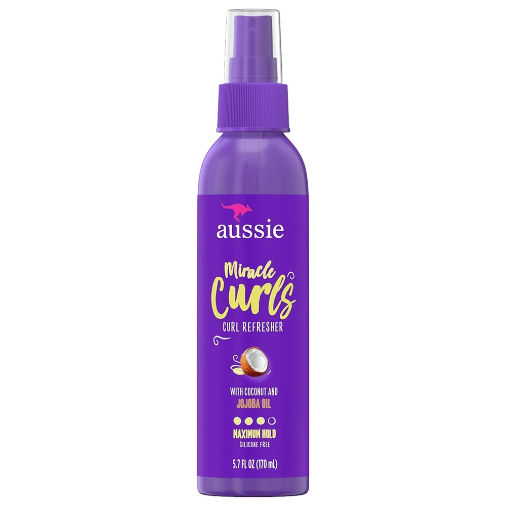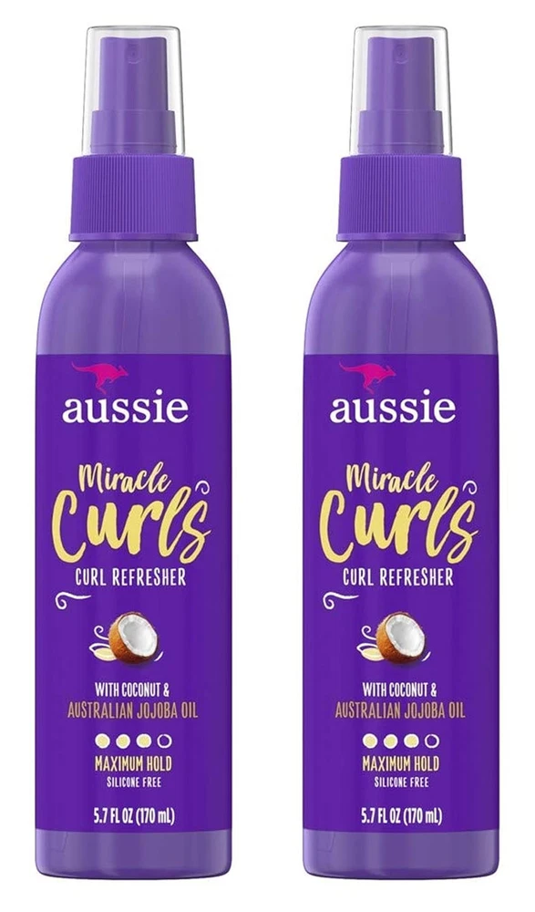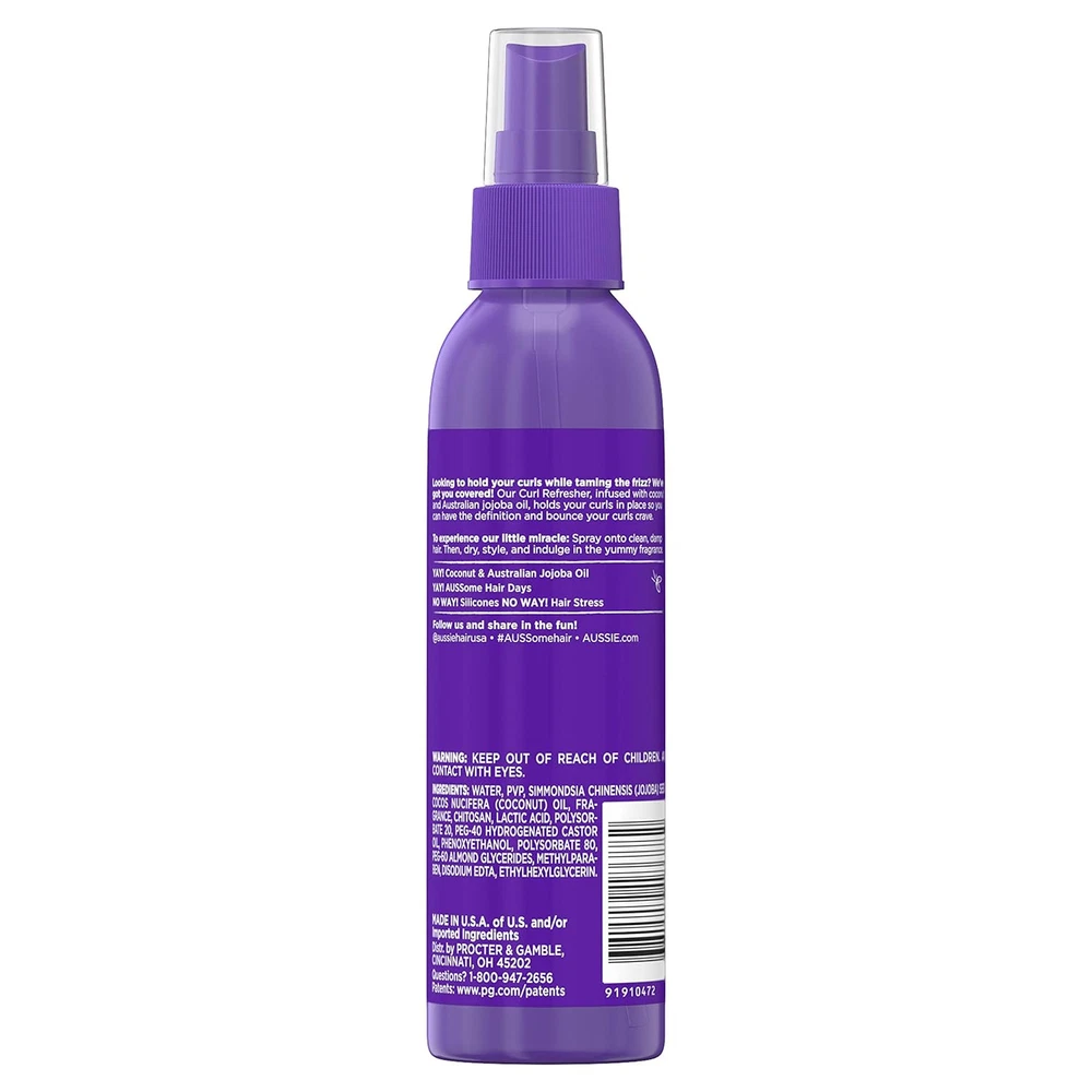 Product Description Aussie Miracle Curls Curl Refresher Spray Gel, Max Hold, with Coconut & Jojoba Oil, 5.7 Fl Oz (Pack Of 1) HOLD THE CURL. So you were blessed with coils, but also the frizz that comes with them? No worries! Tame your mane, not your style, with Aussie Miracle Curls Curl Refresher Spray Gel. Silicone free and infused with coconut and jojoba oil, this spray gel holds your curls in place while eliminating frizz for that bounce, definition and oo-la-la-ness your locks deserve. PERFECT FOR frizzy, curly hair Frizzy and dry curls crying out for a miracle? Miracle Curls Curl-Defining oil treatment, infused with coconut and jojoba oil, instantly absorbs into hair and seals cuticles to lock in hydration, reduce frizz and add shine. This paraben-free, rich formula will give your curls the softness they crave!. PERFECT FOR frizzy, curly hair FREE OF silicones & worries INFUSED WITH coconut & jojoba oil SMELLS LIKE breezy pineapple, papaya & sun-kissed white flowers USE IT TO hold curls and tame frizz Coconut & Australian jojoba oil. Free of silicones and hair stress. Perfect for curly hair. Ingredients Nucifera (Coconut) Oil, Fragrance, Chitosan, Lactic Acid, Polysorbate 20, PEG-40 Hydrogenated Castor Oil, Phenoxyethanol, Polysorbate 80, PEG-60 Almond Glycerides, Methylparaben, Disodium EDTA, Ethylhexylglycerin