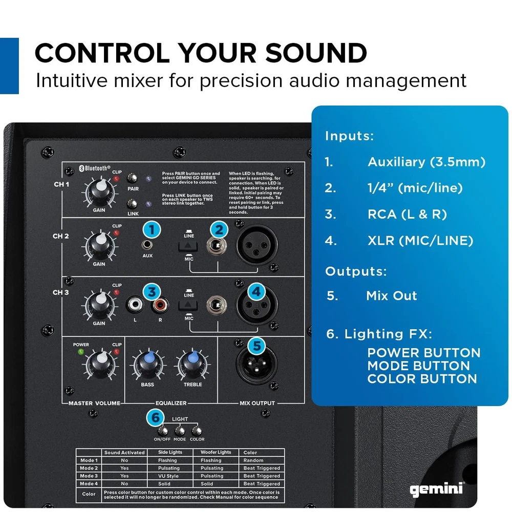 Unleash unparalleled audio performance with the Gemini Sound GD-215PRO and GD-L215PRO, the ultimate professional PA speakers designed to elevate your events, parties, and performances. These powerful, Bluetooth-enabled speakers boast an impressive 1300-watt peak power output, driven by enhanced Class-D amplifiers that deliver deep, resonant bass through 15-inch subwoofers and crisp highs from 1.35-inch titanium tweeters. Whether you're a DJ, an event organizer, or a music enthusiast, these speakers are perfect for any occasion, from intimate gatherings to large-scale events. The GD-215PRO is engineered for durability and adaptability, featuring ergonomic handles for easy transport and versatile mounting options to ensure optimal sound dispersion in any setting. This speaker's 3-channel mixer provides precise control over your audio with dedicated gain knobs, clip lights, and switchable Mic/Line inputs. Experience the convenience of wireless music streaming with Bluetooth connectivity and True Wireless Stereo (TWS) linking, allowing you to pair with another GD Series speaker for an expansive, cable-free sound system. Step up your game with the GD-L215PRO, which not only offers the same high-quality audio features as the GD-215PRO but also includes dynamic LED Party Lighting FX. These vibrant lights transform any venue into a captivating dance floor, making it the perfect choice for parties and events where visual appeal is just as important as sound quality. With six lighting modes that react to your music, the GD-L215PRO ensures an unforgettable experience for your audience. Both models are built to withstand the rigors of frequent use and transport, featuring a robust, impact-resistant cabinet. They offer multiple inputs, including XLR, RCA, and 1/8" for diverse connectivity options, and an onboard equalizer for complete sound control. Whether you're setting up a sound system for a church, a studio, or an outdoor PA system, these speakers provide the flexibility and power you need. Designed for the discerning audio professional and the passionate enthusiast alike, these speakers cater to a wide range of applications. From DJ equipment and studio speakers for music production to portable PA systems for bands and big party speakers, the GD-215PRO and GD-L215PRO deliver exceptional performance. The integrated Bluetooth technology with TWS linking allows for seamless wireless audio playback, making them ideal for any wireless speaker system setup. For DJs and performers, the GD-215PRO and GD-L215PRO offer a professional-grade sound system that can handle the demands of live performances and DJ sets. The powerful 15-inch subwoofers and precise high-frequency drivers ensure your music sounds clear and impactful, whether you're using them as part of a larger DJ system or as standalone loudspeakers. Optimize your sound setup with these versatile PA speakers, which are perfect for everything from intimate indoor venues to large outdoor events. The GD-215PRO and GD-L215PRO are your go-to solutions for reliable, high-quality audio performance, providing the ultimate in power, clarity, and convenience. Elevate your audio experience with Gemini Sound β where unmatched audio meets professional-grade performance and captivating lighting effects. PREMIUM SOUND AND LED SHOW: Immerse yourself in the rich, high-fidelity sound of our powerful speaker, equipped with a 15-inch woofer and a 1.35-inch titanium tweeter. The built-in LED party lighting, with adjustable effects, transforms any space into a vibrant dance floor, making it the ultimate party speaker. π£ DYNAMIC AUDIO POWER: Experience the clarity and depth of your music like never before with 1300 watts of peak power. This speaker is perfect for energizing any crowd, from intimate gatherings to large outdoor events, providing clear, powerful sound across all frequencies. π£ STREAMING MADE SIMPLE: Effortlessly connect and stream your favorite tracks with Bluetooth technology. This feature, along with True Wireless Stereo (TWS) linking, makes it easy to pair with another compatible speaker for a comprehensive sound experience, ideal for any DJ equipment setup or wireless speaker system. π£ ENGINEERED FOR VERSATILITY: With its durable, lightweight design and multiple handles, this speaker is ready for any event. Whether you're a DJ needing reliable bluetooth DJ speakers so you can leave the booth a bit or a band looking for a robust PA speaker, it's designed to meet the demands of any performance. π£ ENHANCED SOUND CONTROL: Fine-tune your audio with an onboard three-channel mixer, complete with individual gains and a variety of inputs. This speaker is not just a loudspeaker but a versatile tool for any sound engineer or musician, making it ideal for studios music production or a live PA speaker system. π£