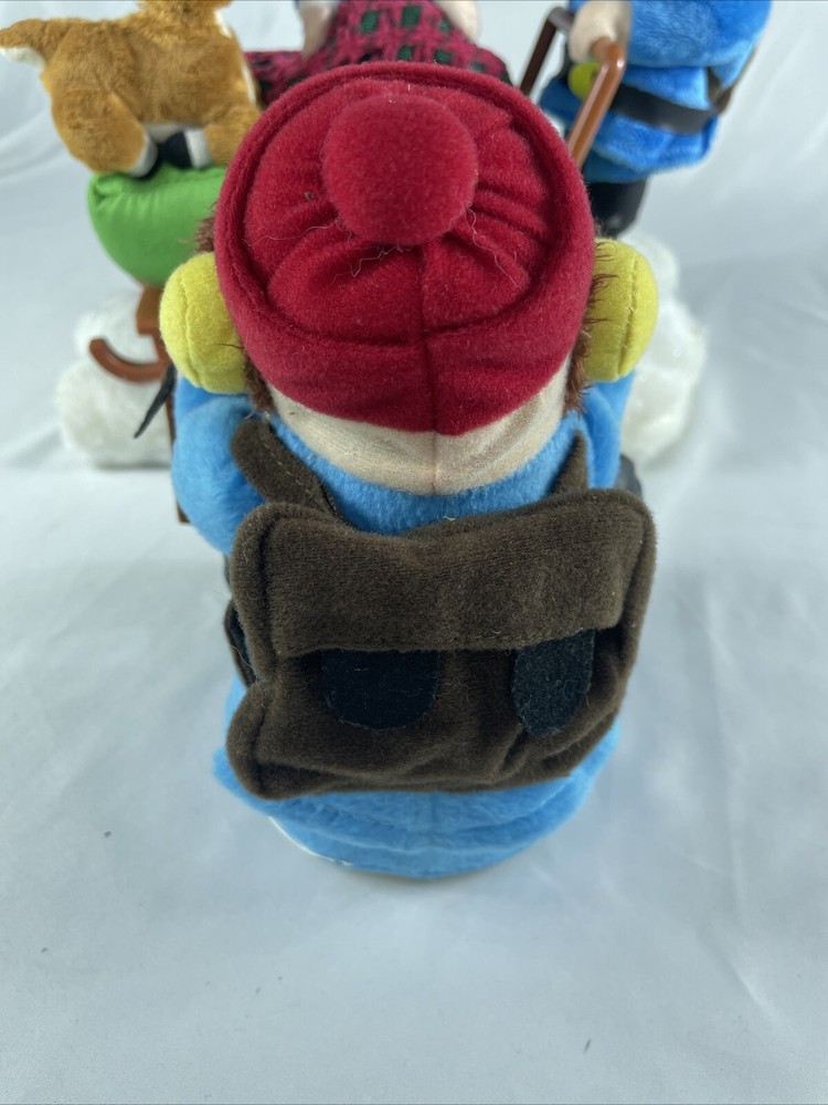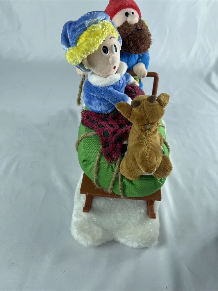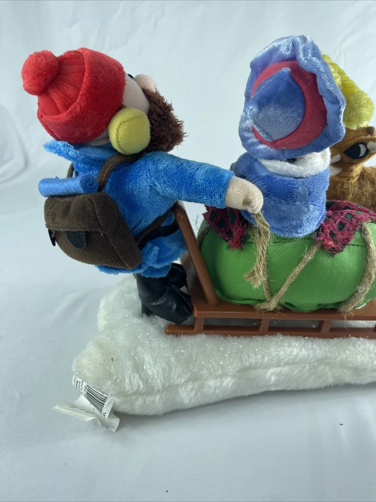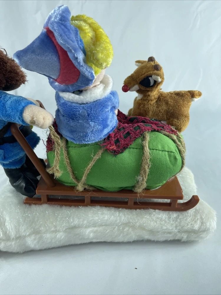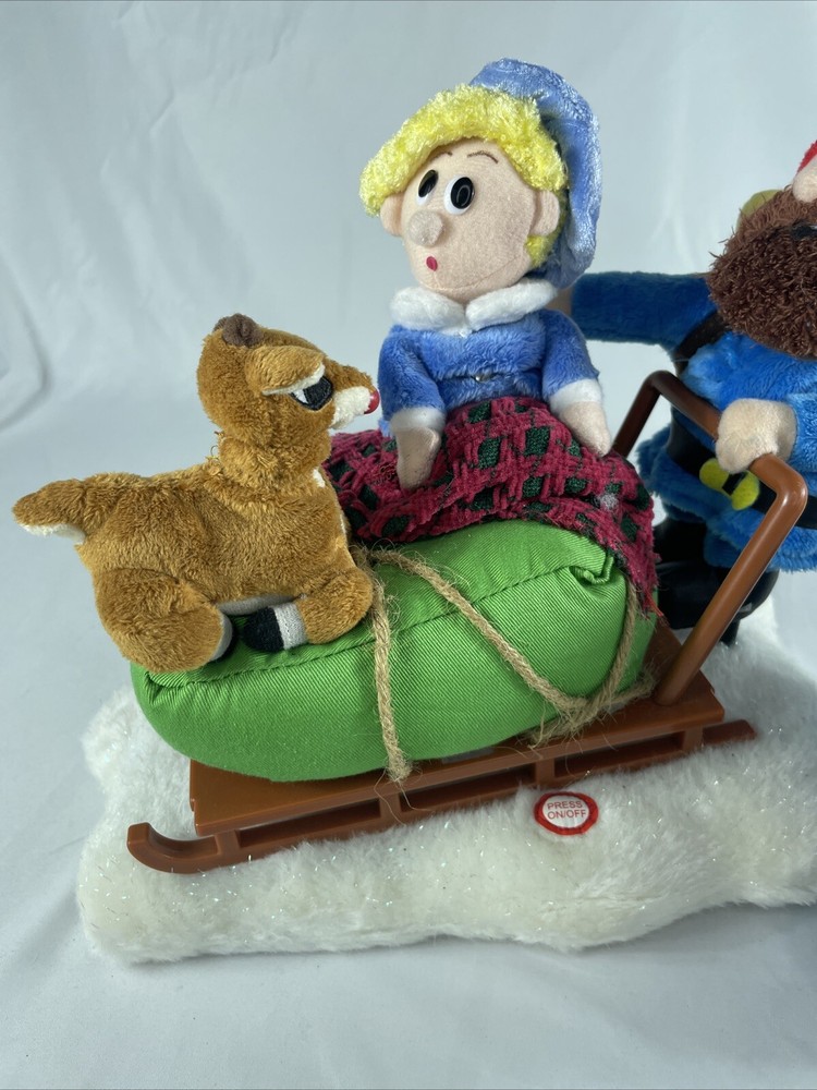Bring some holiday cheer to your home with this Gemmy Rudolph the Red Nosed Reindeer Hermey Yukon Cornelius Sleigh. This animated plush character sings and dances to the famous song "Santa Claus is Coming to Town" with multicolor lights. Perfect for Christmas, this collectible was manufactured in 1992 and is in great working condition. Add this unique piece to your holiday collection and let Hermey guide your sleigh to a festive destination. This item is not handmade and is not in a vintage condition. It requires batteries to operate and is made of plush, batteries, and animatronic materials.