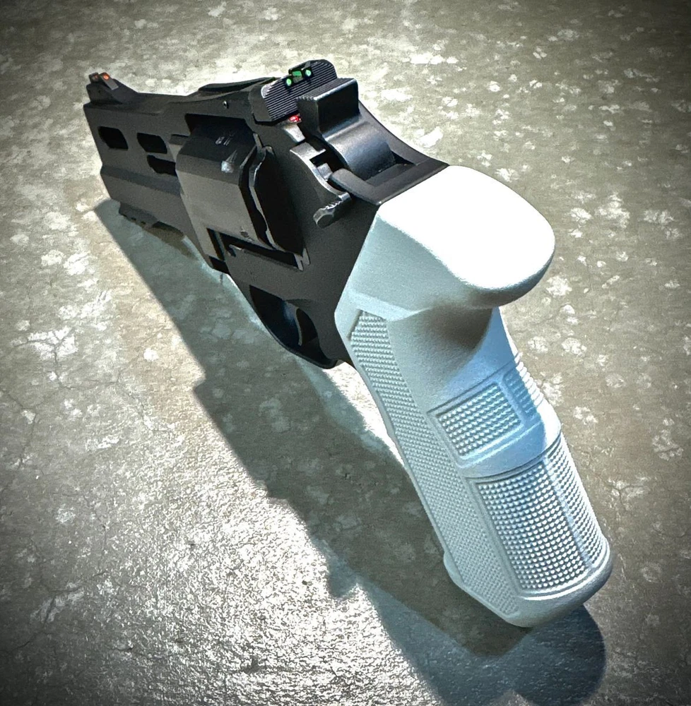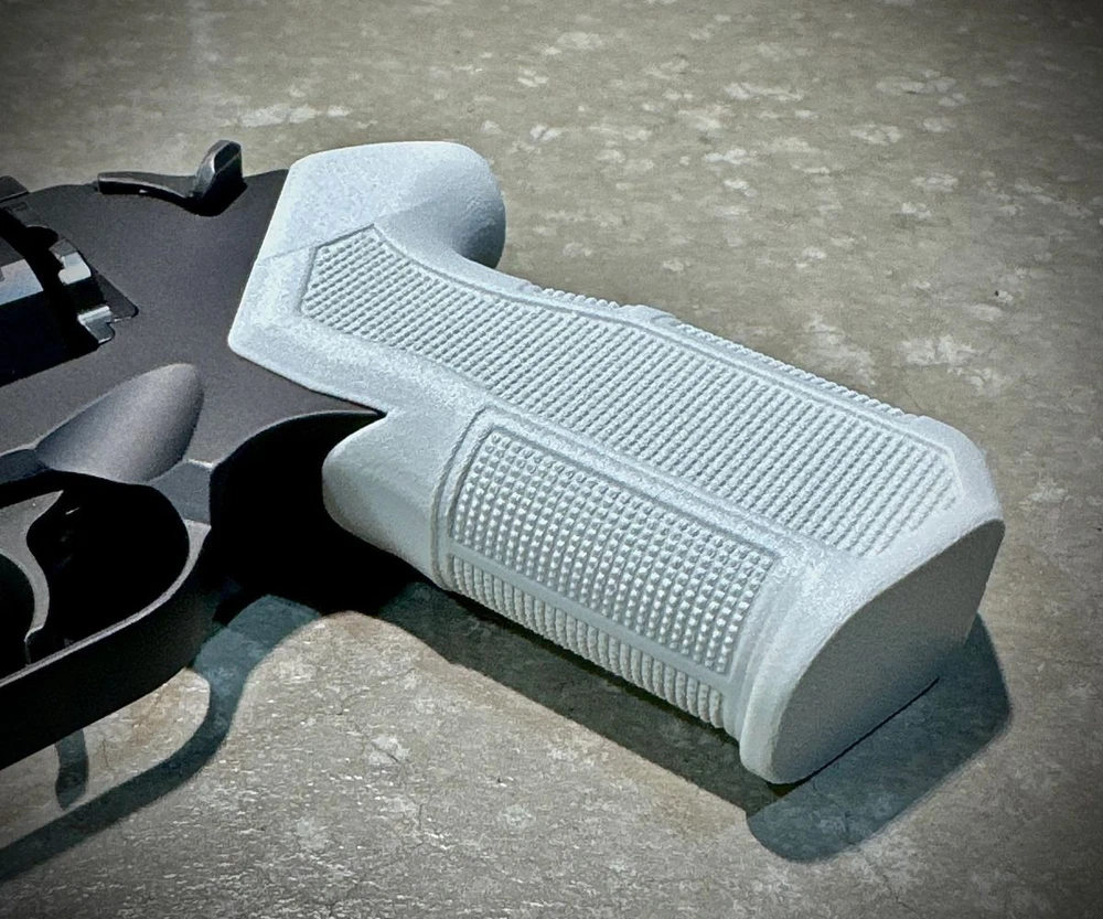 The Gen 3 Tactical Grip for the Chiappa Rhino is the culmination of continuous improvement and new design and manufacturing technologies and techniques. Available in an array of colors, the Gen 3 retains and enhances the simplicity and 1911-style, natural grip angle of the Gen 1, and the ergonomics and lock-in grip of the Gen 2. An all-new "Pyramid" texture pattern is introduced that provides an aggressive yet comfortable grip, even with wet hands. The beavertail is extended beyond the Gen 2 and provides hammer and cylinder release access, and a sharp reduction of the butt of the grip improves concealment. A new ambidextrous shooting-hand thumb-shelf adds solid positioning while two-hand shooting. Manufactured in the USA from high-strength and UV- and water-resistant glass fiber-infused materials, the Gen 3 Tactical Grip for the Chiappa Rhino is the perfect solution to provide maximum comfort and performance, maintaining and enhancing the aesthetic and space-age look of the Rhino. The Gen 3 Tactical Grip comes with a new 45mm grip screw and requires the use of the stock grip screw washer.