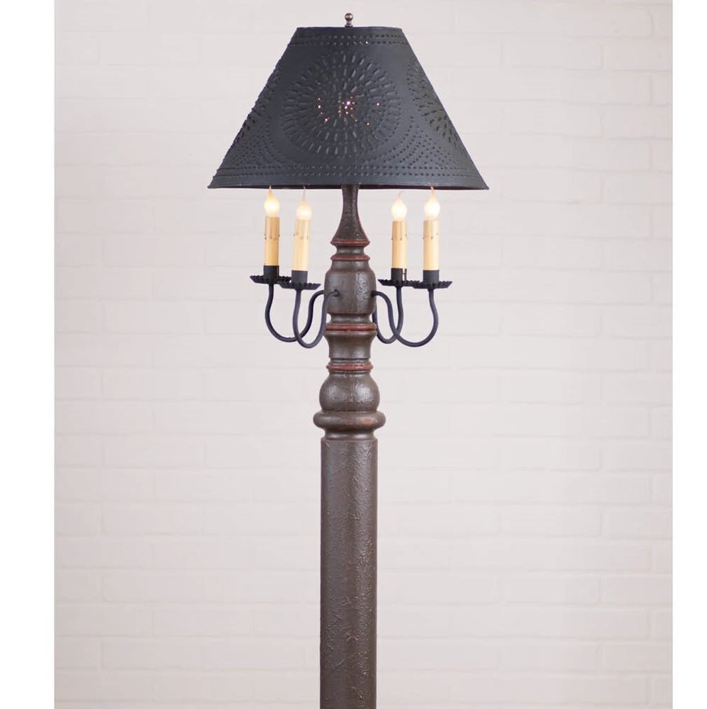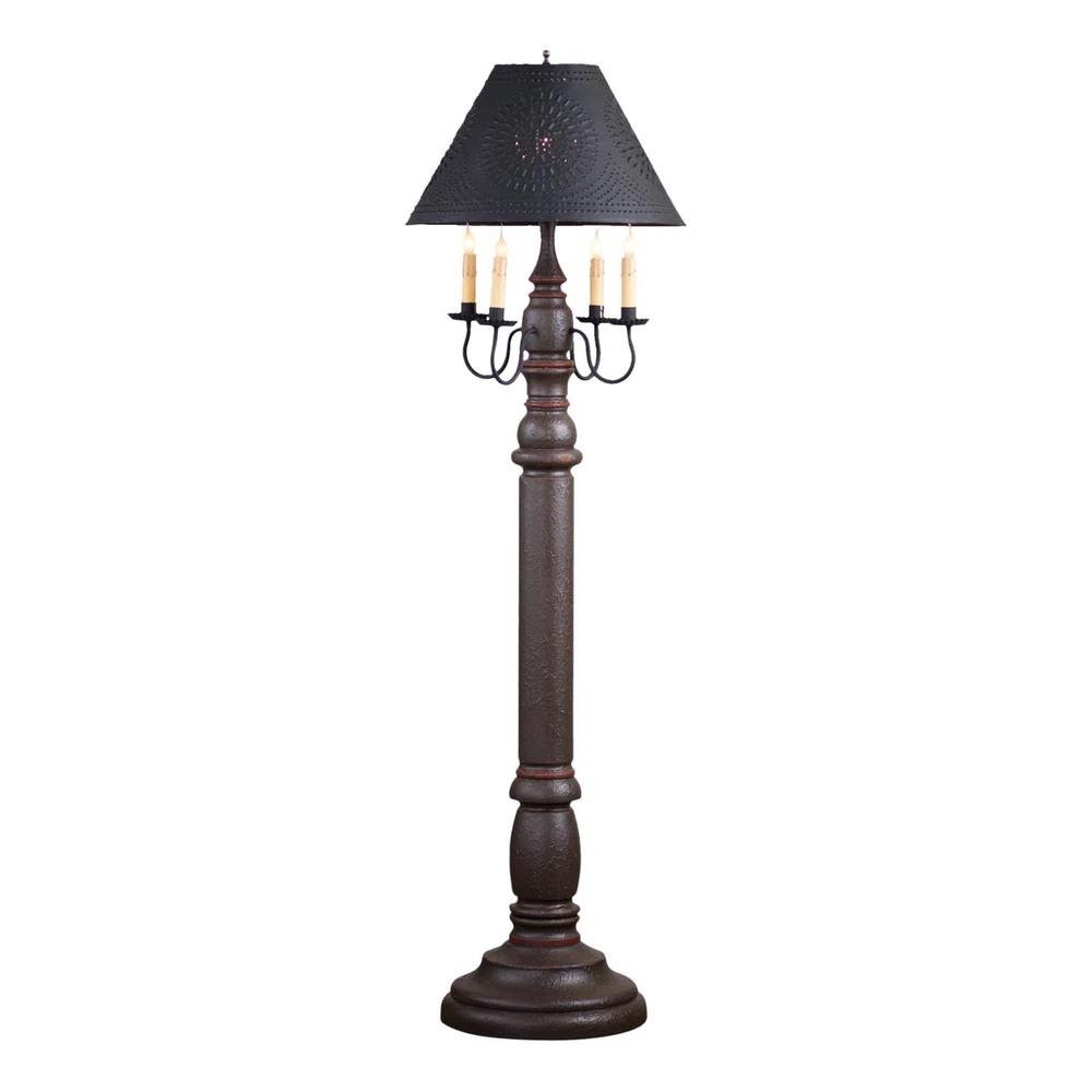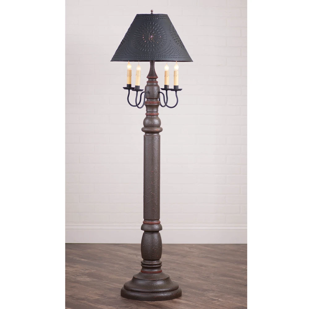 A large statement making floor lamp for your home. Imagine this beautiful lamp illuminating your reading nook, living room or office. Hand painted and lightly distressed finish. Center has 1 E26/Medium (Standard) socket, 150 watts max. The 4 arms have E12/Candelabra sockets, 60 watts max per arm. Includes a Textured Black metal 17 Inch shade. Has a three-way switch, 7-foot cord, 8 Inch harp and finial. Body is solid wood, arms are metal. USA made. Our eBay Store About Us Add to Favorite Sellers General James Floor Lamp Americana Espresso with Shade Measures 60.5-Inches high x 17-Inches in Diameter (with shade) Has a 7-foot cord and 3-way switch; Plugs into wall outlet; Top center has a standard socket, 1 x 150 watts max; Arms have candelabra sockets, 4 x 60 watts max. UL listed for dry locations Textured espresso black paint finish with red stripe; Black textured shade included Lamp Base is made in the USA, Shade is Imported A large statement making floor lamp for your home. Imagine this beautiful lamp illuminating your reading nook, living room or office. Hand painted and lightly distressed finish. Center has 1 E26/Medium (Standard) socket, 150 watts max. The 4 arms have E12/Candelabra sockets, 60 watts max per arm. Includes a Textured Black metal 17 Inch shade. Has a three-way switch, 7-foot cord, 8 Inch harp and finial. Body is solid wood, arms are metal. USA made. Product Details Color Brown Height 60.5 Length 17 Weight