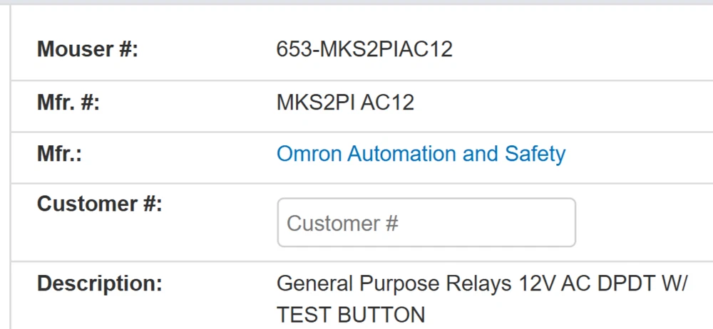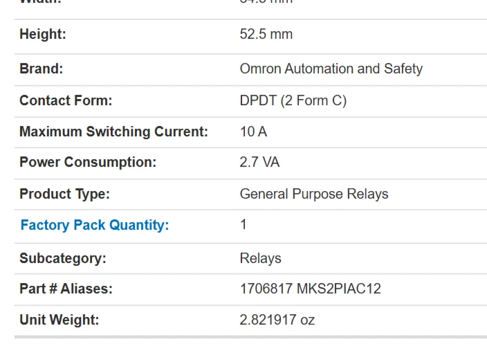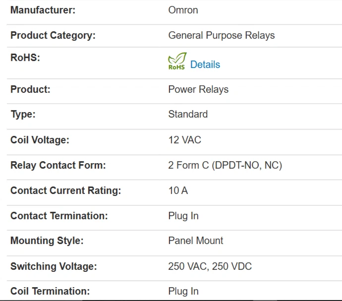 This general purpose relay from Omron is a reliable and efficient choice for controlling electrical equipment. With a maximum amperage of 250 VAC and a coil voltage of 12 VAC, it is suitable for a variety of applications. The relay is designed for AC current type and has a DPDT configuration with a test button for easy operation. Ideal for use in business and industrial settings, this relay offers high-quality performance and durability. Its compact design and easy installation make it a great choice for controlling electrical equipment in a variety of settings. Whether you need to control a motor, compressor, or other electrical device, this Omron relay is a reliable and efficient choice.