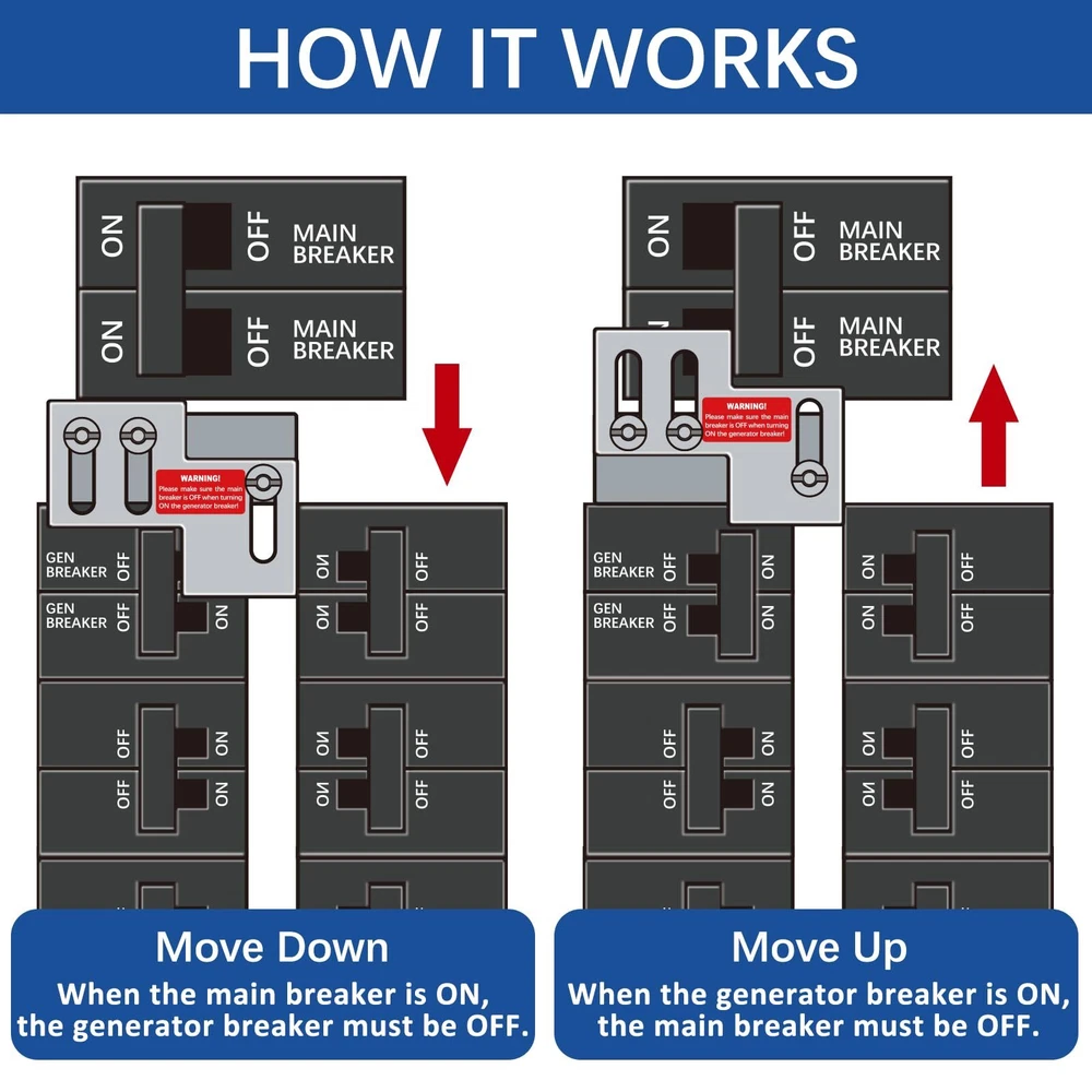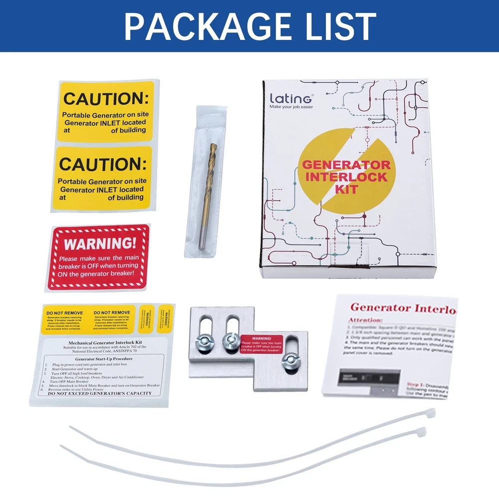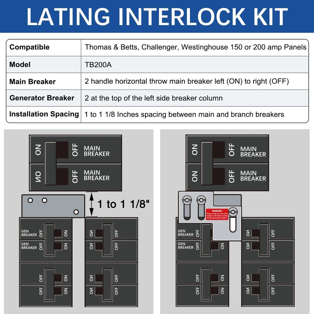 ⭐️Compatibility: This interlock kit fits Thomas and Betts, Challenger and Westinghouse 150 or 200 amp panels, the spacing between main and the closest generator breaker is 1 to 1 1/8''. ⭐️Durability: The generator lockout kit is made of corrosion-resistant and high hardness aluminum alloy. ⭐️Anodization: Our interlock switch has been treated with surface anodized, electrical insulation, heat insulation, safer. ⭐️Package Content: Interlock x1; safety labels x6; 11.8''generator breaker retainer straps x2; 3/16 drill bit x1; Installation guide x1 ⭐️Note: If the breaker interlock doesn't work properly, DO NOT USE it and contact us immediately for support and instructions!