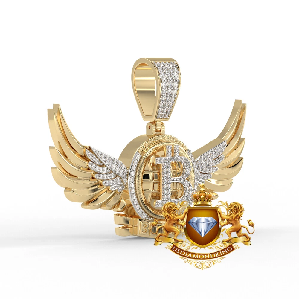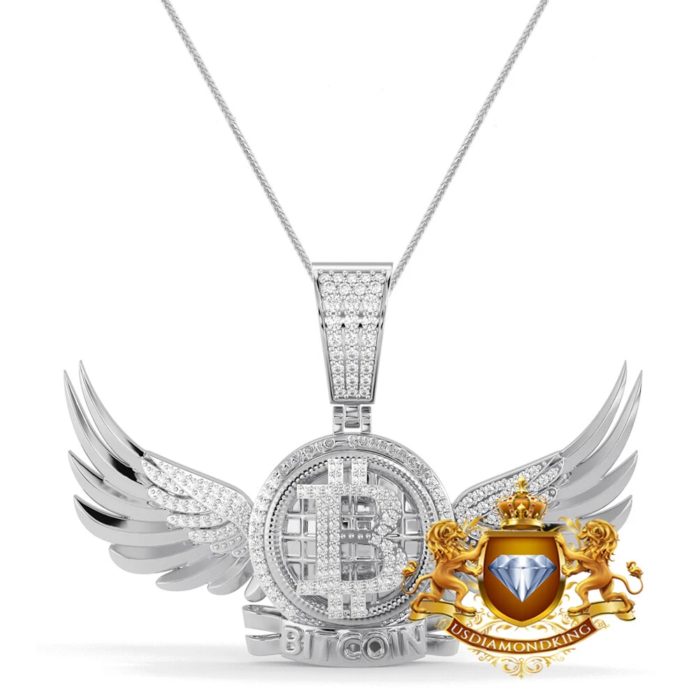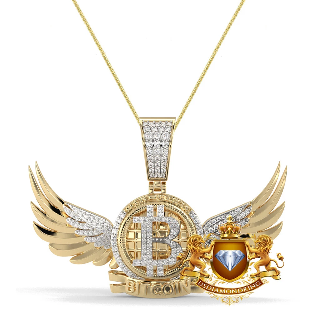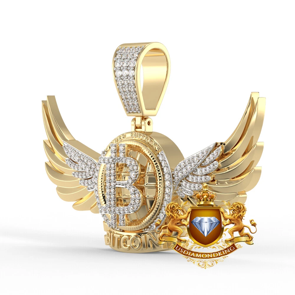 Real Genuine Authentic 1.50 Cwt. VVS/1 Certified Tested MOISSANITE Diamond 25 Grams Flying Winged Bitcoin Digital Money Cryptocurrency Pendant 10K Gold Over Charm Chain Neckless Set Photos do not indicate actual size. All size dimensions are provided below. Please read through before purchasing." Main Stone : Real Genuine Authentic VVS/1 Vivid Moissanite Diamonds Total Diamond Carat Weight (TCW) : 1.50 Cwt. Diamond Setting : Micro Pave Diamond Shape : Round Brilliant Cut Diamond Clarity : VVS/I Diamond Color : White ( H-I ) Diamond Cut : Very Good Diamond Treatment : Not Enhanced Charm Length : 1.50 Inches ( Including Bail ) Charm Width : 2.25 Inches Charm Thickness : 8 mm Charm Bail : 7 mm (Fit Up To 6 mm Chain) Metal : Genuine Italian Sterling Silver Finish : 10K Gold Finish Chain Style : Franco Chain Length : 24 Inch Chain Width : 1.5 mm Chain Metal : Genuine Italian Sterling Silver Gender : Men's / Women's (Unisex) Total Weight (Charm + Chain) : 25 + Grams (Approximate) Weights are approximate, there may be up to 10% variation in actual item. Back : Caged Condition : Brand New With Tag *** Comes With Complimentary Presentation Gift Box *** RETAIL TAG PRICE : $899.99 OUR WHOLESALE PRICE : $299.99 ITEM # NIK-CUSTOM-3211