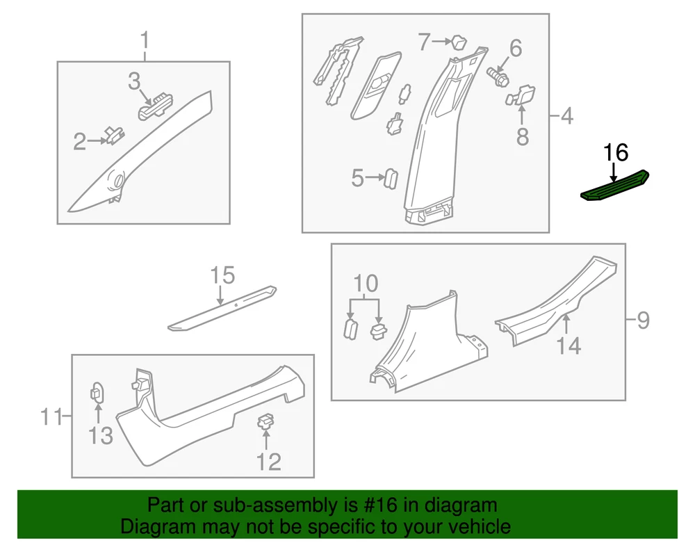 vanceautogroupofwoodward Genuine GM Driver Side Rear Door Sill Trim Plate 22923695 Part can be found as # 16 in the diagram above Product Description Rear. Helps enhance the appearance of your vehicle's interior threshold This GM Genuine Part is designed, engineered, and tested to rigorous standards and is backed by General Motors Collision parts are designed to help promote proper and safe repair Specifications Brand GM Manufacturer Part Number 22923695 SKU 22923695 Product Genuine GM Driver Side Rear Door Sill Trim Plate 22923695 Replaces 20997919 ONLY PART REFERENCE #16 ON THE DIAGRAM IS INCLUDED WARNING : May cause cancer and reproductive harm. See www.P65Warnings.ca.gov for more info. Terms and Conditions Thank you for shopping with us. Please find our policies below. If you have any other questions, please don't hesitate to contact us. Shipping Terms If located in Alaska, Hawaii, and Puerto Rico Please contact US via eBay email for pricing In stock orders ship within 24 hours. Weekend orders will be processed the next business day. If a part is not in stock and must be ordered from the manufacturer, it usually takes 2-3 days to arrive to us and will be promptly shipped to you. Most of the orders are shipped complete within 2-3 business days. A few of the parts ordered from the manufacturer may take up to 5-6 business days to arrive and will shipped to you immediately. Depending upon location, ground shipments usually take 2-7 days. Your order may be shipped Overnight for an additional cost. Oversized shipments will be additional; you will be contacted prior to shipping for approval. We cannot guarantee transit times for ground and oversize orders. Shipping Carrier substitutions may be made at our determination in an attempt to reduce shipping cost to the customer. We do not ship internationally. In the unlikely event that a part has been placed on backorder or discontinued, we will do our best to try and find one for you as quickly as possible. We do not ship COD orders. Return Policy Contact us to arrange for any returns. A copy of the invoice will need to be included with the return. Parts must be resaleable and in the original packaging. We cannot take back used parts. We cannot take back installed or tried parts. Electrical parts are not returnable. We do reserve the right to refuse and return any parts we find have been installed, are used or do not meet the above criteria. Return request need to be within 30 days of receipt. Cancellation Policy An order or a portion of an order may be cancelled up until the time it is shipped and no longer in our possession. Home • Newsletter Signup • Contact Us Copyright © 2025 vanceautogroupofwoodward , All rights reserved. Solution by RevolutionParts, Inc. :: Design by OCDesignsOnline