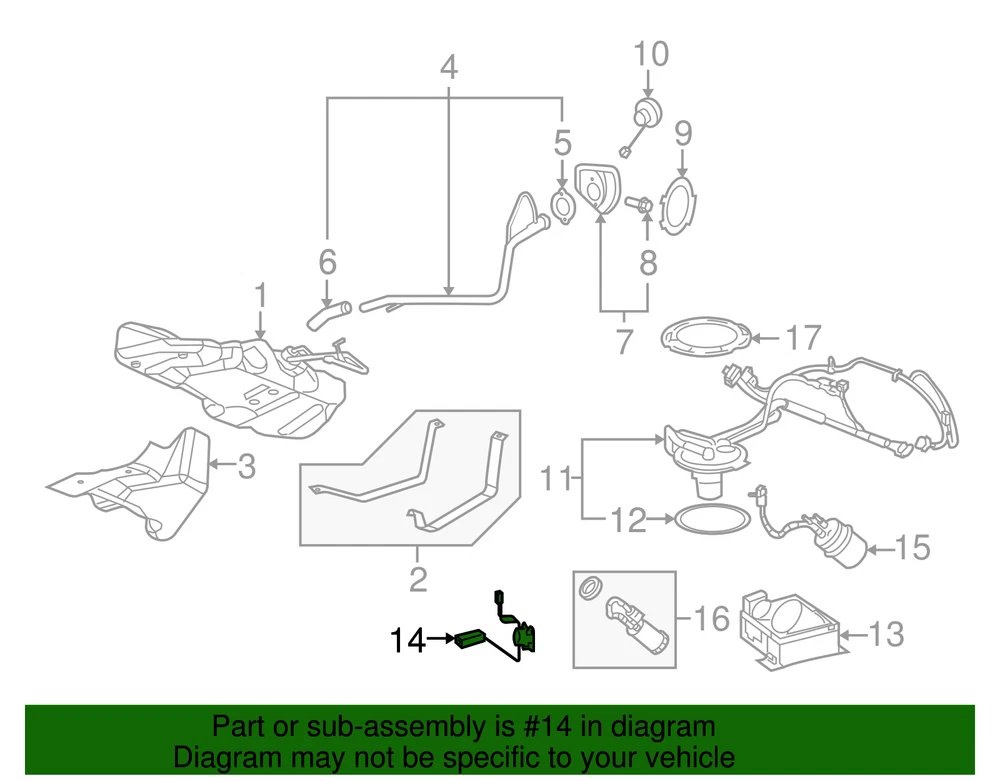 VRAY-GMC Genuine GM Fuel Level Sensor Kit with Seal 15947543 Part can be found as # 14 in the diagram above Product Description Cobalt. 2.2l. Pzev spec. California emmisions. Measures fuel level changes displayed on fuel gauge Specifications Brand GM Manufacturer Part Number 15947543 SKU 15947543 Product Genuine GM Fuel Level Sensor Kit with Seal 15947543 ONLY PART REFERENCE #14 ON THE DIAGRAM IS INCLUDED WARNING : May cause cancer and reproductive harm. See www.P65Warnings.ca.gov for more info. Terms and Conditions Thank you for shopping with us. Please find our policies below. If you have any other questions, please don't hesitate to contact us. Shipping Terms In stock orders ship within 24 hours. Weekend orders will be processed the next business day. If a part is not in stock and must be ordered from the manufacturer, it usually takes 2-3 days to arrive to us and will be promptly shipped to you. Most of the orders are shipped complete within 2-3 business days. A few of the parts ordered from the manufacturer may take up to 5-6 business days to arrive and will shipped to you immediately. Depending upon location, ground shipments usually take 2-7 days. Your order may be shipped Overnight for an additional cost. Oversized shipments will be additional; you will be contacted prior to shipping for approval. We cannot guarantee transit times for ground and oversize orders. Shipping Carrier substitutions may be made at our determination in an attempt to reduce shipping cost to the customer. We do not ship internationally. In the unlikely event that a part has been placed on backorder or discontinued, we will do our best to try and find one for you as quickly as possible. We do not ship COD orders. Return Policy Contact us to arrange for any returns. A copy of the invoice will need to be included with the return. Parts must be resaleable and in the original packaging. We cannot take back used parts. We cannot take back installed or tried parts. Electrical parts are not returnable. We do reserve the right to refuse and return any parts we find have been installed, are used or do not meet the above criteria. Return request need to be within 30 days of receipt. Cancellation Policy An order or a portion of an order may be cancelled up until the time it is shipped and no longer in our possession. Home • Newsletter Signup • Contact Us Copyright © 2025 VRAY-GMC , All rights reserved. Solution by RevolutionParts, Inc. :: Design by OCDesignsOnline