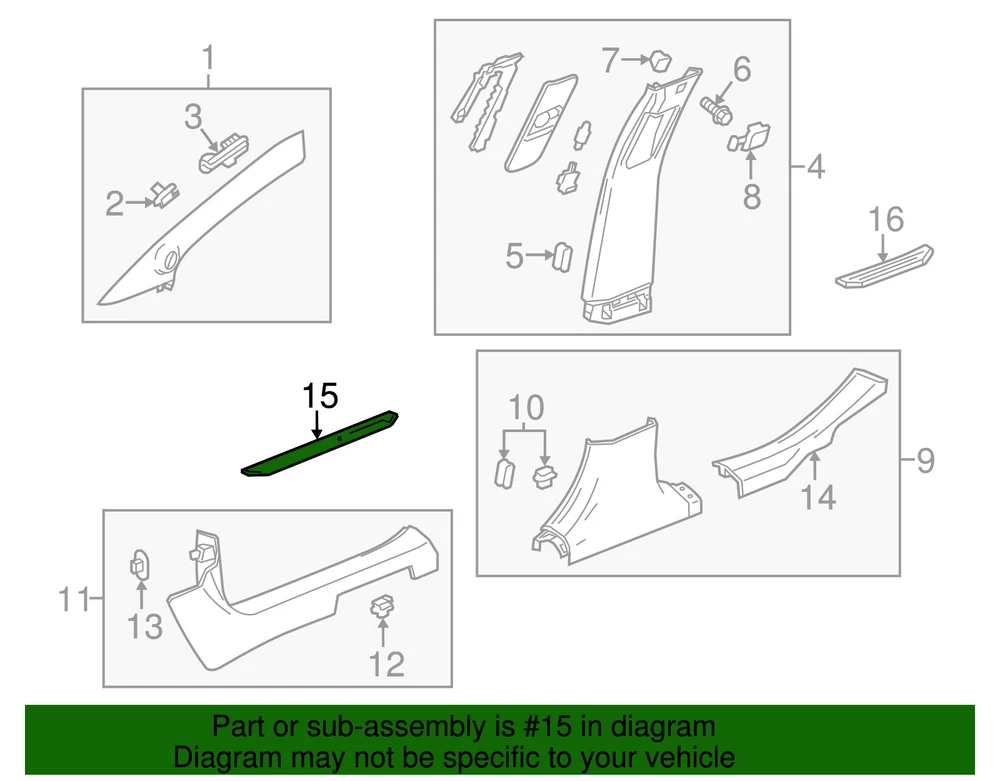 vanceautogroupofwoodward Genuine GM Passenger Side Front Door Sill Trim Plate 22923698 Part can be found as # 15 in the diagram above Product Description Front. Helps enhance the appearance of your vehicle's interior threshold This GM Genuine Part is designed, engineered, and tested to rigorous standards and is backed by General Motors Collision parts are designed to help promote proper and safe repair Specifications Brand GM Manufacturer Part Number 22923698 SKU 22923698 Product Genuine GM Passenger Side Front Door Sill Trim Plate 22923698 Replaces 20997920 ONLY PART REFERENCE #15 ON THE DIAGRAM IS INCLUDED WARNING : May cause cancer and reproductive harm. See www.P65Warnings.ca.gov for more info. Terms and Conditions Thank you for shopping with us. Please find our policies below. If you have any other questions, please don't hesitate to contact us. Shipping Terms If located in Alaska, Hawaii, and Puerto Rico Please contact US via eBay email for pricing In stock orders ship within 24 hours. Weekend orders will be processed the next business day. If a part is not in stock and must be ordered from the manufacturer, it usually takes 2-3 days to arrive to us and will be promptly shipped to you. Most of the orders are shipped complete within 2-3 business days. A few of the parts ordered from the manufacturer may take up to 5-6 business days to arrive and will shipped to you immediately. Depending upon location, ground shipments usually take 2-7 days. Your order may be shipped Overnight for an additional cost. Oversized shipments will be additional; you will be contacted prior to shipping for approval. We cannot guarantee transit times for ground and oversize orders. Shipping Carrier substitutions may be made at our determination in an attempt to reduce shipping cost to the customer. We do not ship internationally. In the unlikely event that a part has been placed on backorder or discontinued, we will do our best to try and find one for you as quickly as possible. We do not ship COD orders. Return Policy Contact us to arrange for any returns. A copy of the invoice will need to be included with the return. Parts must be resaleable and in the original packaging. We cannot take back used parts. We cannot take back installed or tried parts. Electrical parts are not returnable. We do reserve the right to refuse and return any parts we find have been installed, are used or do not meet the above criteria. Return request need to be within 30 days of receipt. Cancellation Policy An order or a portion of an order may be cancelled up until the time it is shipped and no longer in our possession. Home • Newsletter Signup • Contact Us Copyright © 2025 vanceautogroupofwoodward , All rights reserved. Solution by RevolutionParts, Inc. :: Design by OCDesignsOnline