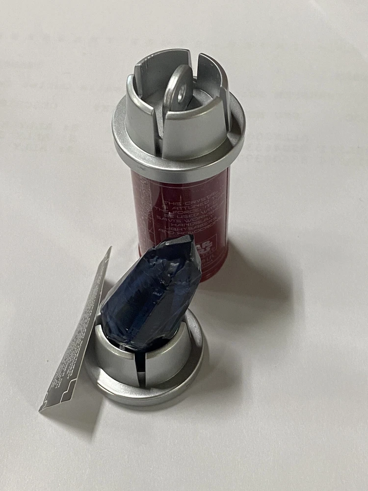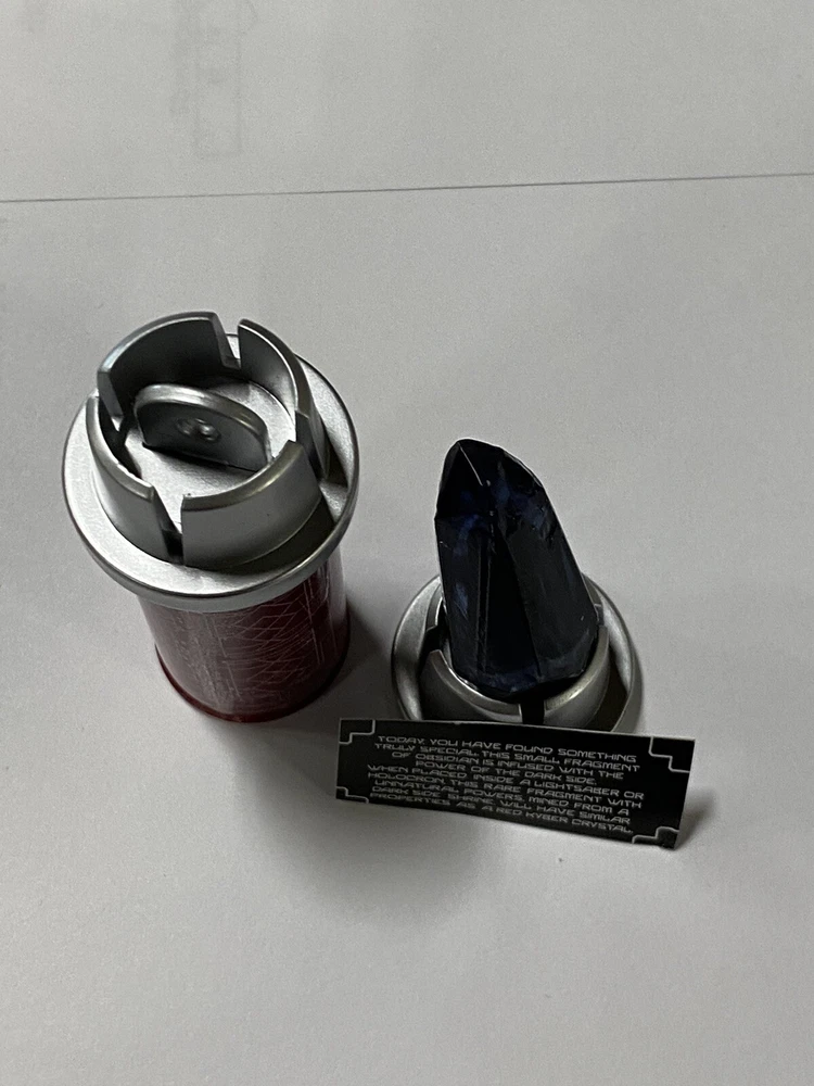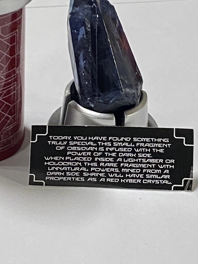 Fresh Disneyland pull. 04/20/24 This product is a genuine black Kyber crystal from Star Wars Galaxy's Edge, a themed land in Disney's theme parks. The crystal is compatible with a Jedi or Sith holocron and can activate different lightsaber colors and sound effects. This particular crystal also features the voice of Snoke, a character from the Star Wars franchise. The product includes free shipping.