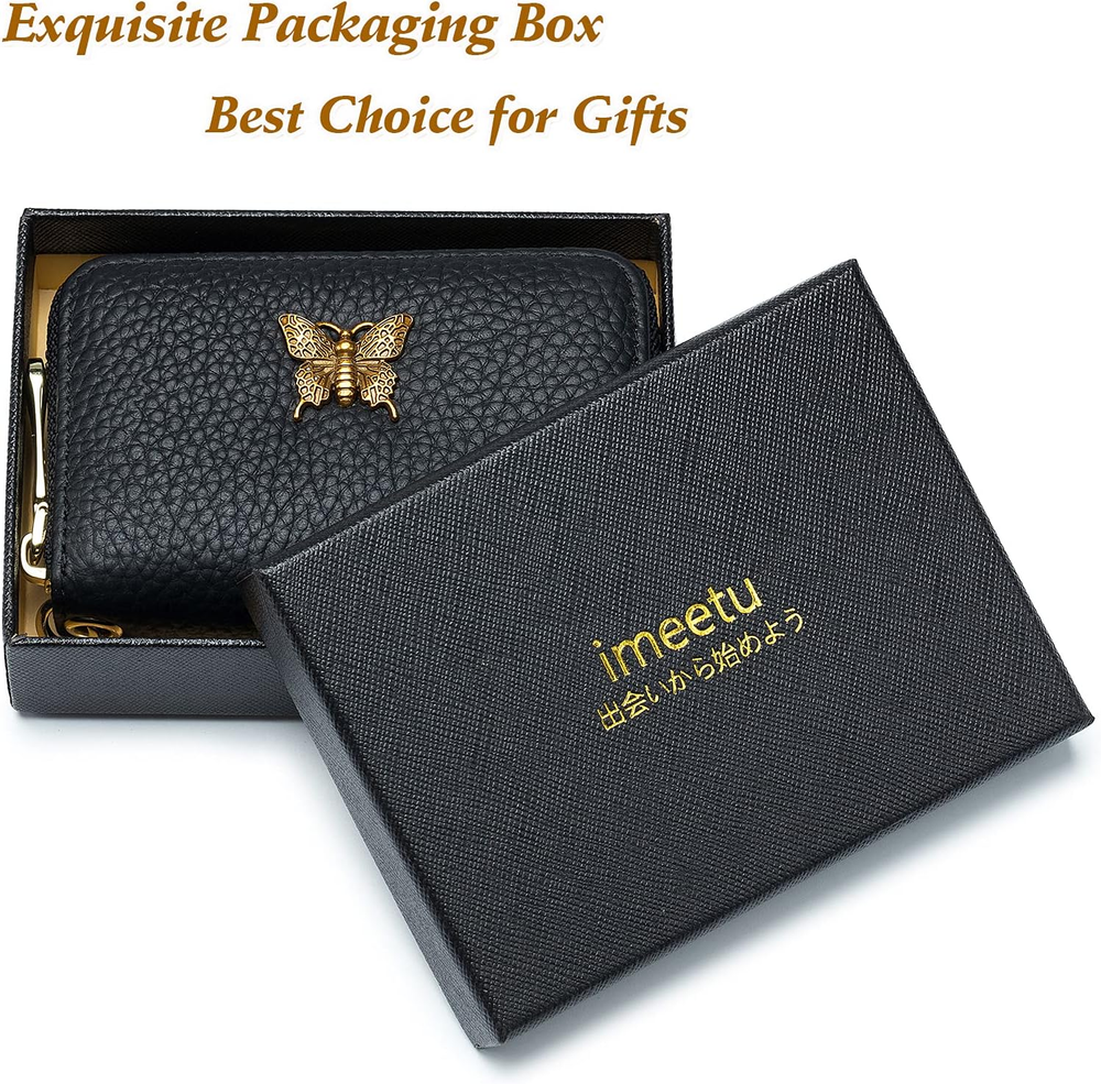 Premium Leather Material: The credit card holder is made of premium genuine leather, super soft and brings surprising touch feeling. The cute butterfly decoration must be a reason for you to choose it, which makes you more attractive and shows your fashion. Large Capacity: 12 card slots + 2 cash compartment + 1 interior coin pocket, which is enough for holding your keys daily cards, such as credit card, debit card, business card, ID card, checks, drivers license, bills, receipts, folded cash and more. Extra key chain for keys and lanyards makes the card case portable and convenient. Perfect Size: 4.3 x 2.8 x 1 inches. The perfect size of card organizer is suitable for holding it in your hand or put in bag. With a full-around zipper as protection, enjoy a convenient use in daily commuter, as well as traveling. RFID Blocking Technology: Equipped with advanced proprietary blocking technology, the card holder aims to protect your personal information on the cards from unauthorized scanning. Happy Shopping Service: imeetu is striving to offer high-quality products and a range of professional and efficient after-sales service to our broad customers. As a service-oriented and vibrant brand, imeetu can do more for you! Product Description imeetu RFID Credit Card Holder Wallet Small Leather Wallet for Women Superior Quality imeetu, you meet better! The video showcases the product in use. The video guides you through product setup. The video compares multiple products. The video shows the product being unpacked. imeetu Brand's recommended choices! How to choose the right card wallet for your cards? Security - RFID Blocking and Special Design. It's important! Safety is everything! The duty of imeetu card wallet is to protect your money! Functional & Practical - 12 Card Slots + 2 Cash Slots + 1 Zipper Coin Pocket, provide enough space for credit cards, cash, change, coins etc. Perfect Size - Compact size card holder is perfect to fit in your pockets or handbags. Fashion - The classic style with various colors fits any occasion and easily matches your outfit. imeetu RFID Credit Card Holder Add to Cart Add to Cart Add to Cart Add to Cart Add to Cart Add to Cart Add to Cart Customer Reviews 4.7 out of 5 stars 21,321 4.7 out of 5 stars 21,321 4.6 out of 5 stars 2,576 4.7 out of 5 stars 21,321 4.6 out of 5 stars 2,576 4.7 out of 5 stars 6,889 4.5 out of 5 stars 2,224 Price $16.99 $ 16 . 99 $22.99 $ 22 . 99 $16.99 $ 16 . 99 $26.99 $ 26 . 99 $25.99 $ 25 . 99 $15.99 $ 15 . 99 $20.99 $ 20 . 99 Compartment 12 Card Slots + 2 Cash Slots 12 Card Slots + 2 Cash Slots 12 Card Slots + 2 Cash Slots 12 Card Slots + 4 Cash Slots 12 Card Slots + 4 Cash Slots 2 Zipper Pockets 4 Pockets RFID Blocking ✔ ✔ ✔ ✔ ✔ ✘ ✘ ID Window ✘ ✔ ✔ ✔ ✔ ✘ ✘ Genuine leather ✔ ✔ ✔ ✔ ✔ ✔ ✔ Ideal gift Choice ✘ ✔ ✔ ✔ ✔ ✔ ✔