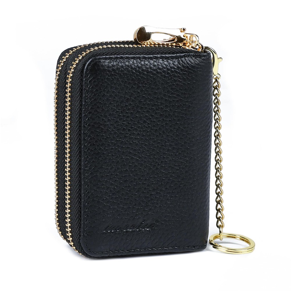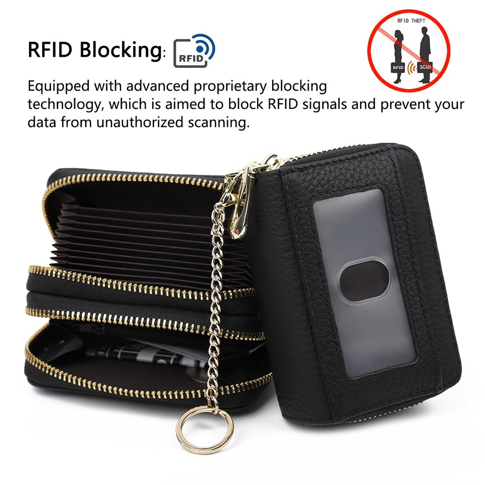Multifunctional Keychain Card Wallet: Made of genuine leather, soft and durable. Designed with a detachable keychain for your house or car keys. And the external clear ID window is convenient to use. Double Zipper Multi-Slots Card Case: 12 accordion credit card slots, 4 cash slots (can store coins or folded banknotes), 1 zipper pocket, 1 clear ID window, and 1 removable wallet keychain, which is enough for holding your keys and daily cards, such as credit card, debit card, business card, ID card, folded cash and more. RFID Blocking and Special Design for You: Equipped with advanced proprietary blocking technology, which aims to protect your personal information on the cards from unauthorized scanning. The classic style with various colors fits any occasion and easily matches your outfit. Ideal Gifts with Exquisite Packing Box: We designed it carefully for you, and you selected it carefully for your friends or family. It must be a wonderful gift on Thanksgiving Day, New Year's, Birthday, and Christmas. Happy Shopping Service: is striving to offer high-quality products and a range of professional and efficient after-sales service to our broad customers. , you meet better!