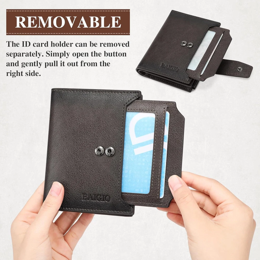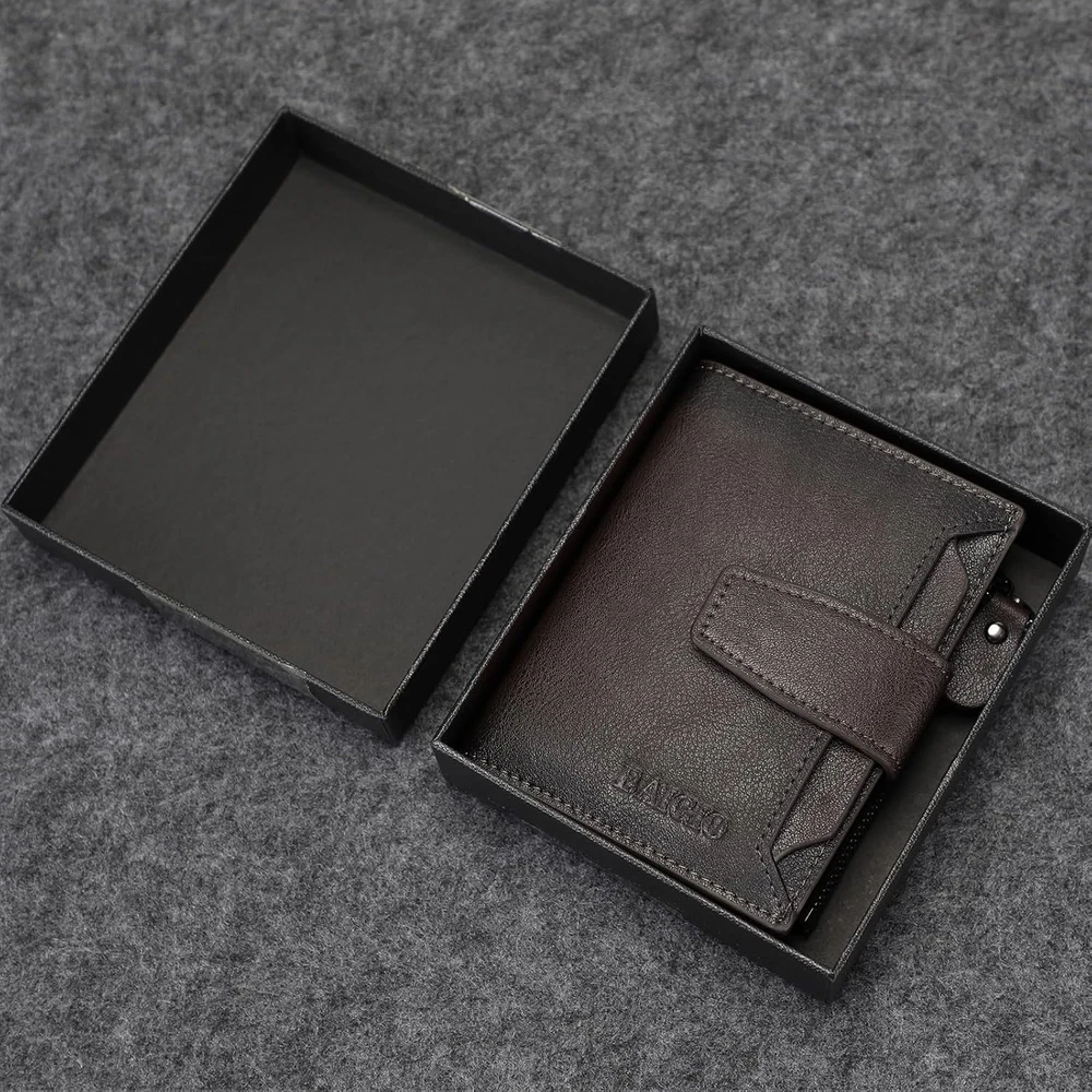 Genuine leather: This genuine leather wallet for men made from the best layer cowhide material.It make the men's leather wallet has a natural character that excellent breathability,durable surface and pure grain. And the wonderful zipper wallet for men give us a elegant style. Rfid blocking: This men's leather wallet is equipped with advanced RFID SECURE technology. Inside the men's wallet is a unique chip made of a metal composite material specifically designed to block RFID signals at 13.56 MHz and above. This multi-functional wallet for men protects your information from unauthorized scanning. Capacity display: This men's wallet has 18 card slots for credit cards, debit cards, bank cards, ID cards and more; 2 large bill compartments for cash, bills, receipts and coupons; 1 zippered pocket for coins; and finally 2 clear ID windows ideal for your driver's license.Men's zipper wallet measures 5.12 x 3.94 x 1.18 inches. The small size large capacity men's wallet can be carried in a shirt pocket or bag. Multifunction: The perfect organizer for cash/coins/ID card/credit card/SD card/receipts etc. From casual to business, it is perfect for travel or daily use. The zipper design of this leather wallet also protects your privacy from dust. Complimentary beautiful box: This high quality wallet is perfect as a memento for groomsmen, birthdays, Father's Day, Christmas and other special holidays. Whenever you have a problem choosing a present for men, this men's zipper wallet will be your best choice. Product Description Genuine Leather Wallet for Men This genuine leather wallet for men made from the best layer cowhide material.It make the men's leather wallet has a natural character that excellent breathability,durable surface and pure grain. And the wonderful zipper wallet for men give us a elegant style. This men's leather wallet is equipped with advanced RFID SECURE technology. Inside the men's wallet is a unique chip made of a metal composite material specifically designed to block RFID signals at 13.56 MHz and above. This multi-functional wallet for men protects your information from unauthorized scanning. This men's short wallet comes with a removable ID card holder. This men's wallet is designed with two slots for metal buckle buttons that can be self-adjusted to the desired wallet tightness. The zipper is smooth and the small zippered pocket is great for storing coins. This men's small wallet is very stylish and the right size to carry in your hand or store in your bag. Complimentary beautiful box This high quality wallet is perfect as a memento for groomsmen, birthdays, Father's Day, Christmas and other special holidays. Whenever you have a problem choosing a present for men, this men's zipper wallet will be your best choice. Leather Wallet for Men Add to Cart Add to Cart Add to Cart Add to Cart Add to Cart Add to Cart Add to Cart Customer Reviews 4.5 out of 5 stars 1,857 4.5 out of 5 stars 1,857 4.5 out of 5 stars 56 4.3 out of 5 stars 10 4.1 out of 5 stars 432 3.9 out of 5 stars 5 4.1 out of 5 stars 432 Price $23.99 $ 23 . 99 $23.99 $ 23 . 99 $30.99 $ 30 . 99 $25.99 $ 25 . 99 $26.99 $ 26 . 99 $27.99 $ 27 . 99 $26.99 $ 26 . 99 Material Genuine Leather Genuine Leather Genuine Leather Genuine Leather Genuine Leather Genuine Leather Genuine Leather Color Black Brown Black Coffee Black Coffee Black Rfid blocking ✔ ✔ ✔ ✔ ✔ ✔ ✔ Style Short Wallet Short Wallet Short Wallet Short Wallet Short Wallet Long Wallet Short Wallet Card slots 9 card slots 9 card slots 10 card slots 11 card slots 12 card slots 7 card slots 18 card slots