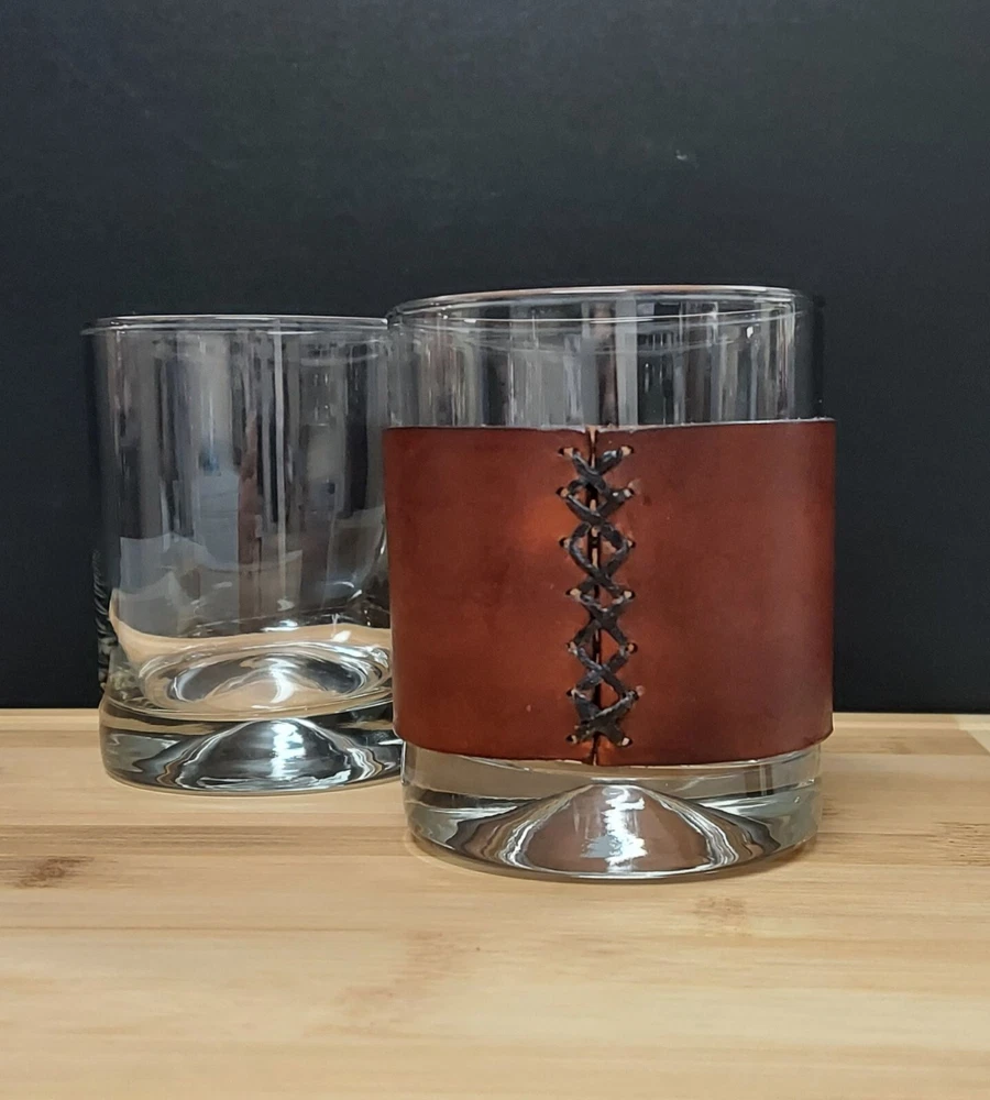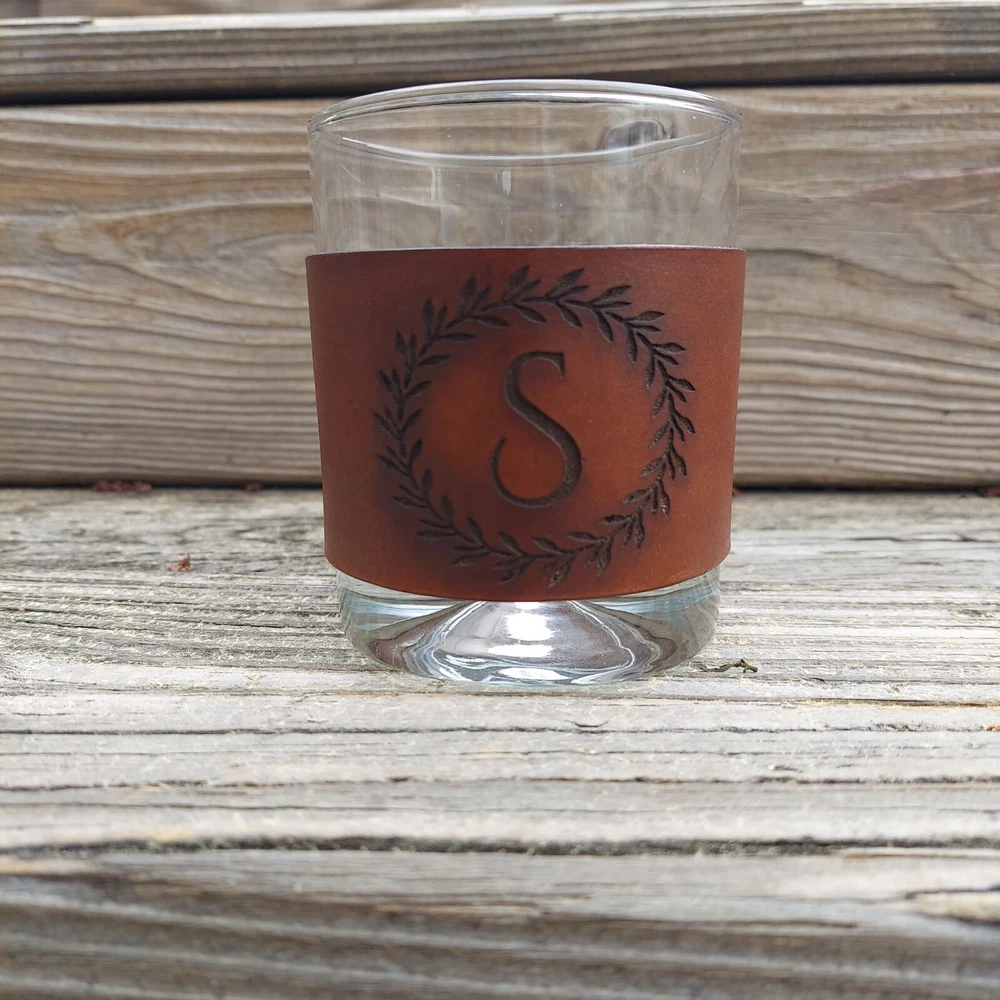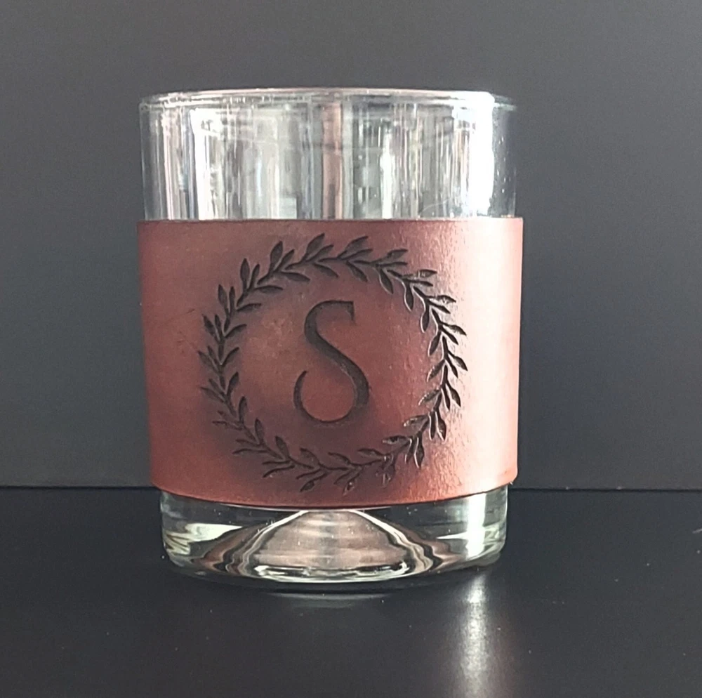 Custom Leather glass sleeve handcrafted with top grain leather. Available in natural, bridle, light and dark brown, mahogany or black. Hand stitched to firmly fit with a comfortable feel. Slides on and off for convenient washing. Personalize your sleeve with a monogram. Choose your borders. Order a single glass with sleeve or get a pair. Beautifully wrapped. Don't want a monogram? No problem, message me for more information.