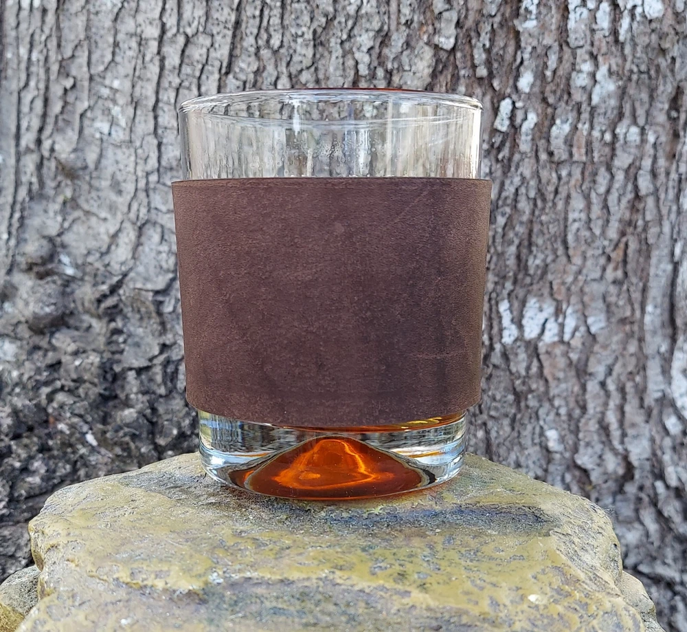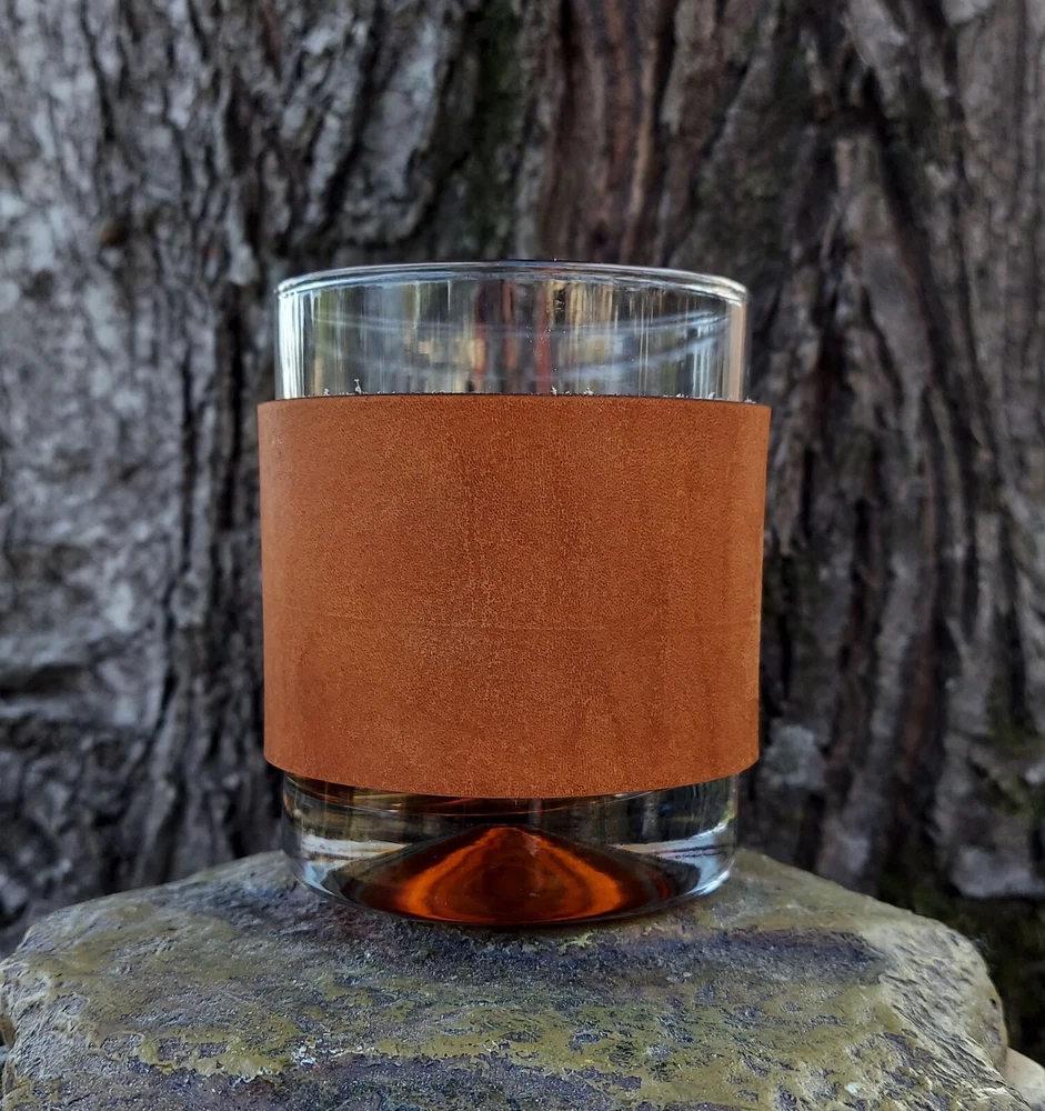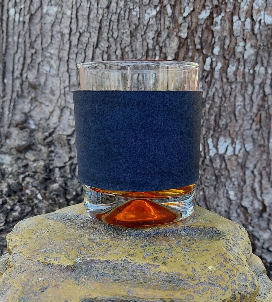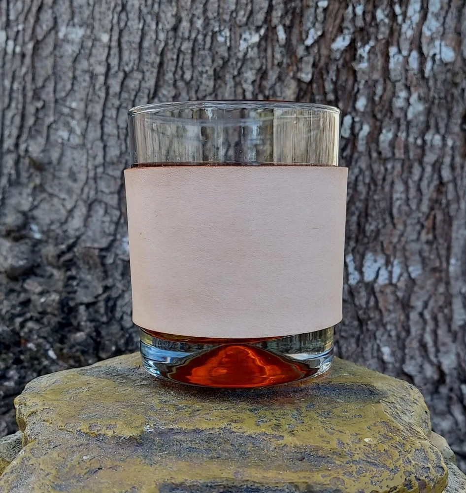 Custom Leather glass sleeve handcrafted with top grain leather. Available in natural, bridle, light and dark brown, mahogany or black. Hand stitched to firmly fit with a comfortable feel. Slides on and off for convenient washing. Personalize your sleeve with a monogram. Choose your borders. Order a single glass with sleeve or get a pair. Beautifully wrapped. Don't want a monogram? No problem, message me for more information.