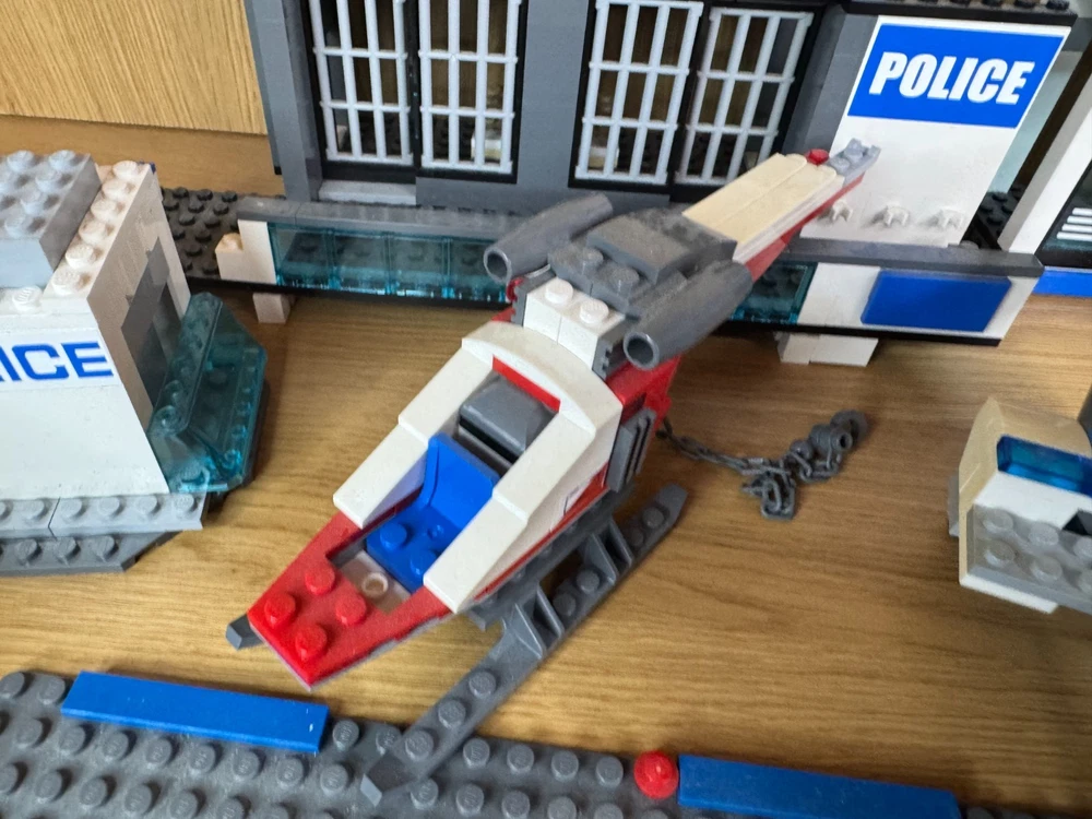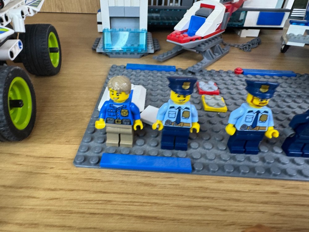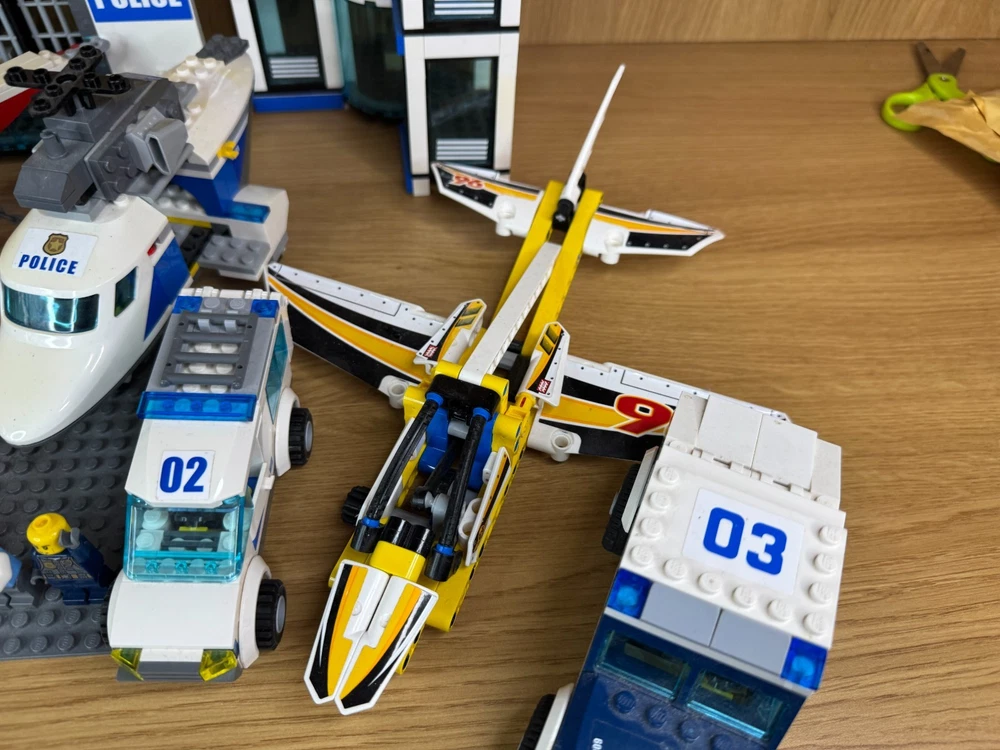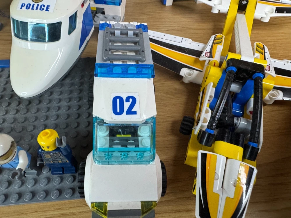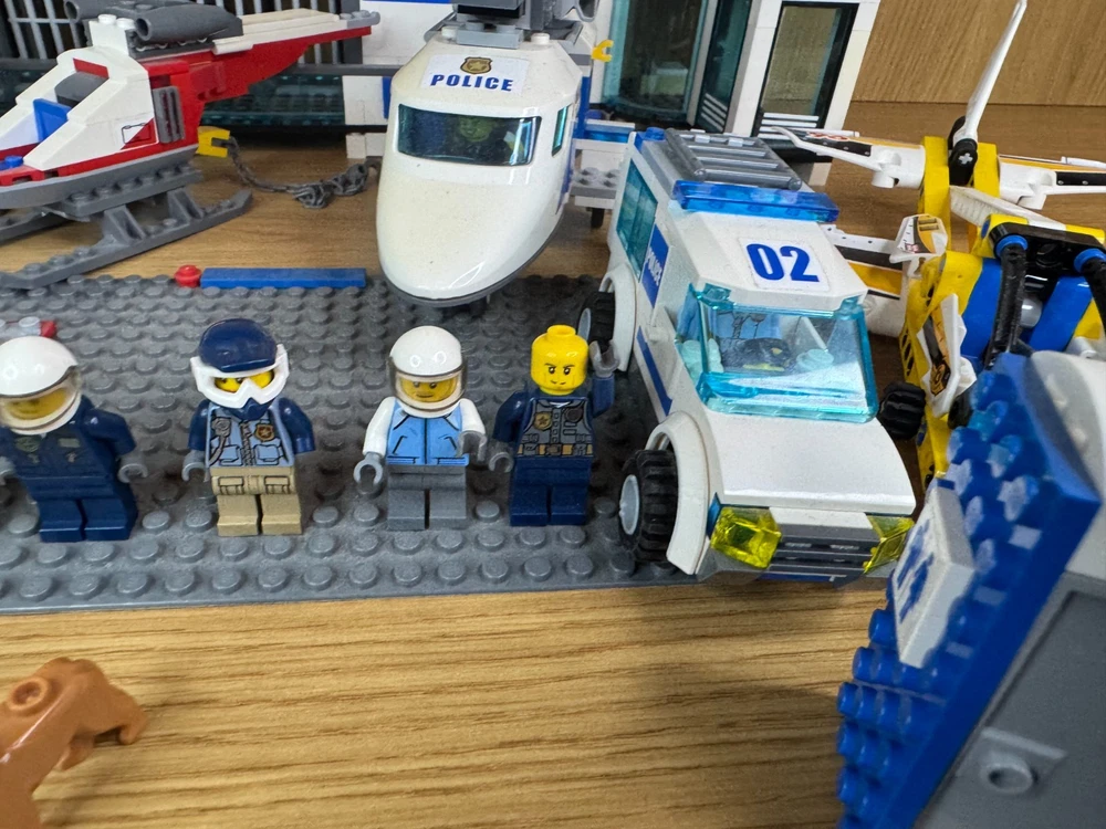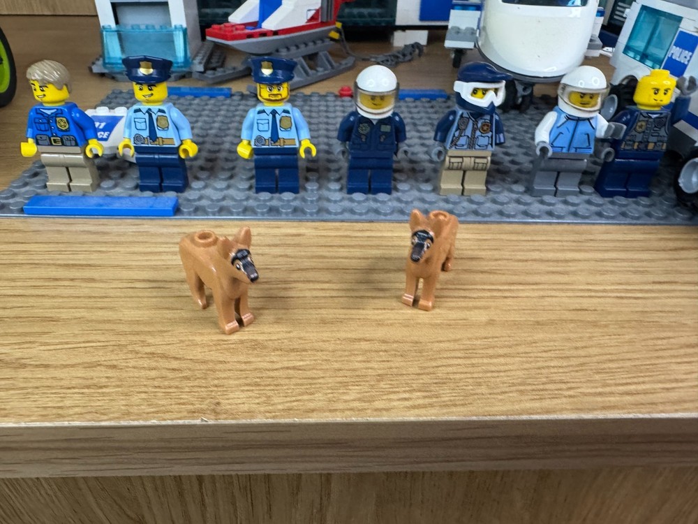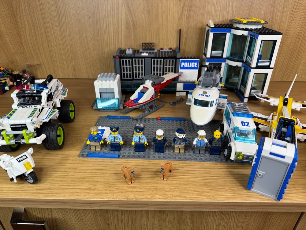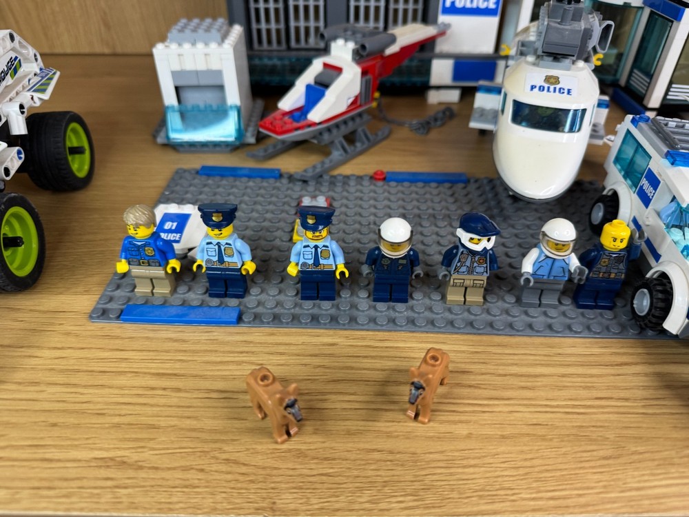 LEGO City Police Job Lot – Station, Helicopter, Plane, Vehicles, 7 Minifigures & 2 Dogs. A fantastic mixed LEGO City Police bundle – perfect for expanding your city layout or for imaginative play. Includes: Police station building Police helicopter Police plane Large police SUV Police van (02) Police quad bike & motorbike Portable jail / toilet unit 7 LEGO minifigures (police officers, pilots, criminals, etc.) 2 LEGO police dogs Extra accessories All pieces shown in the photos are included. Used but in good condition. May be missing some small parts compared to the original sets.