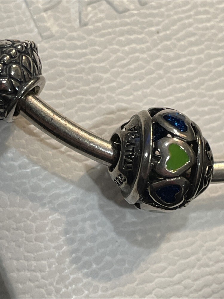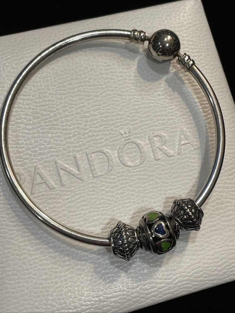 This is an authentic Pandora bracelet made of sterling silver, featuring a ball closure. It includes three sterling silver charms in a theme shape of hearts. The bracelet is hallmarked, and suitable for various occasions like engagements, weddings, birthdays, and more. It does not contain any stones and is not personalized. Comes in box Please look at photos, as this is the exact item that you will receive! Pictures are the best description and feel free to ask questions of items before bidding. Please note that vintage items were cherished by a previous owner, and may have been worn. I clean and polish item but remember vintage items are rarely in "mint/perfect" condition. Each vintage item is closely looked at before listed, and it is described as detailed as possible. Please refer to the item pictures to view more about their condition Note that coin or any photo props in the pictures are not included.