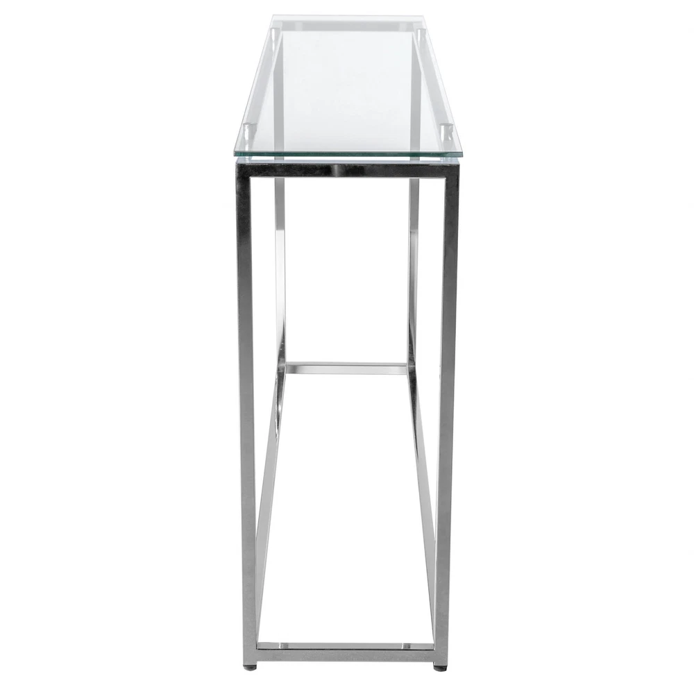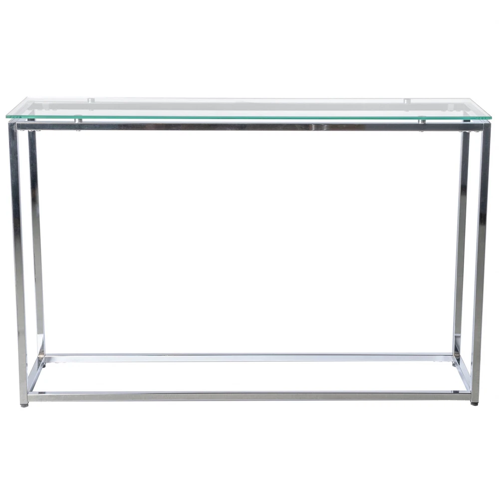 Add a touch of minimalist modern décor to any space in your home with this Geo XL Rectangle Clear Glass and Chrome Console Table. The frame of the table is made from steel and finished to a silver chrome color. The frame has two square pieces at the top and bottom which are connected to each other by four thin legs on all four corners. The simple modern frame holds a raised clear tempered glass tabletop which looks unique and updated as it hovers above the silver frame. The clear glass top shows the frame through it and serves as the perfect background for your decor pieces, lamps, and picture frames. You can use this side table in your entryway, office, behind your sofa, in your bedroom, or even in dining room as a bar or for serving in style. 30.32" H x 47.25" W x 11.82" D Free Shipping Over $49.99* Details Geo XL Rectangle Clear Glass and Chrome Console Table Product Description: Add a touch of minimalist modern décor to any space in your home with this Geo XL Rectangle Clear Glass and Chrome Console Table. The frame of the table is made from steel and finished to a silver chrome color. The frame has two square pieces at the top and bottom which are connected to each other by four thin legs on all four corners. The simple modern frame holds a raised clear tempered glass tabletop which looks unique and updated as it hovers above the silver frame. The clear glass top shows the frame through it and serves as the perfect background for your decor pieces, lamps, and picture frames. You can use this side table in your entryway, office, behind your sofa, in your bedroom, or even in dining room as a bar or for serving in style. 30.32" H x 47.25" W x 11.82" D
