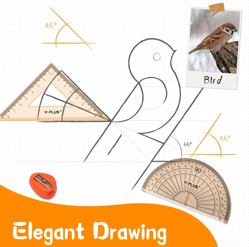 Package Includes: 1 Ruler (6 inches), 1 Set Square (30°/60°), 1 Set Square (45°), 1 Metal Protractor, 1 Mechanical Pencil (0.5 mm), 1 Pack of 0.5 mm Pencil Lead, 1 Eraser, 1 Manual Pencil Sharpener, 1 Compass, 1 Pencil for Compass The set also includes a math card that contains most of the important mathematical formulas for quick reference. It helps students and adults remember these formulas more easily It serves as an excellent Geometry Set for teachers and students, suitable for use in school, office, home, or on the go. This comprehensive tool set is perfect for students, teachers, math experts, architects, engineers, artists, and designers at any level The set comes in a specially designed iron box, providing convenient storage and easy portability. It helps reduce clutter in daily work and students' study areas. The cute design will make math more enjoyable for kids This tool set is a great choice for both teachers and students. It also makes a perfect gift for family and friends, whether as a school season gift or a Christmas gift. Suitable for children aged 6 and up Product Description You Don't Need Too Many Items This Set will Meet All Your Needs Measure Set: Ruler (6 inches) *1, Set Square (30°/60°) *1 , Set Square (45°) *1, Compass *1 Protractor Set: Metal Protractor *1, Accessories for Protractor * 1 Writing Set: Mechanical Pencil (0.5 mm) *1 , 0.5 mm Pencil Lead * 1, Eraser * 1, Manual Pencil Sharpener * 1 Math Card *1 The Real High-level Geometry Set for Students Artists Teachers Architects Designers The Iron Case Settles Everything It serves as an excellent Geometry Set for teachers and students, suitable for use in school, office, home, or on the go. The video showcases the product in use. The video guides you through product setup. The video compares multiple products. The video shows the product being unpacked.