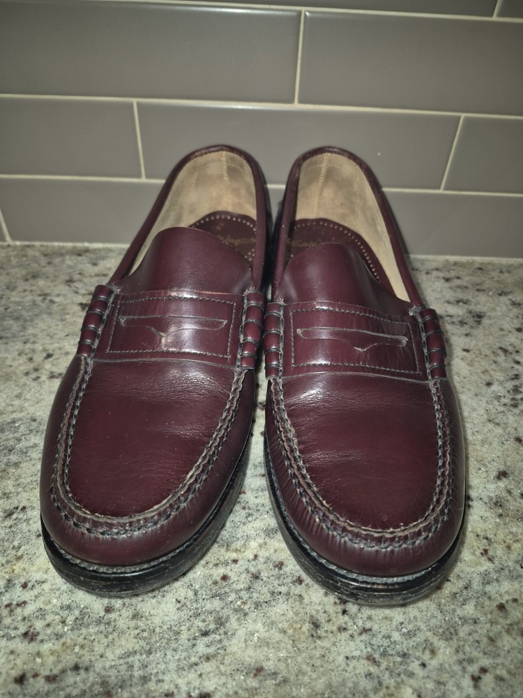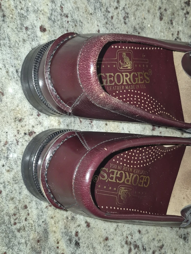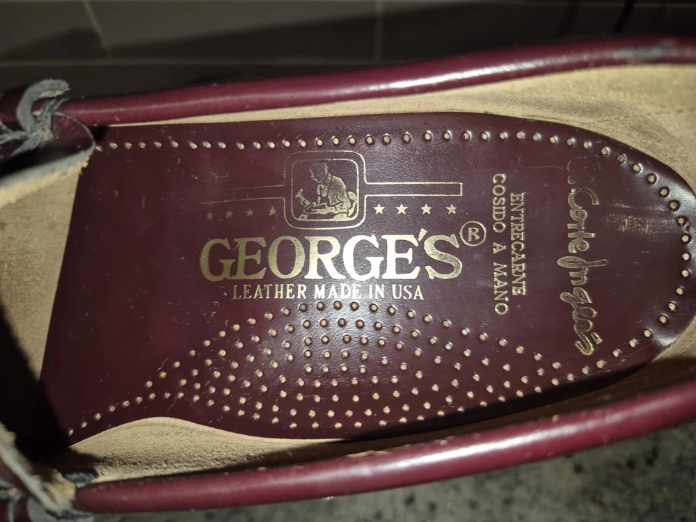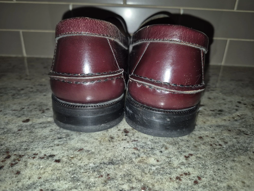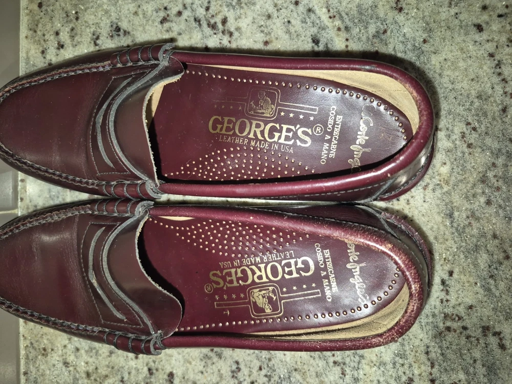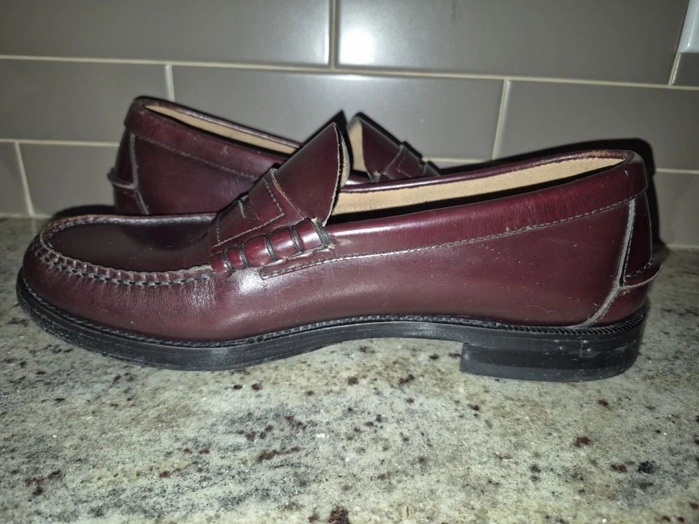 These classic George’s penny loafers are crafted from rich burgundy (Burdeos) leather and handmade in the USA. They feature hand-stitched detailing and full leather construction, combining timeless style with high-quality craftsmanship. Size is men’s 7. Overall in good pre-owned condition with normal signs of wear — light scuffing and some wear around the top heel rim (see photos). A great pair of elegant, well-made loafers with lots of life left.