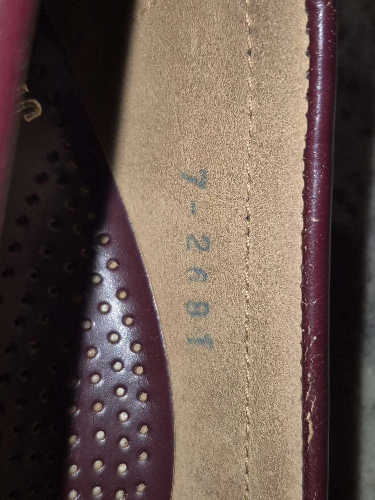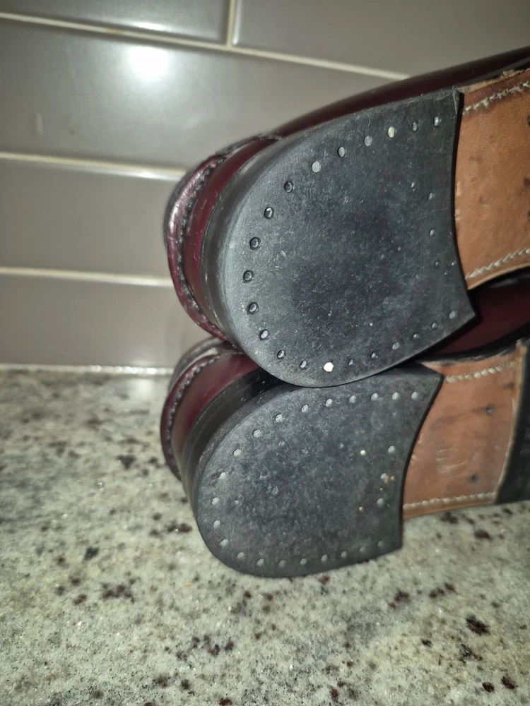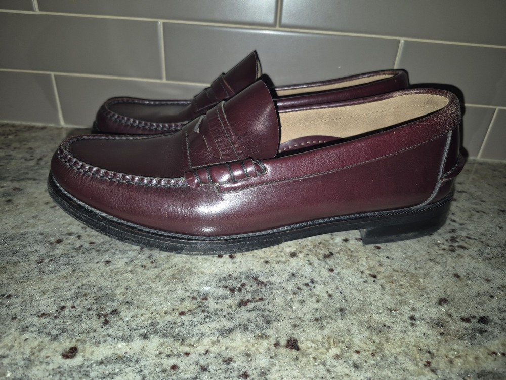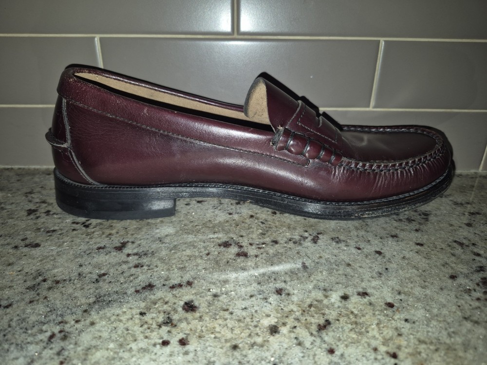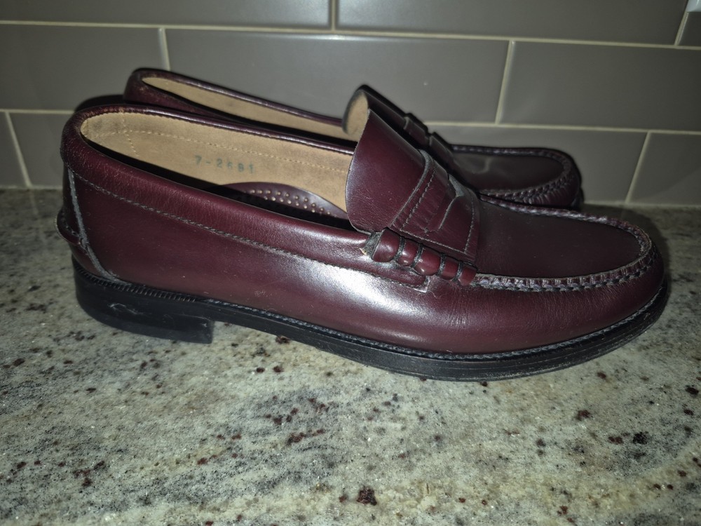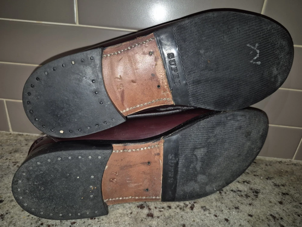 These classic George’s penny loafers are crafted from rich burgundy (Burdeos) leather and handmade in the USA. They feature hand-stitched detailing and full leather construction, combining timeless style with high-quality craftsmanship. Size is men’s 7. Overall in good pre-owned condition with normal signs of wear — light scuffing and some wear around the top heel rim (see photos). A great pair of elegant, well-made loafers with lots of life left.