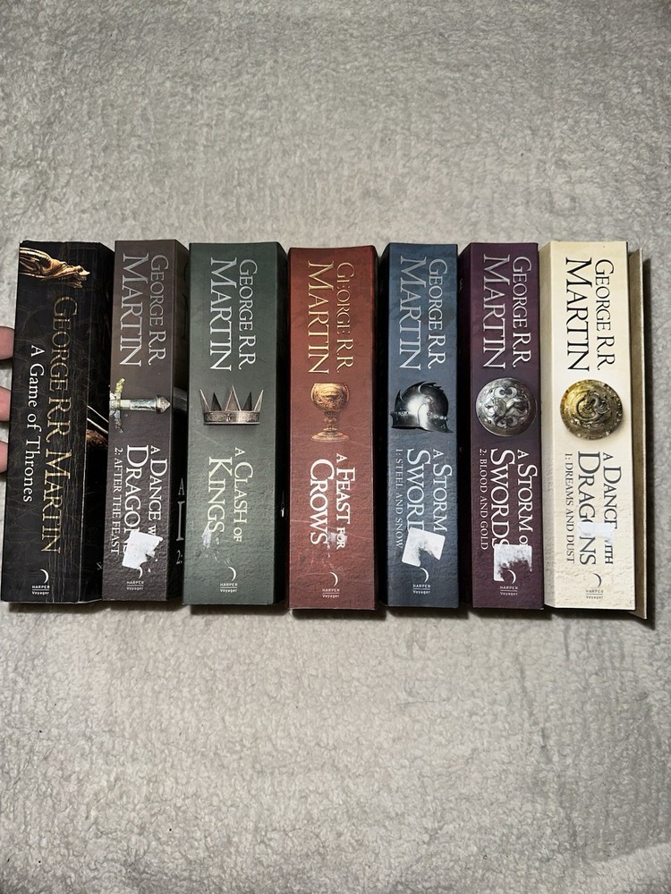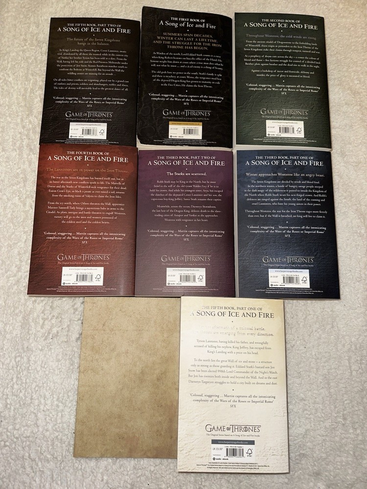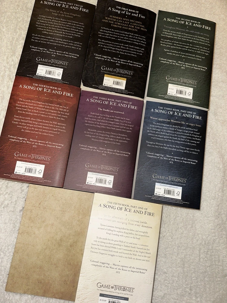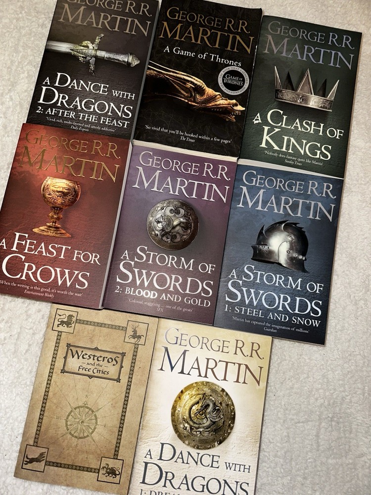 Immerse yourself in the fantastical world of George R.R. Martin with this book bundle, featuring seven novels from the popular Game of Thrones series. Delve into the action-packed and adventure-filled narratives, perfect for young adults and adults alike. Published by HarperVoyager in English, these standard editions are a must-have for fans of fantasy and science fiction. With captivating storytelling and a talented author, this collection is sure to transport you to a world of intrigue and heroism. NOTE : I label most if not all my bundles as ‘ACCEPTABLE’, this is purely because everyone’s expectations can vary. So you’ll likely receive in most if not all cases ‘GOOD’ condition. * Please follow me as a seller to get coupons and updates on future My full range includes clothing, dvds, and toys within my store.. many with bulk discount offers… PS.. I have lots of bundles available from mixed authors and genres. * If you need anything please don’t hesitate to get in touch. Thank you as always for your business and support.