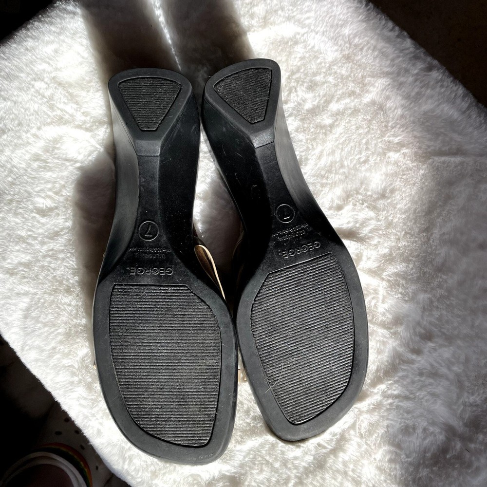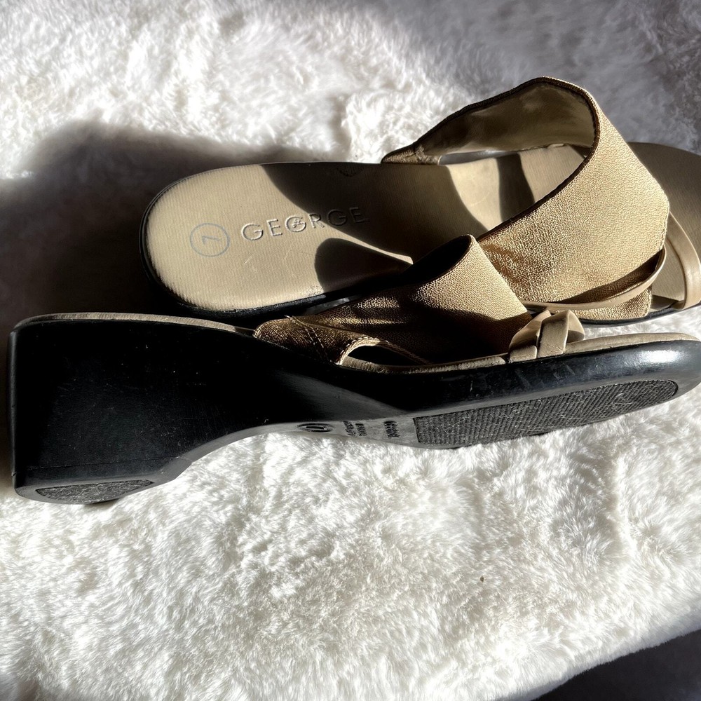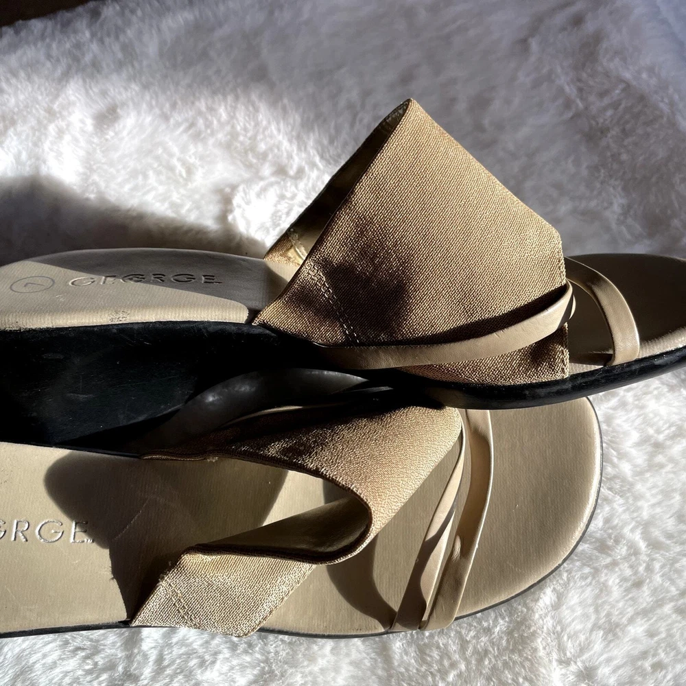 George Size 7 Gold Sandal with 2.5" heel block flaws see pictures There is a dark but faint spot on the cloth part of the shoe as shown in picture, Slight scuff on the back of the heel and slight markings on foot pad see pictures. 1452 2 lbs $10