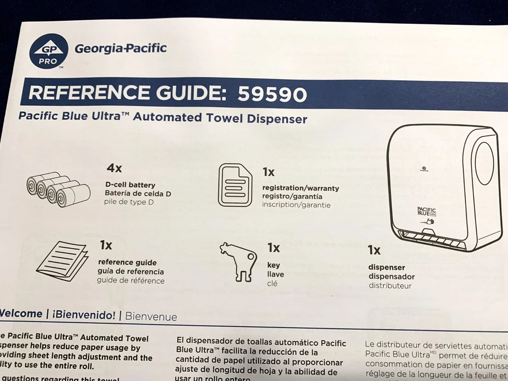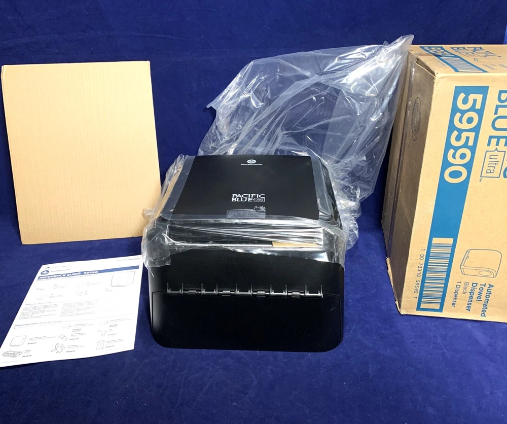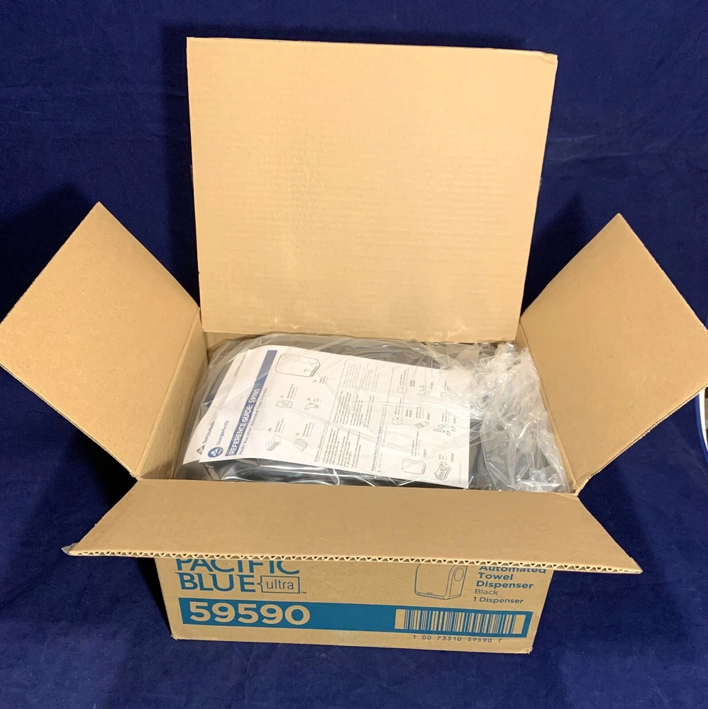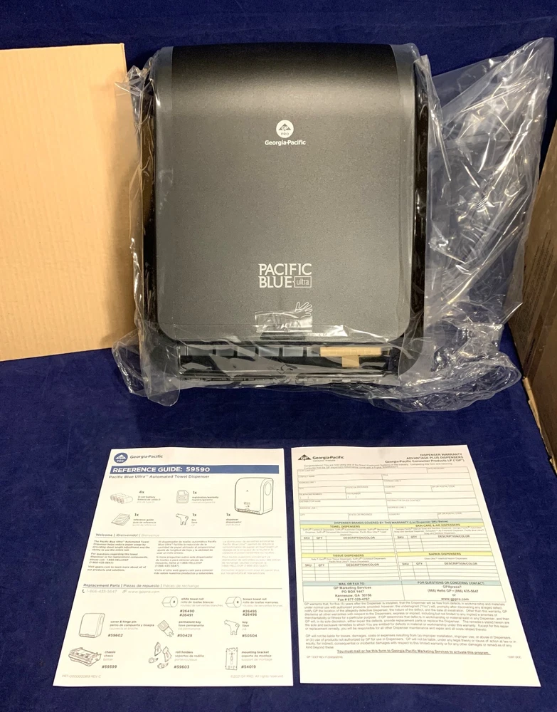 Georgia-Pacific Blue Automated Paper Towel Dispenser #59590 New Open Box. Complete Contents. Please review the photos for the contents listed by the company. Each are shown in new condition as packaged. These units were originally listed as New In Box, unopened. Unfortunately, someone decided to take advantage of that claiming all the parts (except the paperwork) were missing. Even sent back their used unit. I just wanted to insure you knew you were not wasting your time with false promises. I will open and photograph each unit and then reseal it. Thank you for looking and should you have any questions, I'd be happy to help.