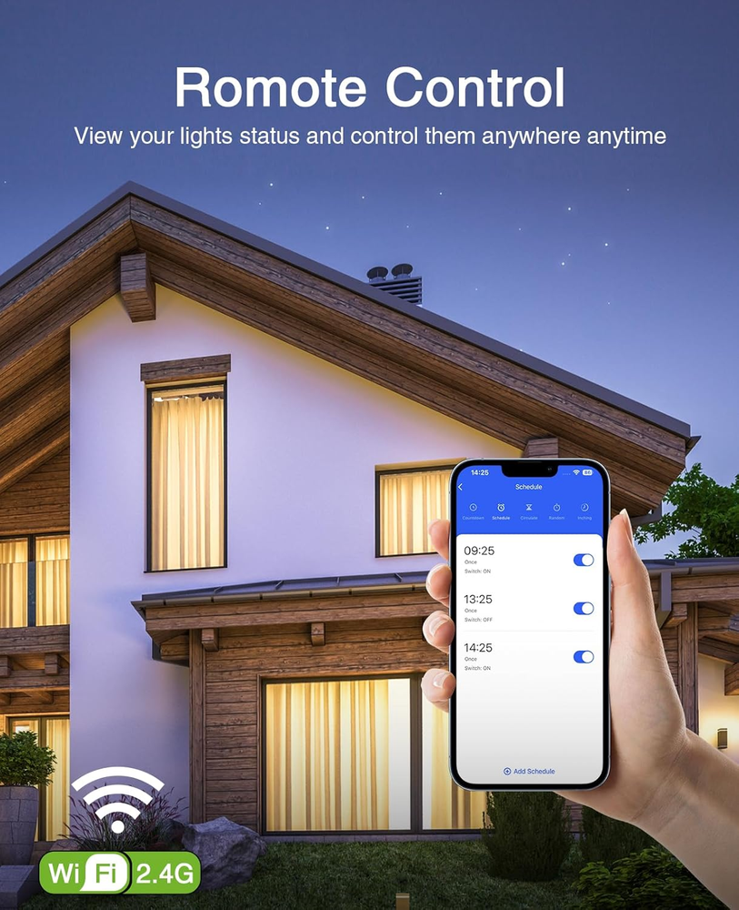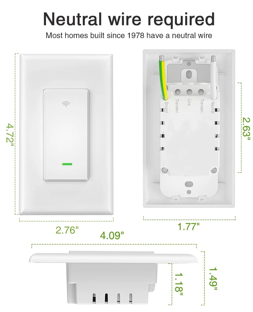 Store New Arrivals Add to Favorite View Feedback Ghome Smart Switch, 3 Way Light Wi-Fi Switch Compatible with Alexa and Google Home, 2.4Ghz Schedule Timer, Neutral Wire Required, 3-Way Installation and No Hub Required, FCC Listed (2-Pack),White Description Item model number SW6-2 Item dimensions L x W x H 2.35 x 0.16 x 2.07 inches Current Rating 15 Amps Operating Voltage 120 Volts Product Dimensions 2.35 x 0.16 x 2.07 inches; 10.55 ounces Circuit Type 3-way Country of Origin China Connector Type Plug In Style 2 Pack 3 Way Smart Switch Terminal Screw Operation Mode ON-OFF-ON Actuator Type Flat Mounting Type Wall Mount Specification Met UL Contact Type Normally Open Brand GHome Smart Switch Type Push Button Material Plastic Manufacturer GHome Smart 【Easy to Install】Not a dimmer, Neutral wire required, 2.4GHz Wi-Fi connection only (Not 5G WiFi); No Hub required. Input: 120V/60Hz, Output: 120V/60HZ, 15A Max. GHome Smart's 3 way switches are rated up to 1800W. Note: Not compatible with smart bulbs. 【Single-Pole or 3-Way】This smart switch 3 way can be installed for 3-way or single pole to control the light from 1 or 2 locations. You can replace one of your traditional 3 way switch or directly use two 3-way switches to control light from two locations. 【Smart Voice Control】This smart 3 way light switch works with Amazon Alexa and Google Assistant, so you can control your light using simple voice commands. Free hands by using WiFi light switch and enjoy the convenience moment. 【Time Schedule】Create automation for your lights to meet your daily schedules or default to sunrise/sunset. Set the porch lights to turn on 30 minutes after sunset and turn off 25 minutes before sunrise. 【APP Remote & Group Control】light up your house anywthere anytime. View the lighting status of all your rooms on the application and remotely control them. You can also manage multiple smart switches simultaneously. Product Description The video showcases the product in use. The video guides you through product setup. The video compares multiple products. The video shows the product being unpacked. 3 way smart switch Merchant Video Smart Voice Control Works with Amazon Alexa and Google Assistant, free hands by using simple voice commands. App Remote Control View the lighting status of rooms, and use the app to turn light on and off anywhere anytime. Group Control Tap the switch on the home page, then tap the edit icon in the upper-right corner to create a group. 1 Voice Control 2 APP Control 3 Group Control 1 In Bedroom 2 In Living Room 3 In Stairways 4 In Hallways 1 Schedules 2 Countdown 3 Random Timer 4 Cycle Timer 5 Inching 1 Sunrise/Sunset 2 Weather Scene 3 Wind Speed Scene 4 Humid Scene 5 Temp Scene No Hub Required GHome Smart Switch connects to your home 2.4 GHz WiFi easily. If your router supports both 5G and 2.4G, please switch to 2.4G and reconnect. Lighting status of the room No matter where you are, you can check the lighting status of all rooms and control them remotely when necessary. Status after power failure Since 2 switches controls the light, the state can't be set separately. The default is the memory function: restore to the states before power failure Indicator lights on and off Click the switch on the homepage to enter the custom interface, and then click on the settings in the bottom right corner to set the "indicate light" ABOUT US We offer the best prices around on high quality products. Our E-store includes media such as books, movies, music and games while offering electronics, toys, sporting apparel, clothing, tools, general home, garden items and more. SHIPPING We are always working hard to ensure your package arrives as soon as possible. Please understand that some factors like weather, high postal traffic, and the performance of shipping companies are outside of our control. We offer free shipping to the lower 48 states and ship within 2 business days of payment, usually sooner. We do not accept P.O. Boxes. Please provide a physical address. RETURNS We offer a 30-Day Return Policy on items which you are not completely satisfied with. You have the option for a full-refund or an exchange of the item. No returns are available on items shipped outside of the USA. PAYMENT We accept PayPal. CONTACT US This page content is yet to come Please ad us to your favorite seller and visit again later Thank You