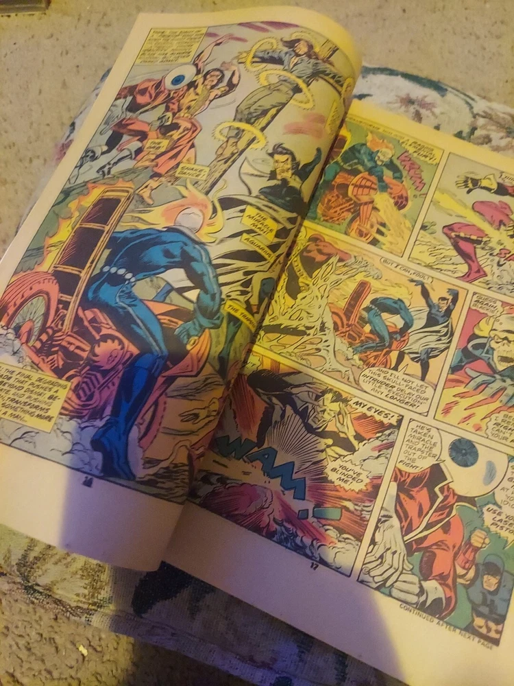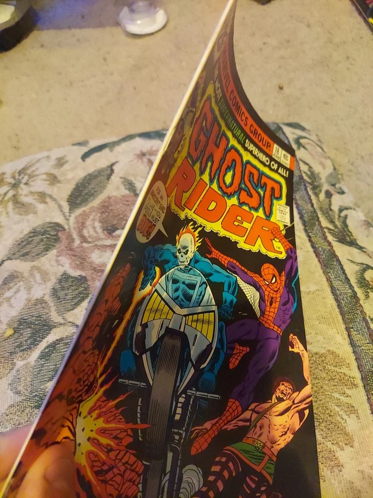 This is an amazing issue of Ghost Rider #18 from Marvel Comics, published in June 1976. It features an incredible creative team including Phil Rachelson, Frank Robbins, Vince Colletta, and Tony Isabella. The comic is a 25 cent variant and is part of the Bronze Age (1970-83) era of US Comics. The issue includes an exciting adventure with Challenger (Villain), The Trapster, The Black Widow (Natasha Romanov), Snake-Dance, Aquarius, Son of Satan (Damon Hellstrom), Hercules, Ghost Rider (Johnny Blaze), Stunt-Master, The Orb, Richard Pini, The Thing (Benjamin Grimm), The Angel (Warren Worthington III), Death-Stalker (As Death's-Head) (Villain), Wendy Pini, The Christ Figure, Spider-Man (Peter Parker), The Miracle Man, "Coot" Collier, Katy Milner, Iceman, and Black Widow (Natasha Romanoff). The cover art by sold as is