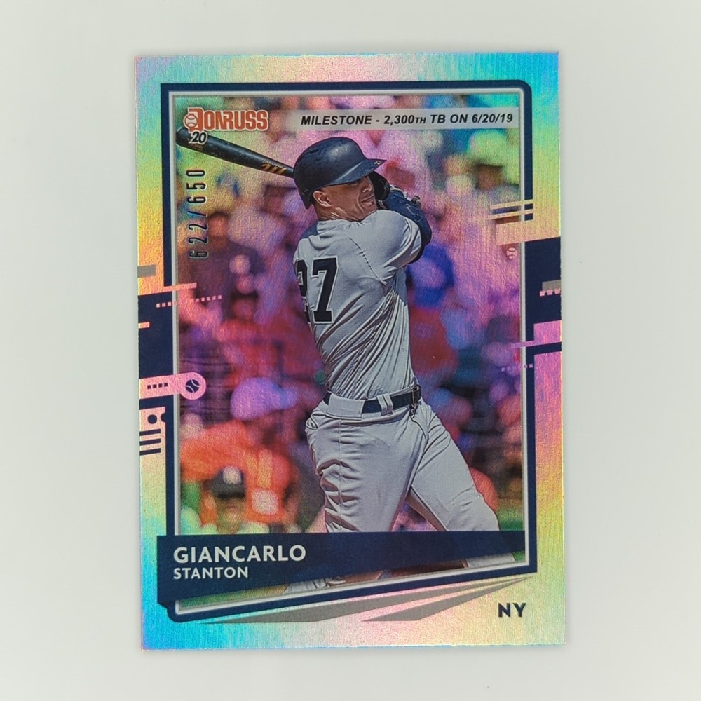 This Giancarlo Stanton trading card lot includes two cards from the 2020 Panini Donruss Baseball and 2022 Topps Chrome Update sets. The cards are parallel and feature Stanton in his New York Yankees uniform. One card is an AS Refractor insert and the other is a Silver Milestones parallel, both with a limited edition of only 650 copies. These cards are perfect for any Major League Baseball fan or trading card collector, especially those who admire Giancarlo Stanton's talent and achievements. Don't miss the opportunity to add these rare and valuable cards to your collection.