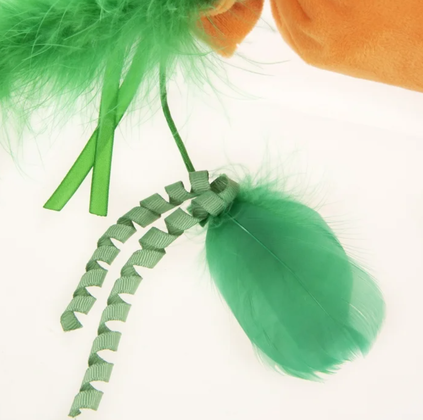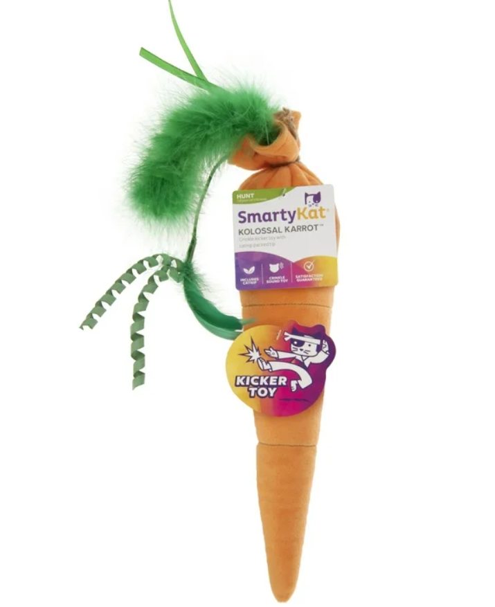 This giant carrot plush crinkle and catnip cat kicker toy features light, airy feathers, long dangling ribbons, crinkle material, and soft plush. The crinkle sound excites cats and mimics the noise of prey rustling in bushes, satisfying their natural hunting instincts in a gentle way. Kicker toys tap into one of a cat’s earliest forms of play—wrestling and kicking like they do with their littermates—making this oversized toy a perfect companion for both play and snuggles. It’s filled with pure, potent catnip that most cats react to with a burst of playful energy followed by a calm, mellow phase. These toys are made to meet child safety standards and are backed by a commitment to satisfaction. Kicker & Wrestle: Cone-shaped kicker toy offers the perfect shape for cats to kick, wrestle, and play Hunting Cat Toys: Designed to satisfy your cat’s natural hunting instincts with a gentle form of "prey" Activate Play: Multi-textured design features soft plush, crinkle, jute, catnip, dangling feathers, and ribbons to mimic the feel of real prey Tested for Safety: Made to meet child safety standards, with no small parts, long cords, or potential hazards—safe for both pets and kids in the home About Us: These stylish cat products are thoughtfully created to support your cat’s emotional, physical, and instinctual needs, while strengthening the bond between pet and owner