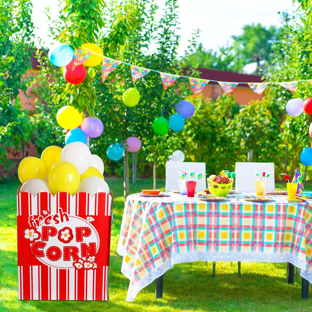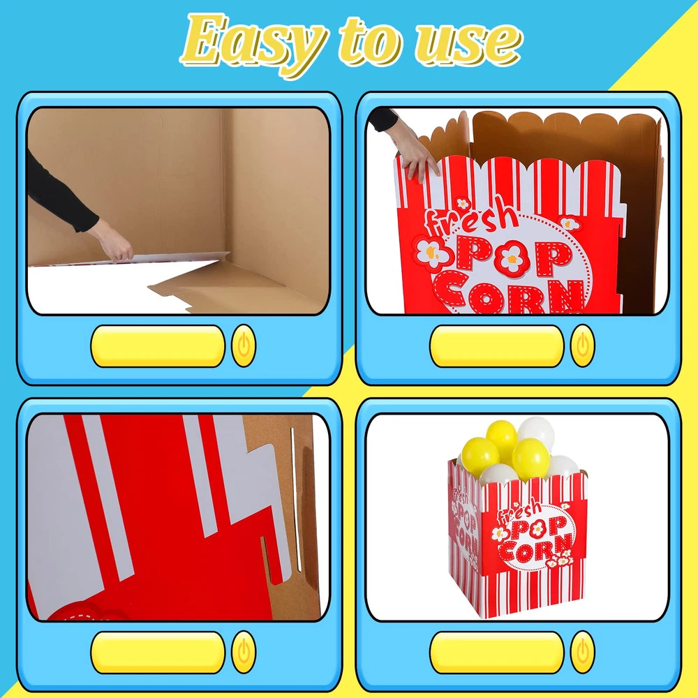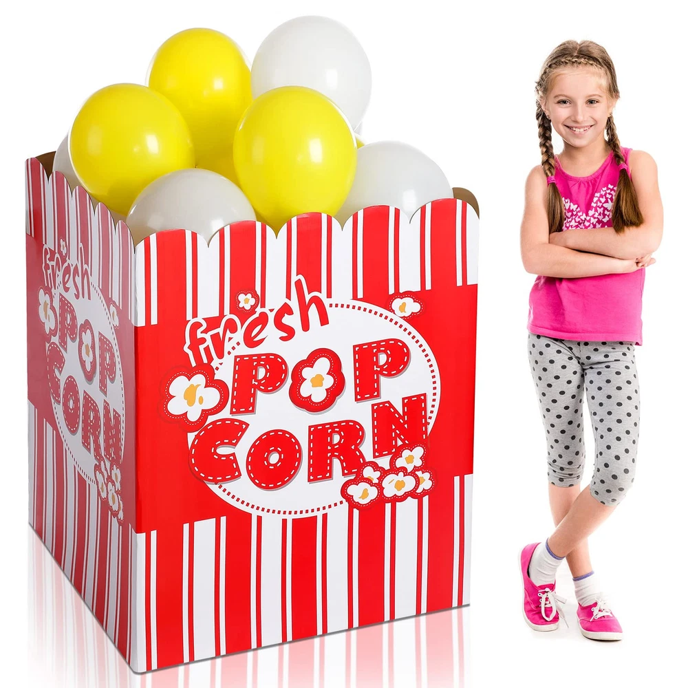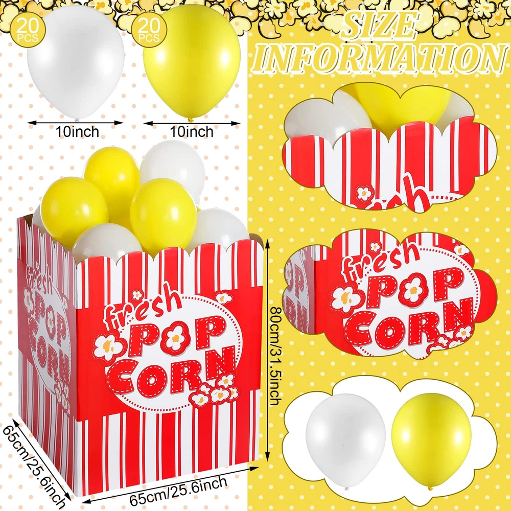 Package Content: you will receive a popcorn balloon box, 20 white balloons and 20 yellow balloons, an exquisite combination for you to meet various needs of decoration, you could also send them as gifts to other people Large size: the size of the balloon box is about 80 x 65 x 65 cm/31.5 x 25.6 x 25.6 inches; They are large enough to be a charming decoration for some occasions, but they are folded, so you need to install them before using the box; Please note: at each interface, the bayonet and its corresponding reserved opening need to be spliced to ensure the normal use of the product; If the connection is not too tight, additional hot melt adhesive or tape needs to be added for fixation 3D Style: the large party props adopt 3D stand up design and it looks like a very large popcorn box with popcorn, a nice decor for movie night, carnival, party and more, creating a funny and interesting atmosphere for you Photo Prop: the vivid design and bright color of popcorn decorations are suitable as a photo prop, no matter if you wear a shirt or dress, it will easily match your clothes, making your photo distinct and charming, both children and adults will love it Wide Application: the popcorn box can be widely adopted on many different occasions such as Children's birthday parties, schools, corporate events, incentive programs, fairs, festivals, parties and more, it will help to drive the scene atmosphere