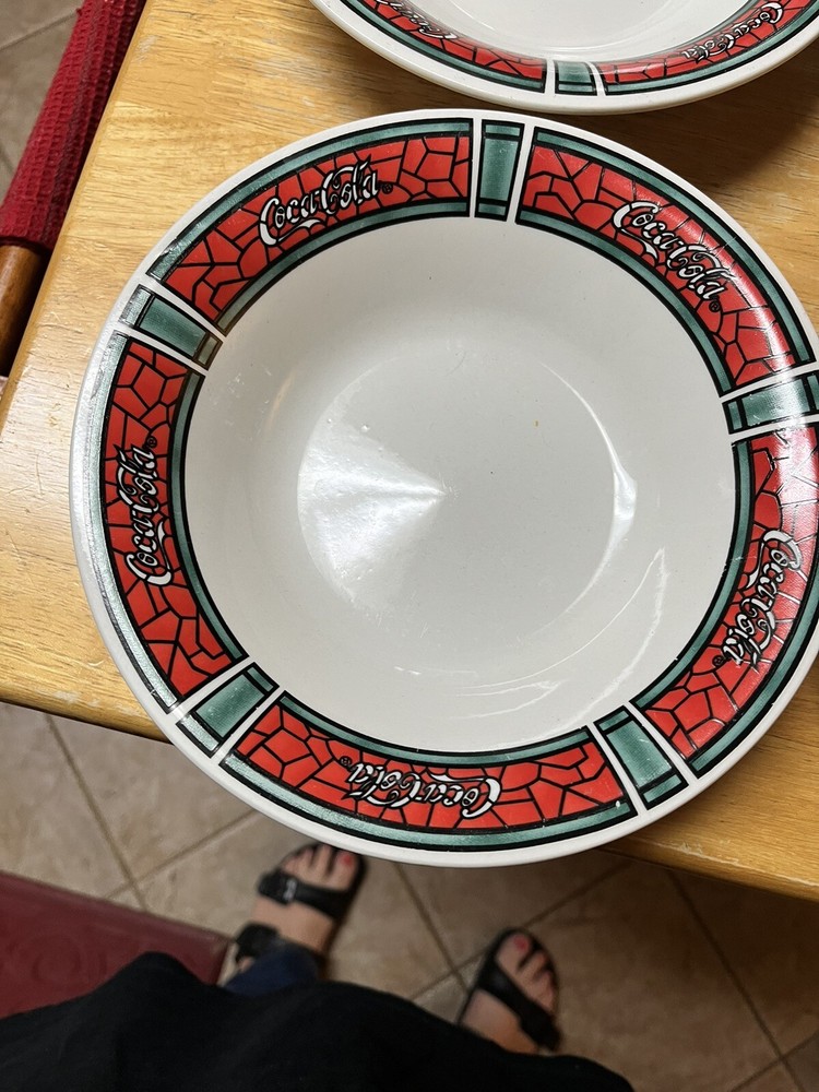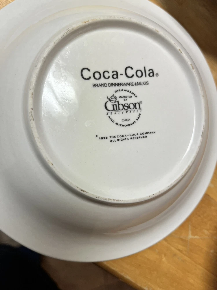 Add a touch of vintage charm to your dining table with this set of six Gibson Designs Coca Cola Traditions soup/cereal bowls. These round bowls feature a beautiful stained glass pattern in a glossy finish, making them perfect for all occasions. The set includes one piece of porcelain, stoneware, and ceramic, and is microwave safe for easy use. The bowls are part of the late 20th-century art pottery style, with an antique look that is sure to impress. They are printed with the Gibson Designs backstamp and are an original production line. The set is perfect for collectors and is a great addition to your decorative cookware, dinnerware, and serveware collection.