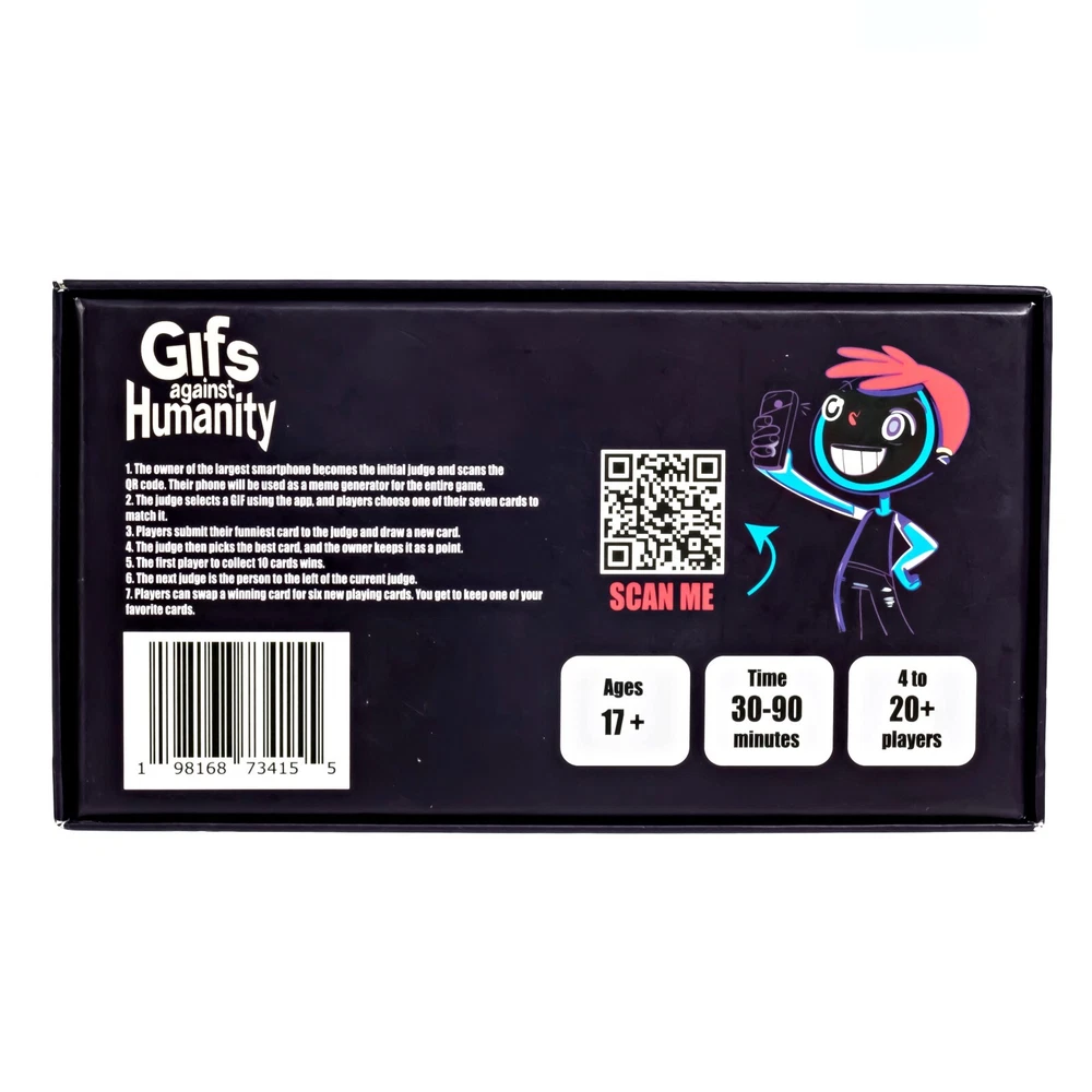 500 hilarious cards come in the box. Once you have the game, scan the QR code and start playing! 100+ classic gifs were chosen to fit perfectly with 500 Cards. Limited Product, Not Affiliated with Cards Against Humanity or Its Creators. Instructions Gif Showdown is a card game. The person with the largest smartphone is the first judge and must scan the QR code on the box. the judge picks a gif meme and all others must pick a card from their hand of 7. Players give the judge their best card to match the gif and collect a new card. The judge picks the winning card. The winner keeps their winning card. Collect 10 cards to win. The person to the left of the judge is the next judge. Have fun!