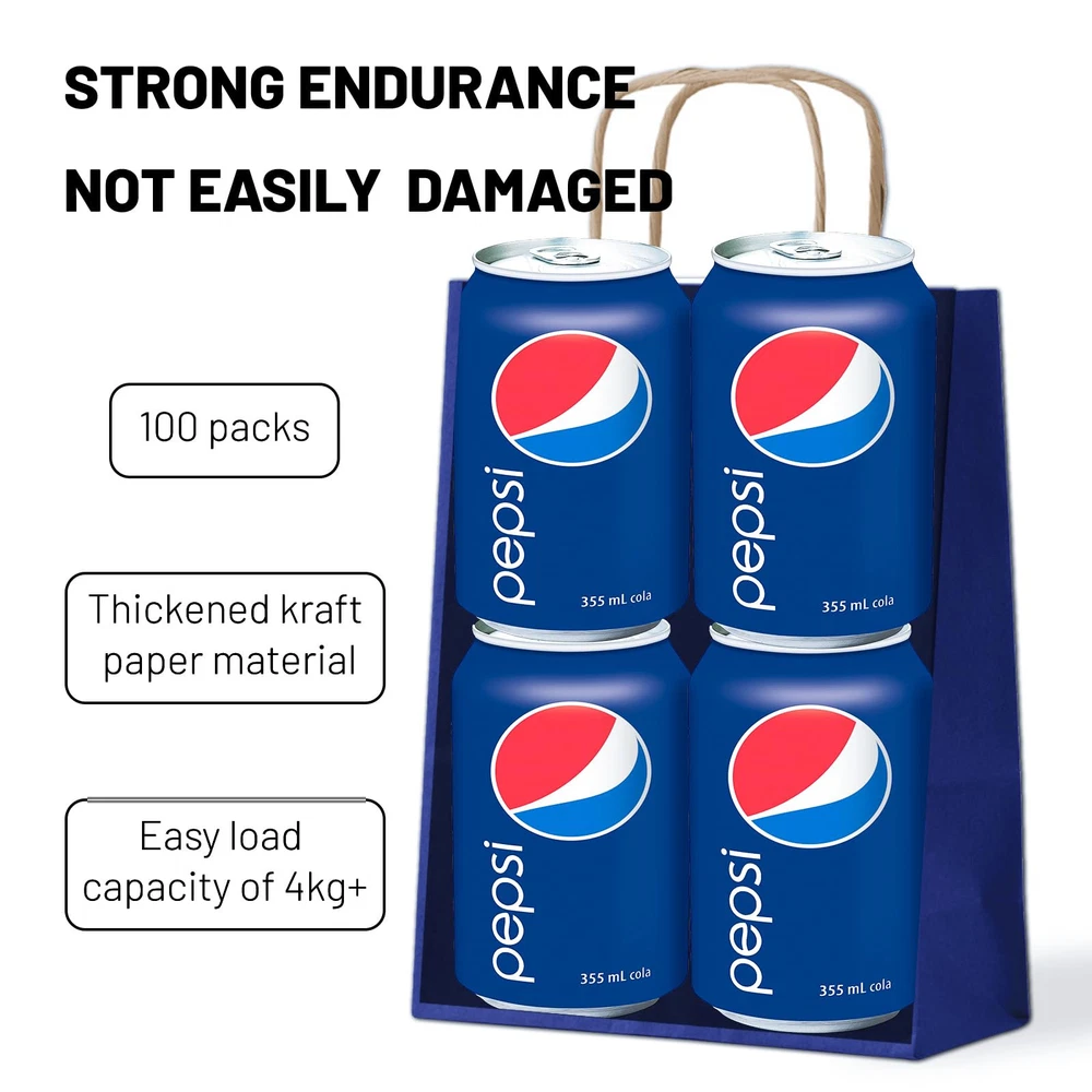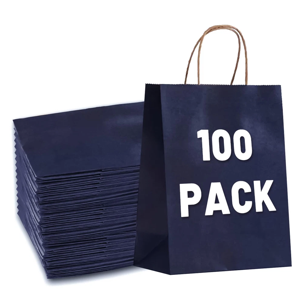 GREAT VALUE GIFT BAGS: These gift bags are made up of 100 pieces measuring 8.25" x 5.9" x 3.15" with handles made of high quality, sturdy paper material such as kraft or recycled paper. The handles are reinforced with two repeated coats of glue for added strength and durability and can carry a lot of weight without tearing. ECO-FRIENDLY CHOICE: These navy blue gift bags with handles are made from recycled materials and sustainable resources, they are biodegradable, recyclable, non-toxic and odorless,non-polluting, making them a great choice for environmentally conscious individuals. Using these bags instead of traditional plastic bags helps to reduce waste and promote sustainability. CONVENIENT GIFT BAGS: Handles provide an easy and comfortable way to carry packaging, and are often long enough to fit comfortably in the hand, whether it's for groceries, retail purchases or promotional items. Sturdy construction and ease of use make them a practical and stylish choice for packaging needs. DIY DECORATION: This gift bags are not printed with crafts, use your imagination and unleash your creativity to personalize them in any way you like. They can be decorated with ribbons, bows and other decorations to add a festive touch or personalized message. Additionally, they can be imprinted with logos or brand names, making them a great choice for businesses looking to enhance their brand image or enhance their customer experience. MULTIFUNCTIONALITY: This gift bags you can use them to hold a variety of small to medium crafts or light artwork, they are also ideal for fairs and farmers markets. In addition, they can be perfectly used for takeout orders or as shopping bags for customers without fear of damage. Also suitable for Christmas bags, Valentine's Day gift bags, shopping bags, holiday gift bags, party gift bags, retail bags, merchandise bags, wedding welcome bags.
